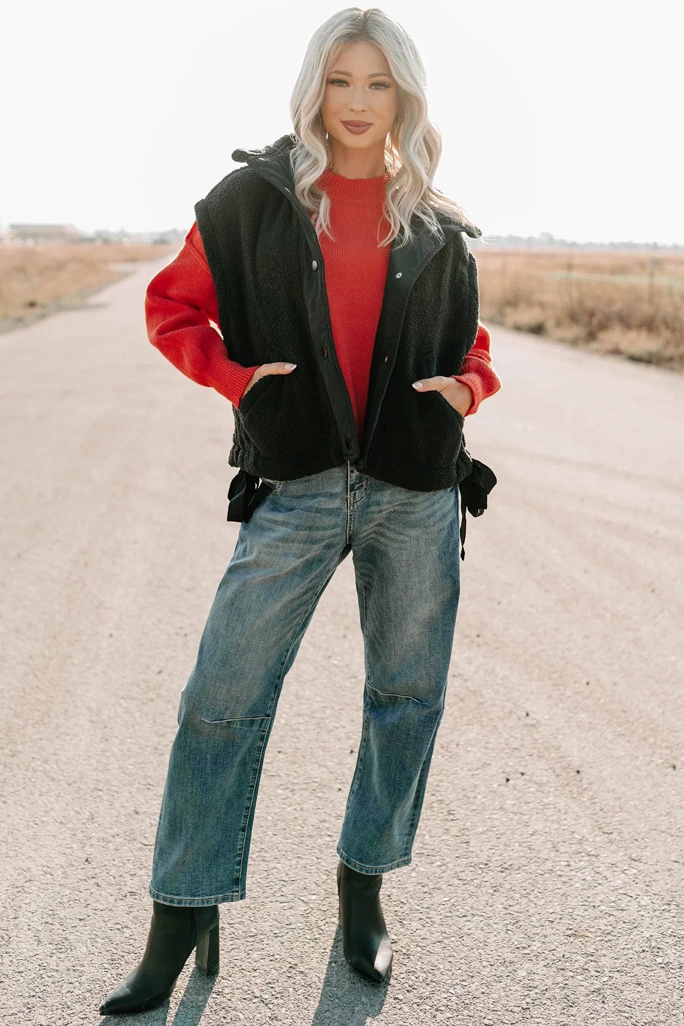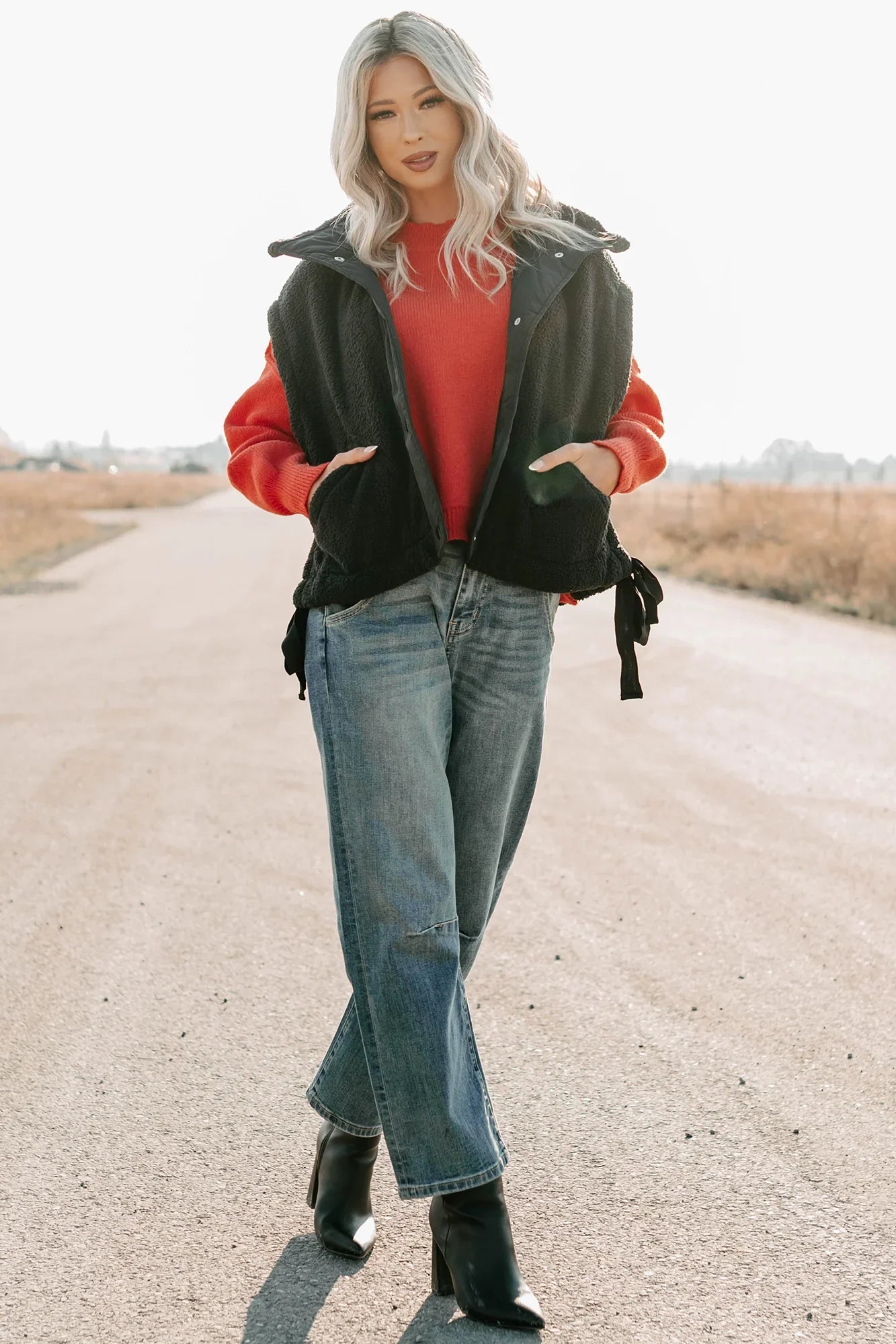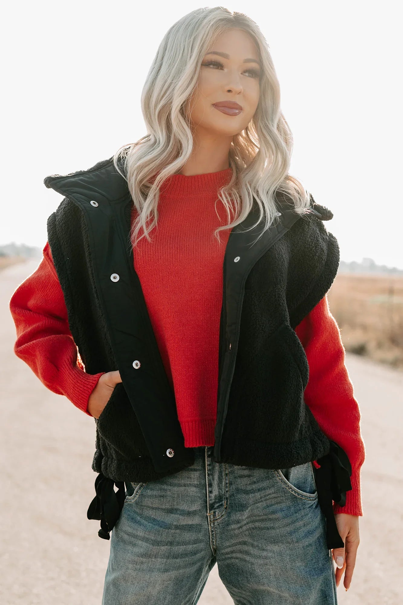 Description Model Wearing Size Small Color: Black Fleece Material Sleeveless High/Mock Neck Button-Up Front Side Tie Details Front Pockets Material Has Some Stretch 8" Armpit To Hemline 100% Polyester For Model Size Specs, Please Check Size Charts