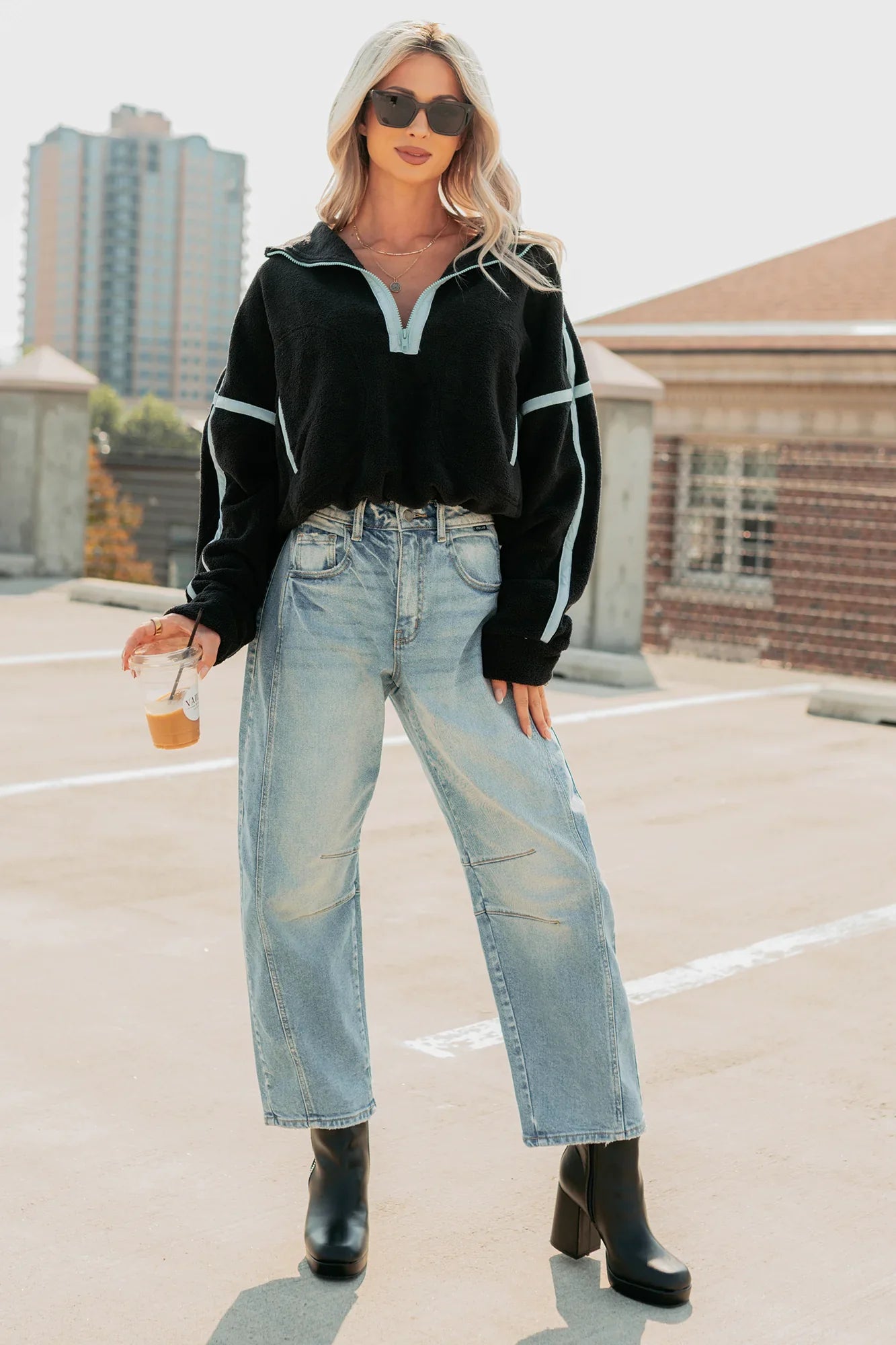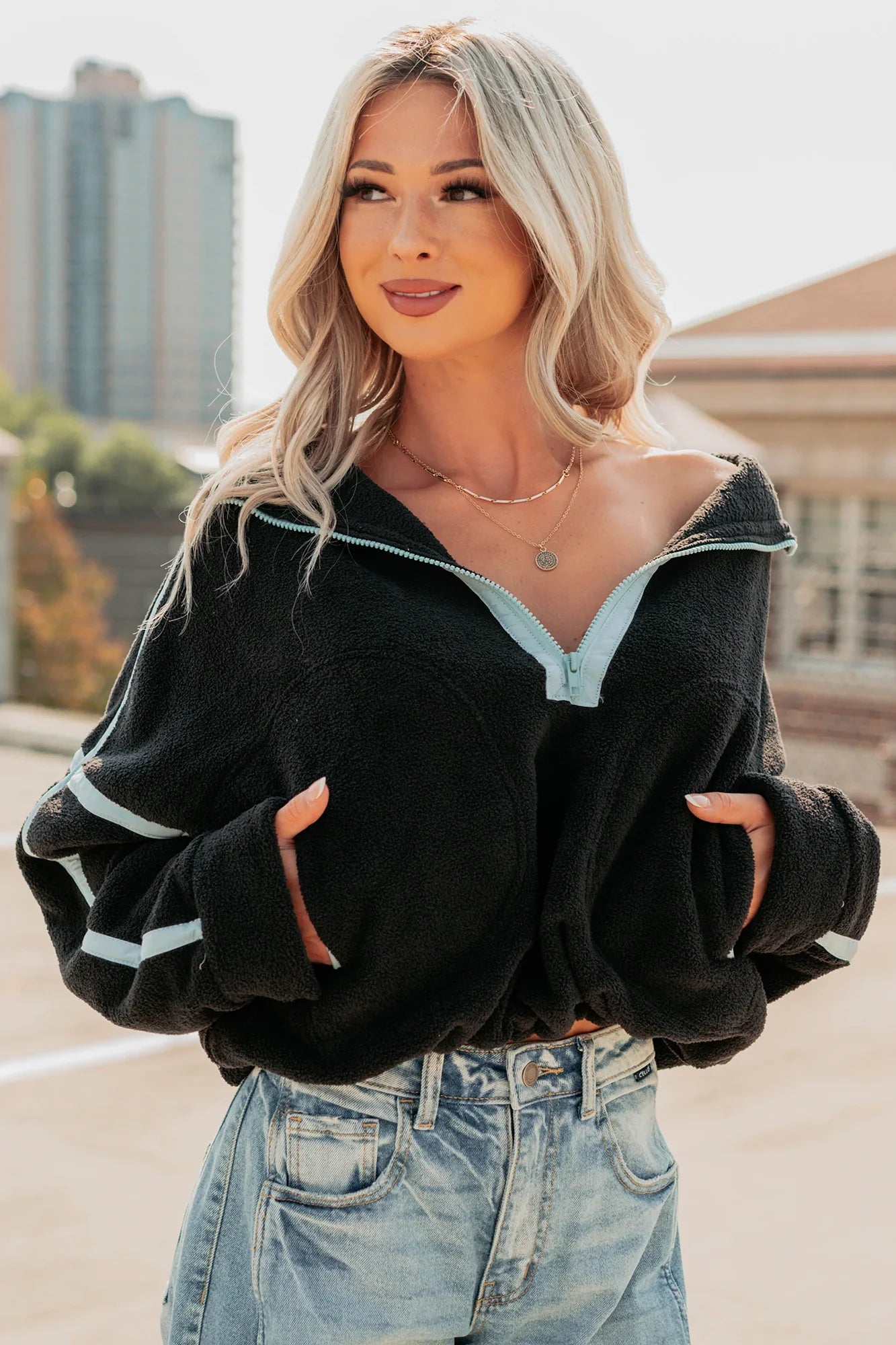 Description Model Wearing Size Small Color: Black, Light Blue Fleece Material Contrast Seam Details High/Mock Neckline Half-Zip Front Long Sleeves Side Pockets Drawstring Hemline Material Has Little Stretch 18" Armpit To Sleeve End 9" Armpit To Hemline 100% Polyester For Model Size Specs, Please Check Size Charts