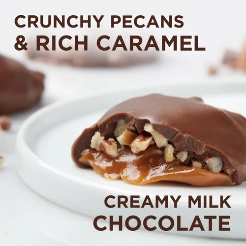 A delightful combination of roasted pecans smothered in a rich buttery caramel then covered in smooth milk chocolate candy coating. The perfect size for backpacks briefcases and bags. Package designs may vary.