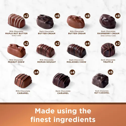 DARK CHOCOLATE {SUGAR, CHOCOLATE PROCESSED WITH ALKALI, COCOA BUTTER, MILK FAT, SOY LECITHIN (EMULSIFIER), VANILLIN (ARTIFICIAL FLAVOR)}, SUGAR, MILK CHOCOLATE {SUGAR, WHOLE MILK, COCOA BUTTER, CHOCOLATE, SOY LECITHIN (EMULSIFIER), VANILLIN (ARTIFICIAL FLAVOR)}, CORN SYRUP, CONDENSED MILK, CREAM, PEANUTS, INVERT SUGAR, BROWN SUGAR, PALM KERNEL OIL, ALMONDS, COCONUT WITH SODIUM METABISULFITE (PRESERVES WHITENESS), MOLASSES, COCOA POWDER, SALT, SORBITOL, BUTTER, WALNUTS, DRIED EGG WHITES, WHITE CHOCOLATE {SUGAR, COCOA BUTTER, WHOLE MILK, SOY LECITHIN (EMULSIFIER), ARTIFICIAL FLAVOR, SALT}, TART CHERRIES, RASPBERRIES, HONEY, NATURAL AND ARTIFICIAL FLAVORS, INVERTASE (ENZYME), ARTIFICIAL CHERRY FLAVOR, SOY LECITHIN (EMULSIFIER), STRAWBERRIES, ORANGE PEEL (ORANGE PEEL, WATER, CITRIC ACID), TAPIOCA STARCH, NATURAL AND ARTIFICIAL RASPBERRY FLAVOR, NATURAL MAPLE FLAVOR, FD&C COLORS (RED 40, BLUE 1 & 2, YELLOW 5 & 6), MAPLE SUGAR, CITRIC ACID, CARAMEL COLOR, POTASSIUM SORBATE AND SODIUM BENZOATE (PRESERVATIVES), SOYBEAN OIL, MIXED TOCOPHEROLS (ANTIOXIDANT), CARMINE COLOR, MALTODEXTRIN, SODIUM HYDROXIDE, WHOLE MILK, NONFAT MILK SOLIDS, MONO AND DIGLYCERIDES WITH CITRIC ACID (ANTIOXIDANT), SPICE, LEMON PEEL, EVAPORATED MILK (MILK, DIPOTASSIUM PHOSPHATE, CARRAGEENAN, VITAMIN D3), PECANS, APRICOTS WITH SULFUR DIOXIDE (PRESERVES COLOR), PEANUT WAFERS {SUGAR, PALM KERNEL OIL, PARTIALLY DEFATTED PEANUT FLOUR, NONFAT DRY MILK POWDER, PEANUT OIL, SOY LECITHIN (EMULSIFER), SALT}, PEANUT BUTTER (DRY ROASTED PEANUTS, HYDROGENATED COTTONSEED/RAPESEED OIL, SOY OIL, SALT) AND TARTARIC ACID