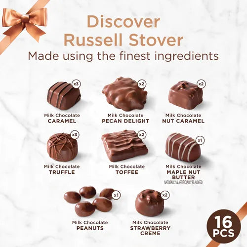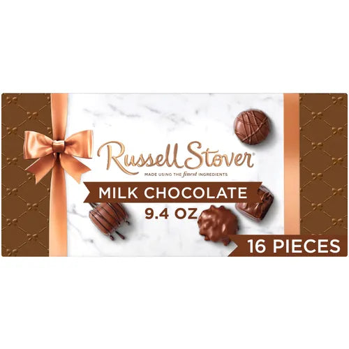 This 9.4-ounce assorted milk chocolate candy box contains a variety of pieces handcrafted with fillings such as caramel truffle toffee and pecan delight. Russell Stover candies are generously covered with chocolate and each piece is an American classic.