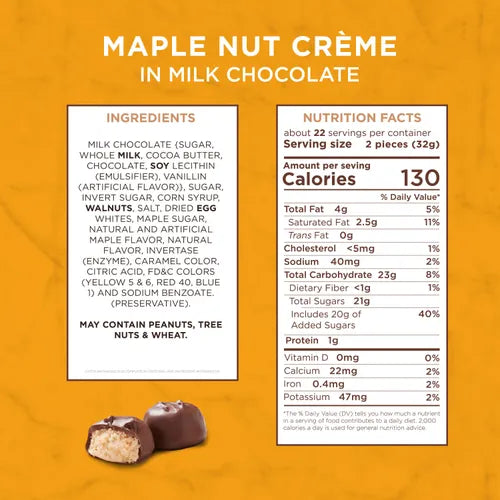 Delight in the rich, nostalgic flavor of Milk Chocolate Maple Nut Crémes, now available in a value-sized 24 oz. bag. Each decadent piece features a smooth, creamy maple-flavored crème center blended with crunchy roasted nuts, all enrobed in silky milk chocolate.