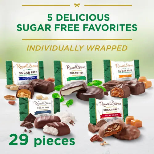 Now made with Stevia Extract! Enjoy this delicious five flavor assortment of individually wrapped sugar free chocolates. Providing all the mouthwatering experience that will satisfy any chocolate craving.
