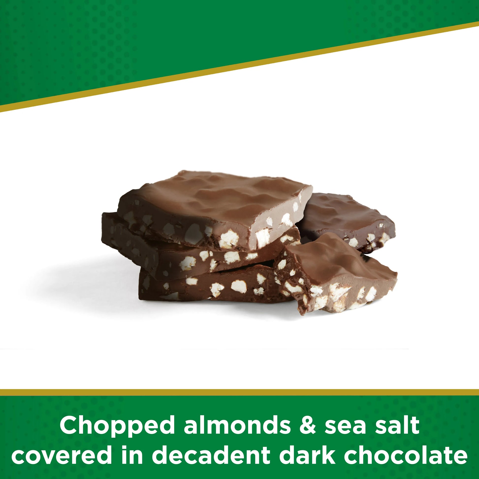Chopped almonds are mixed with crunchy sea salt and covered in delicious dark chocolate sweetened with stevia extract to give a guilt-free boost, when you just need to take a moment out of your busy day.