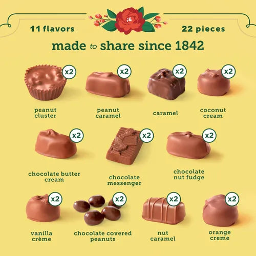INGREDIENTS: MILK CHOCOLATE {SUGAR, WHOLE MILK, COCOA BUTTER, CHOCOLATE, SOY LECITHIN (EMULSIFIER), VANILLIN (ARTIFICIAL FLAVOR)}, SUGAR, CORN SYRUP, PEANUTS, CONDENSED MILK, CREAM, INVERT SUGAR, BROWN SUGAR, COCONUT WITH SODIUM METABISULFITE (PRESERVES WHITENESS), PALM KERNEL OIL, DARK CHOCOLATE {SUGAR, CHOCOLATE PROCESSED WITH ALKALI, COCOA BUTTER, MILK FAT, SOY LECITHIN (EMULSIFIER), VANILLIN (ARTIFICIAL FLAVOR)}, ALMONDS, WALNUTS, SORBITOL, COCOA POWDER, SALT, DRIED EGG WHITES, ORANGE PEEL (ORANGE PEEL, WATER, CITRIC ACID), GUM ARABIC, TAPIOCA STARCH, NATURAL AND ARTIFICIAL FLAVORS, INVERTASE (ENZYME), SOY LECITHIN (EMULSIFIER), EDIBLE SHELLAC, CITRIC ACID, SOYBEAN OIL, MIXED TOCOPHEROLS (ANTIOXIDANT), FD&C COLORS (RED 40, YELLOW 5 & 6, BLUE 1 & 2), POTASSIUM SORBATE AND SODIUM BENZOATE (PRESERVATIVES), CARAMEL COLOR, MAPLE SUGAR, HONEY, APRICOTS WITH SULFUR DIOXIDE (PRESERVES COLOR), CARMINE COLOR, MALTODEXTRIN, SODIUM HYDROXIDE, RASPBERRIES, STRAWBERRIES, MONO AND DIGLYCERIDES WITH CITRIC ACID (ANTIOXIDANT), BUTTER, SPICE, WHITE CHOCOLATE {SUGAR, COCOA BUTTER, WHOLE MILK, SOY LECITHIN (EMULSIFIER), ARTIFICIAL FLAVOR, SALT}, WHOLE MILK, NONFAT MILK SOLIDS, CHERRIES {CHERRIES, CORN SYRUP, HIGH FRUCTOSE CORN SYRUP, WATER, SUGAR, CITRIC ACID, SODIUM BENZOATE AND POTASSIUM SORBATE (PRESERVATIVES), NATURAL FLAVOR, FD&C RED 40, SULFUR DIOXIDE (PRESERVES COLOR)}, RAISINS (RAISINS, SUNFLOWER OIL), PECANS, LEMON PEEL, EVAPORATED MILK (MILK, DIPOTASSIUM PHOSPHATE, CARRAGEENAN, VITAMIN D3), PEANUT WAFERS {SUGAR, PALM KERNEL OIL, PARTIALLY DEFATTED PEANUT FLOUR, NONFAT DRY MILK POWDER, PEANUT OIL, SOY LECITHIN (EMULSIFIER), SALT} AND PEANUT BUTTER (DRY ROASTED PEANUTS, HYDROGENATED COTTONSEED/RAPESEED OIL, SOY OIL, SALT).
