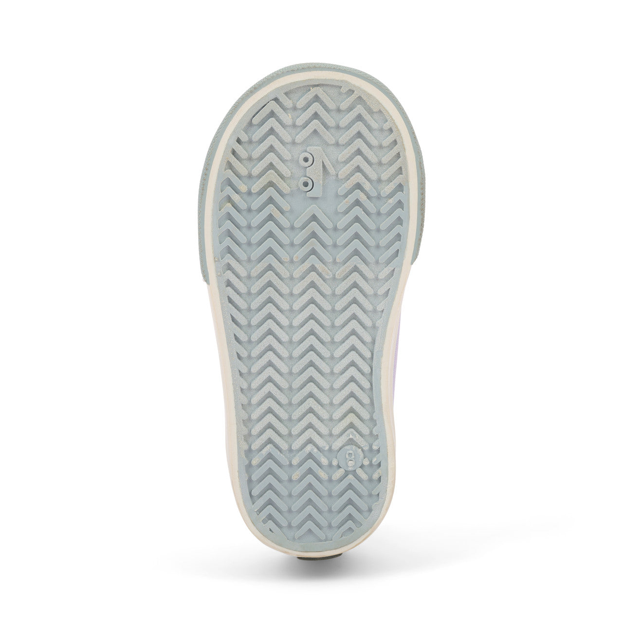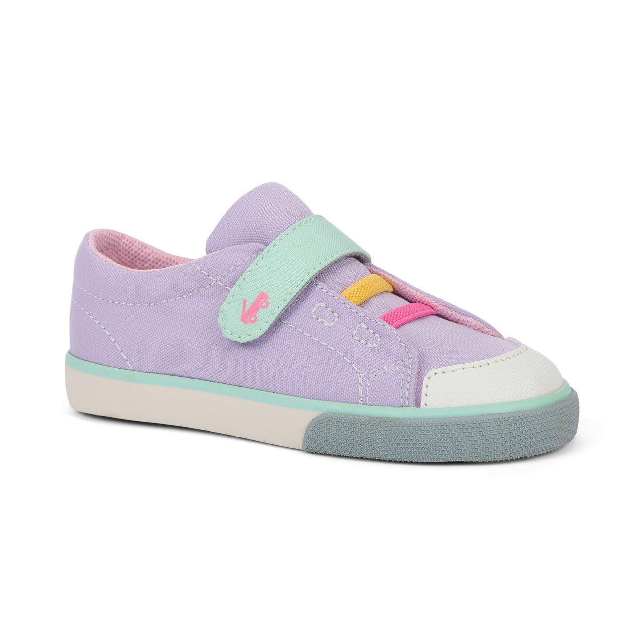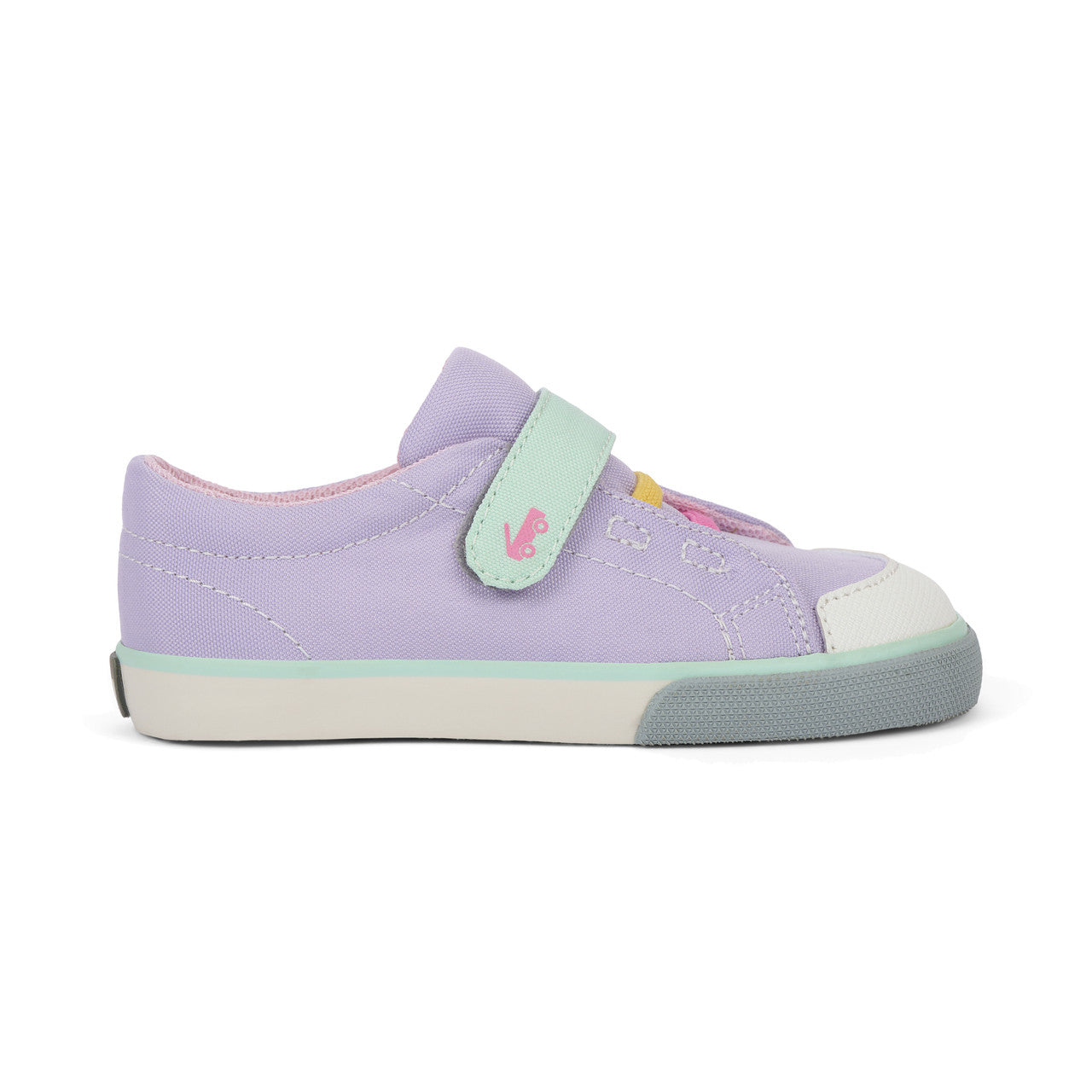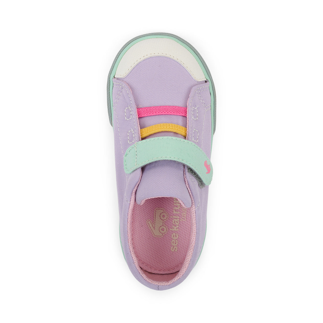 Toddler kids’ sneaker with canvas textile upper.   Breathable mesh lining keeps feet comfortable.   Adjustable hook and loop closure for secure fit.   Minimal, lightweight construction.   See Kai Run fit gives toes room to move and build strength.   Rubberized toe cap for added protection.   Approved by the American Podiatric Medical Association.