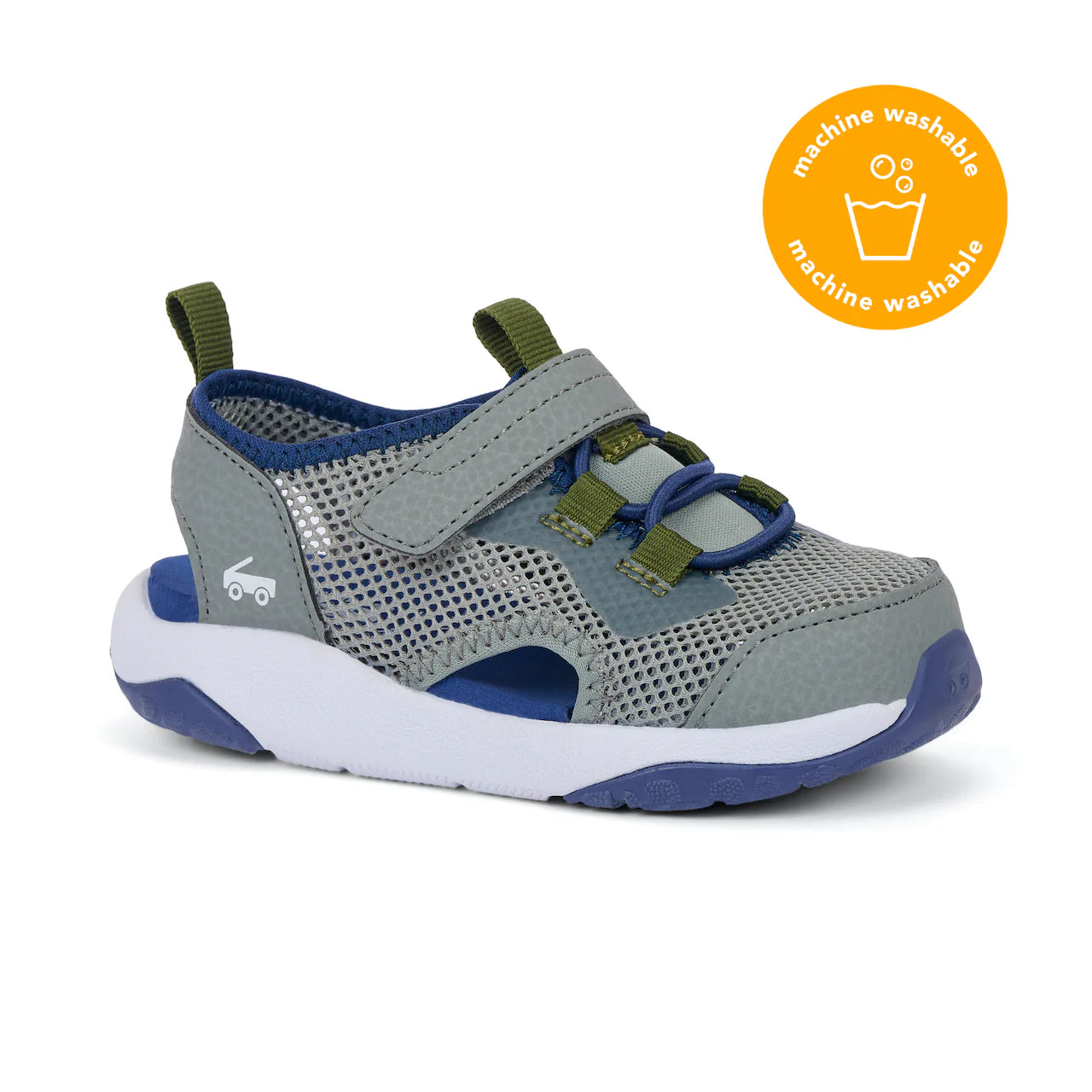 Gray open mesh textile water-friendly upper. Recycled jersey details plus nubuck-feel overlays and toe cap. Ultra-breathable interior with cushy EVA footbed for all-day comfort. Lightweight, cushioned FlexiRun™ EVA foam midsole. TPR full rubber outsole with traction inlays for excellent grip. Adjustable hook-and-loop strap and faux elastic laces allow for a secure fit. Generous toe box provides room for healthy foot development. Vegan – made without any animal products. Machine Washable Care Instructions: Machine wash cold on gentle cycle with mild detergent. Do not bleach. Air dry.
