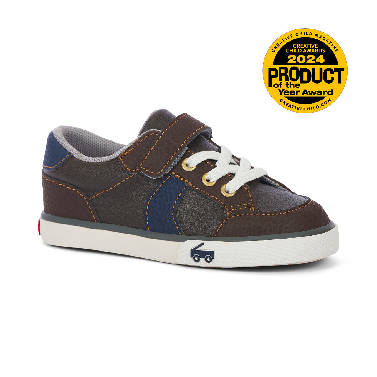Brown leather upper with nubuck-feel overlays. Breathable recycled mesh lining and removable, leather-lined footbed is contoured for all-day comfort. Natural rubber outsole with herringbone lug pattern provides great traction for play. Hook-and-loop strap and faux elastic laces allow for secure fit and custom adjustability. Classic SKR fit gives feet room to move and grow. Awarded the Seal of Acceptance from the American Podiatric Medical Association (APMA).