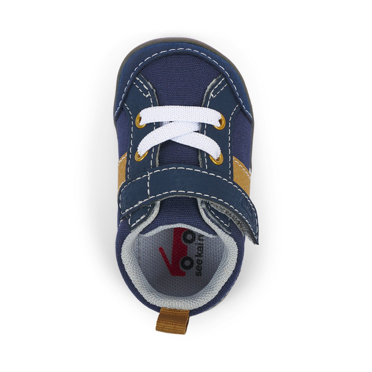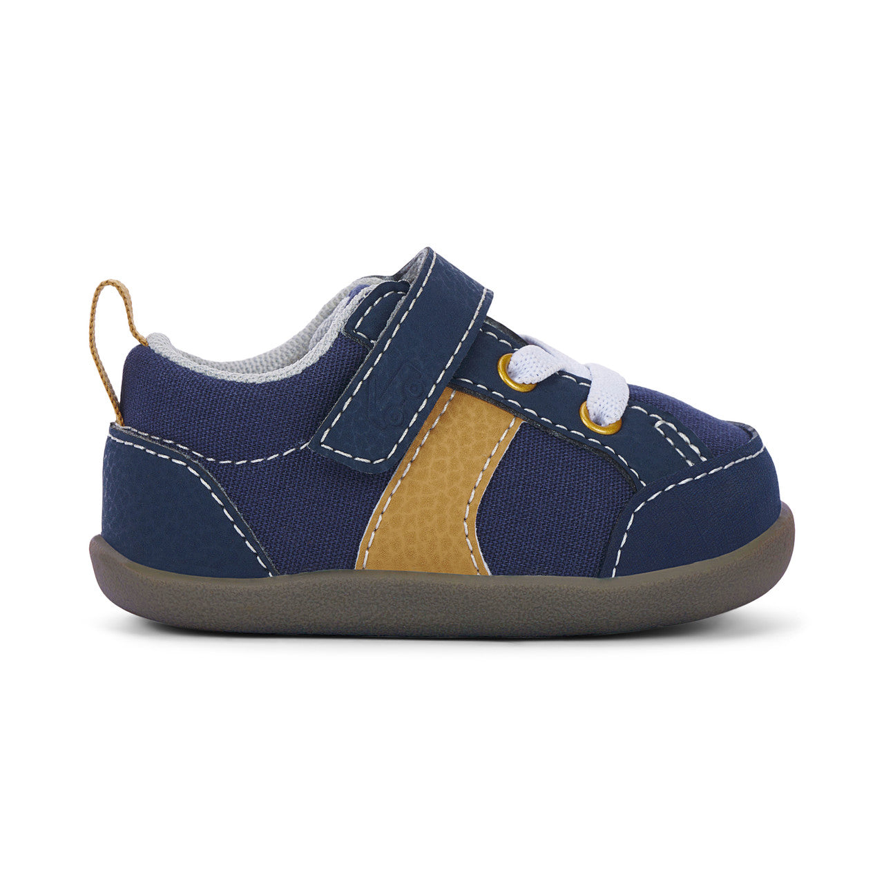Soft navy canvas upper with nubuck-feel overlays and an extra durable rubber toe cap to protect little toes. Recycled mesh lining and sockliner keeps feet dry and fresh. Recycled TPR rubber outsole provides flexibility, traction, and durability for early steps. Adjustable hook-and-loop strap and faux elastic laces allow for a secure fit. Generous toe box provides room for healthy foot development. Awarded the Seal of Acceptance from the American Podiatric Medical Association (APMA). Vegan – made without any animal products.
