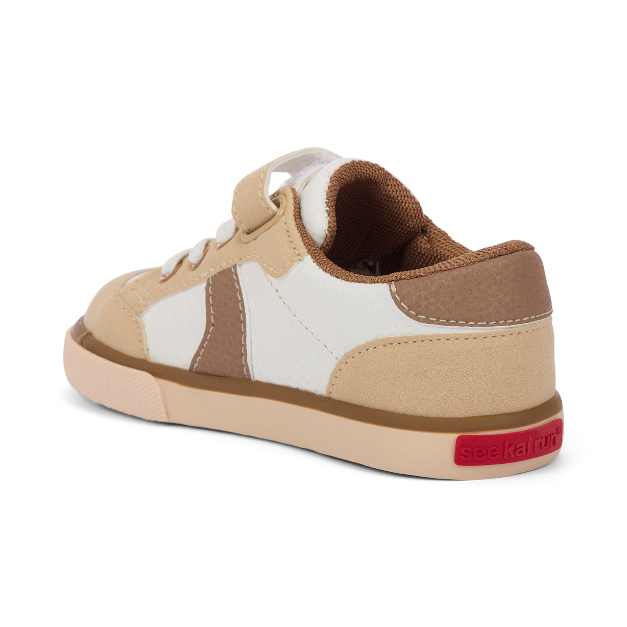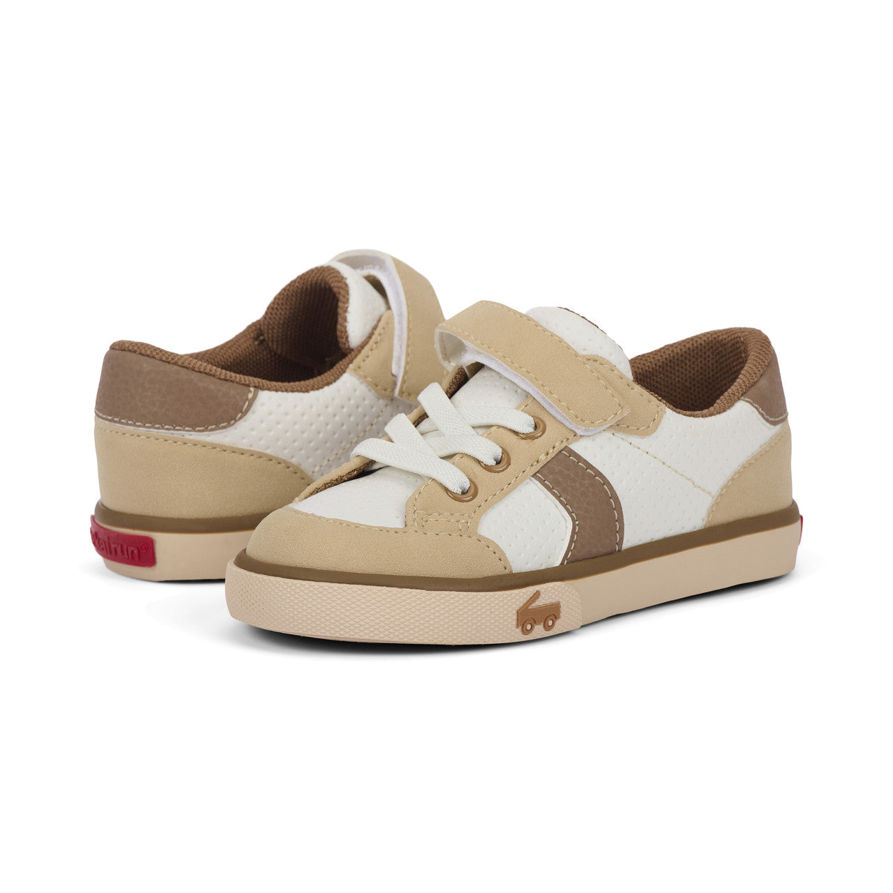 Ready, set, play with the Connor - a retro court inspired sneaker made of white debossed action leather upper, tan microsuede overlays, and tonal accents. Criss-cross elastic lace pattern for an elevated look with the same ease of entry. Includes 100% leather lined removable molded footbed for a healthy foot climate. Lightweight and flexible with a wide opening makes it easy to get shoes on and stay on, leaving more time for play. Â Â