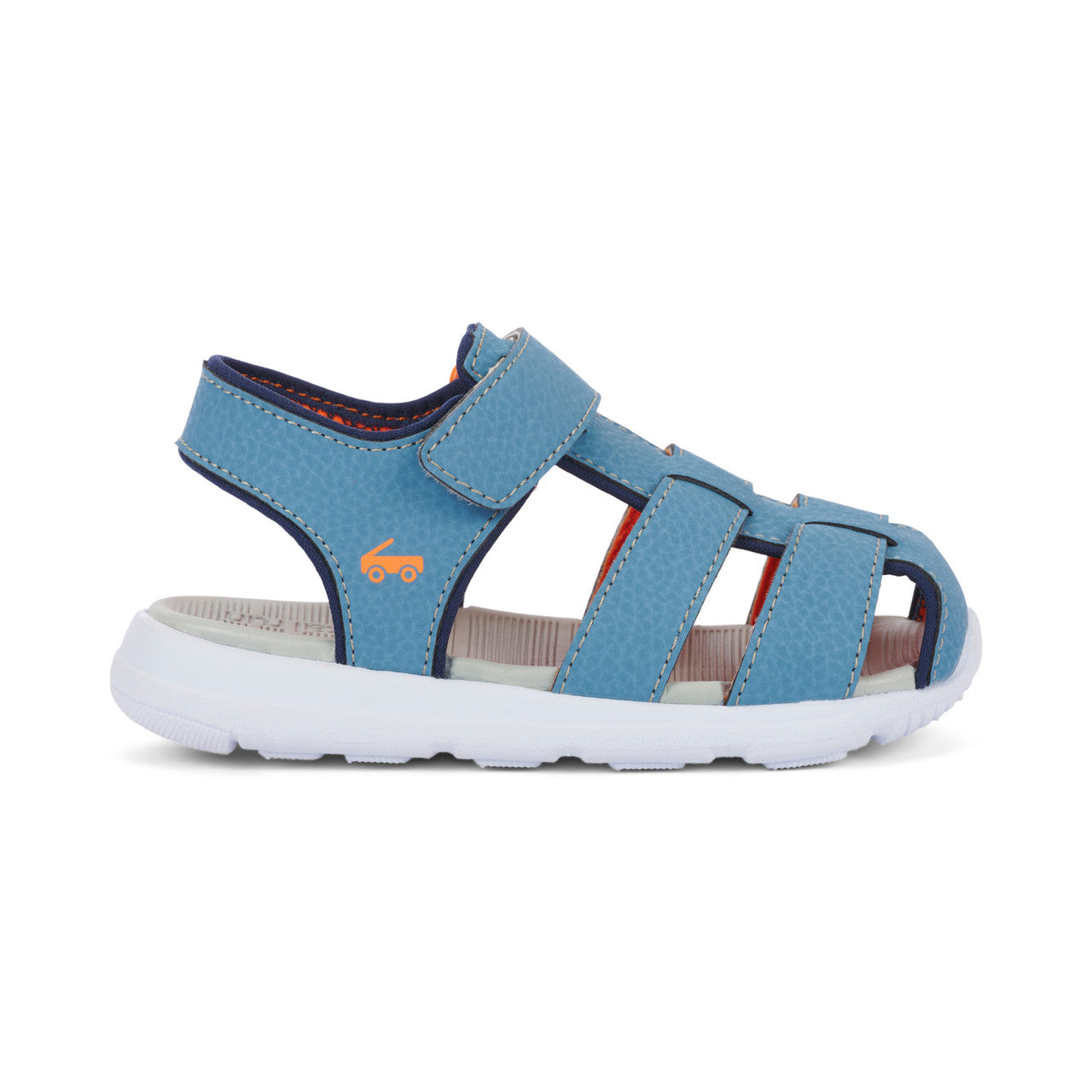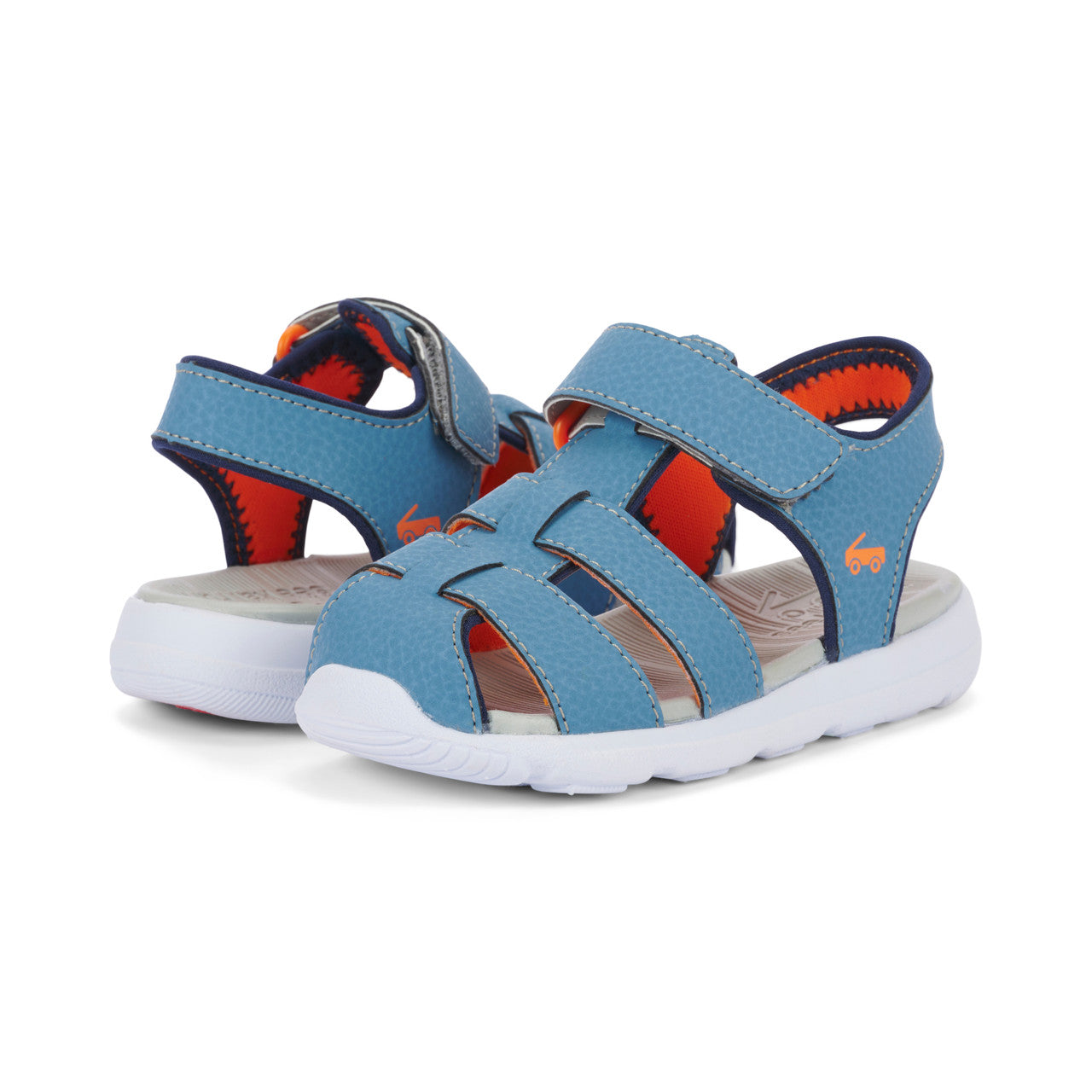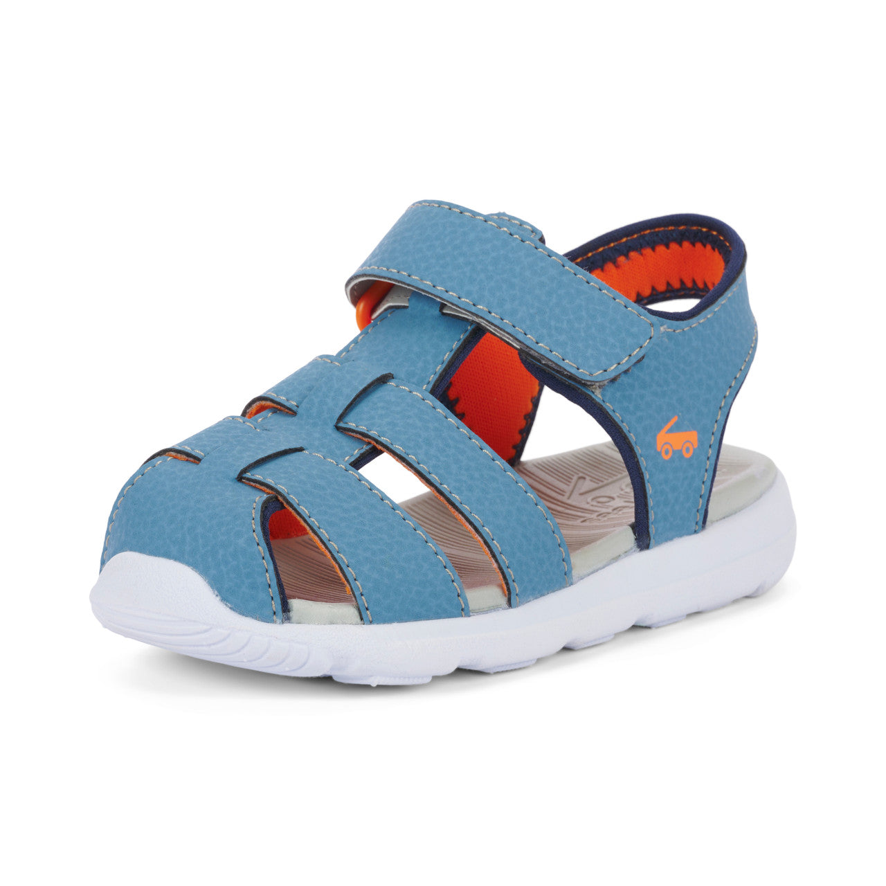 Sporty fisherman closed-toe sandal in durable, water-friendly synthetic leather. The FlexiRun EVA foam outsole is engineered to be super lightweight, cushy and flexible. Soft recycled jersey lining and binding provides barefoot comfort . Generous toe box and EVA molded footbed promotes healthy foot development. Hook-and-loop strap provides an adjustable custom fit and easy in and out. Water-friendly and machine washable. Awarded the Seal of Acceptance from the American Podiatric Medical Association (APMA). Vegan – made without any animal products.