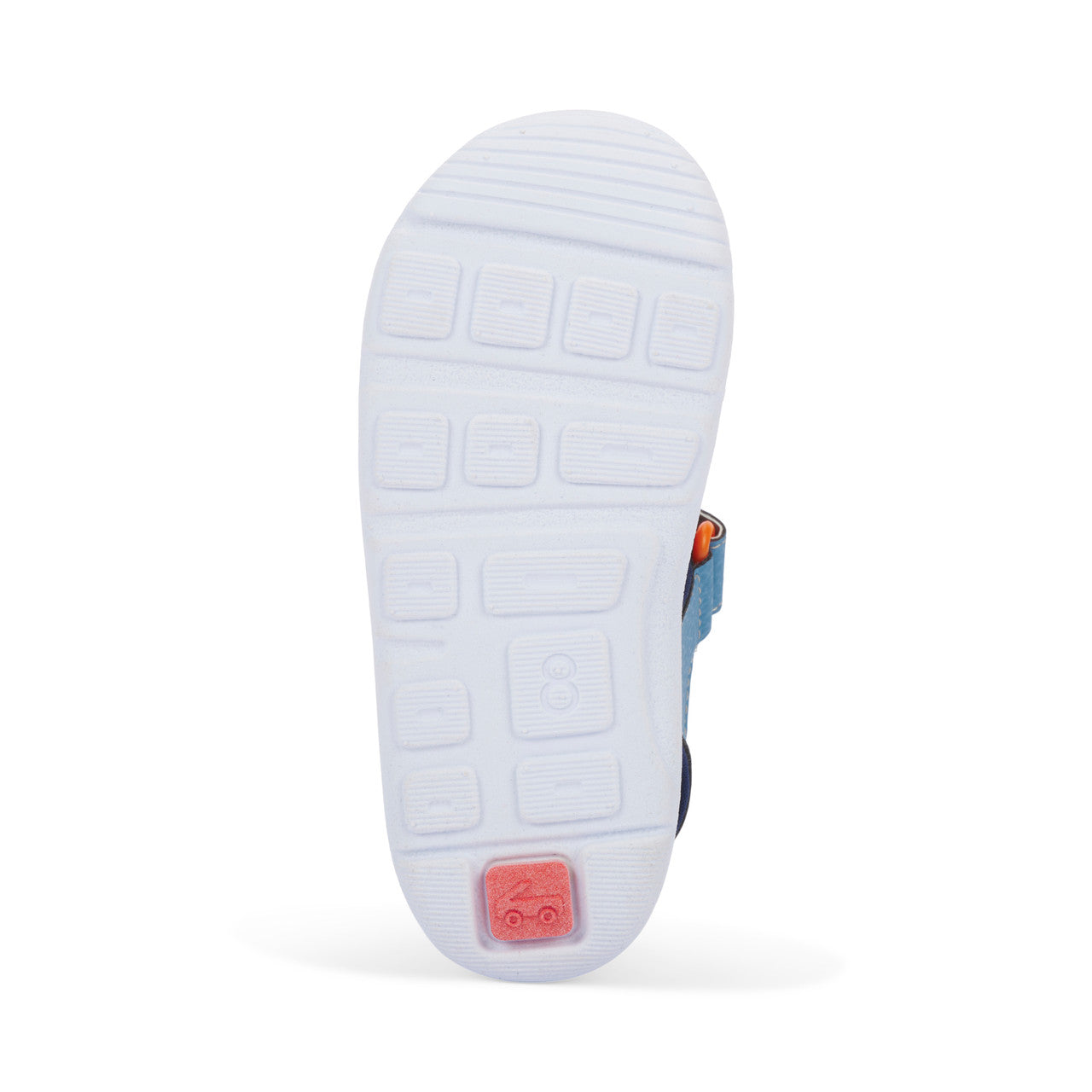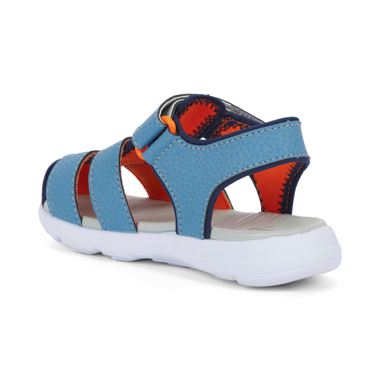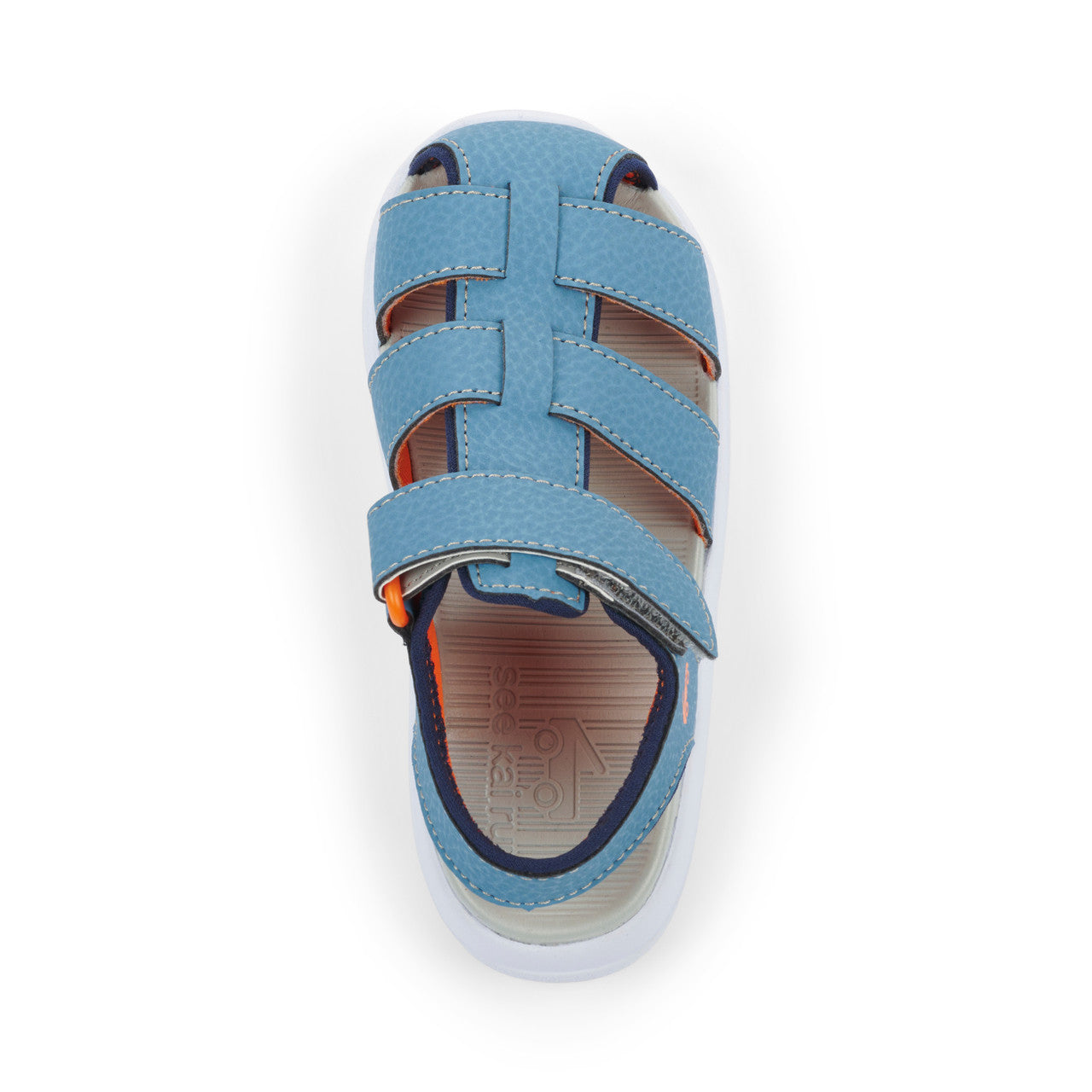 Sporty fisherman closed-toe sandal in durable, water-friendly synthetic leather. The FlexiRun EVA foam outsole is engineered to be super lightweight, cushy and flexible. Soft recycled jersey lining and binding provides barefoot comfort . Generous toe box and EVA molded footbed promotes healthy foot development. Hook-and-loop strap provides an adjustable custom fit and easy in and out. Water-friendly and machine washable. Awarded the Seal of Acceptance from the American Podiatric Medical Association (APMA). Vegan – made without any animal products.