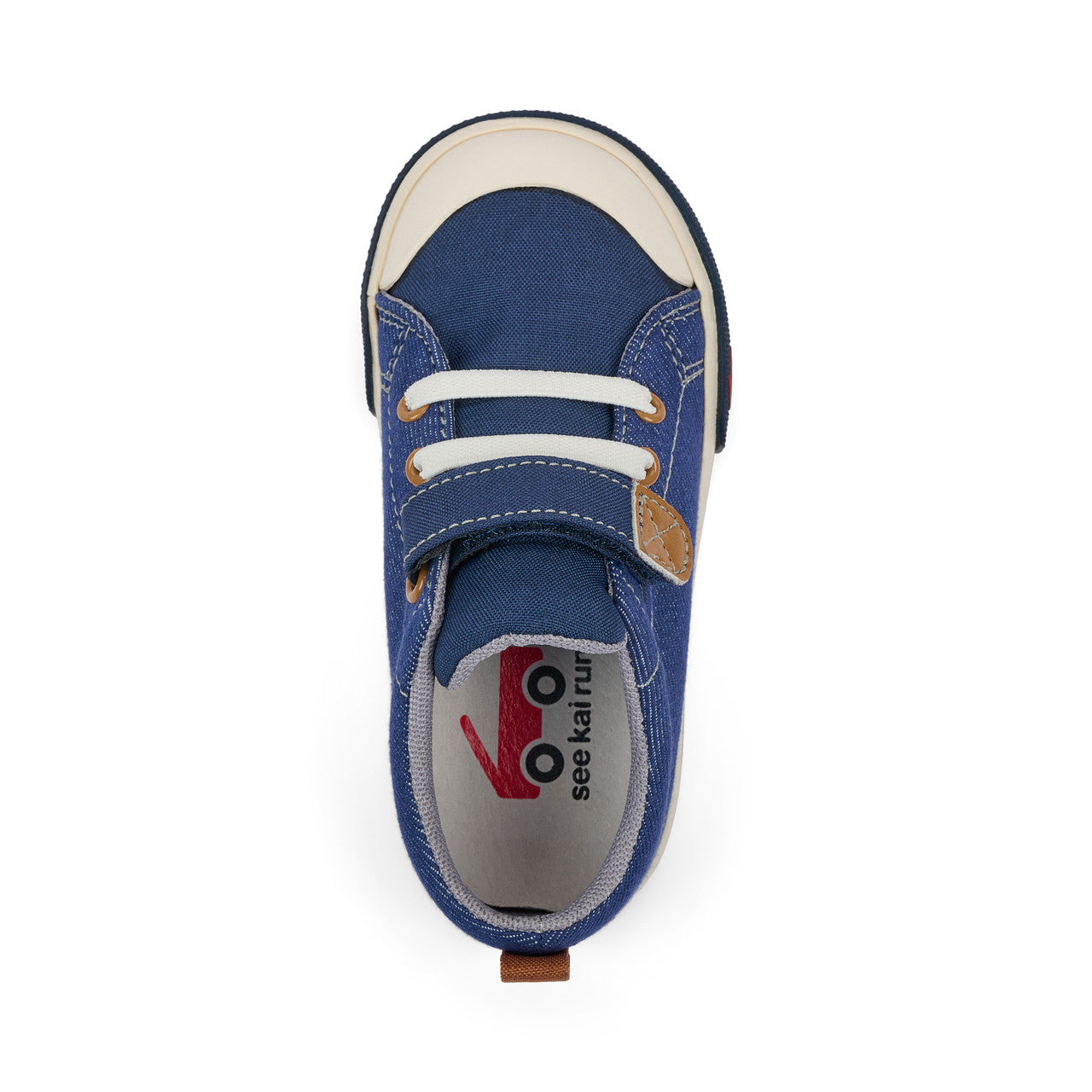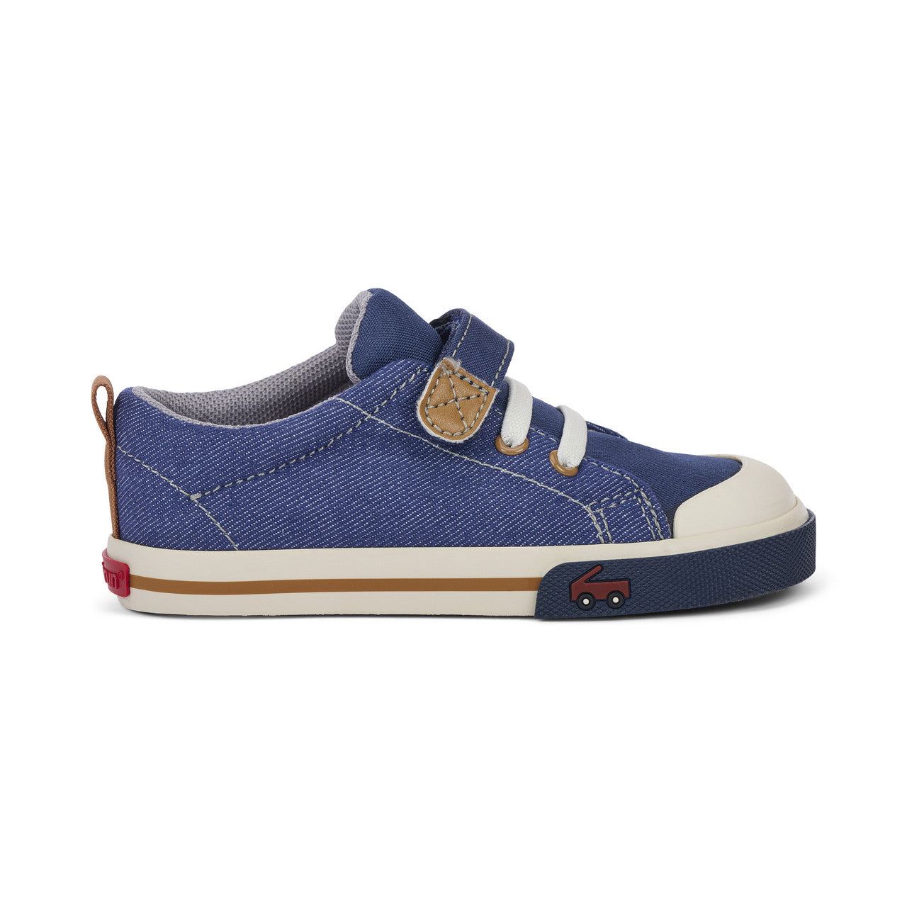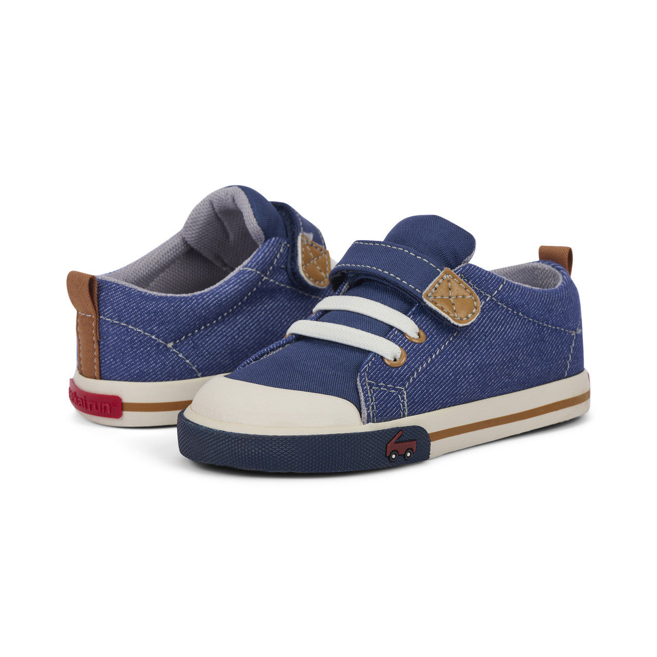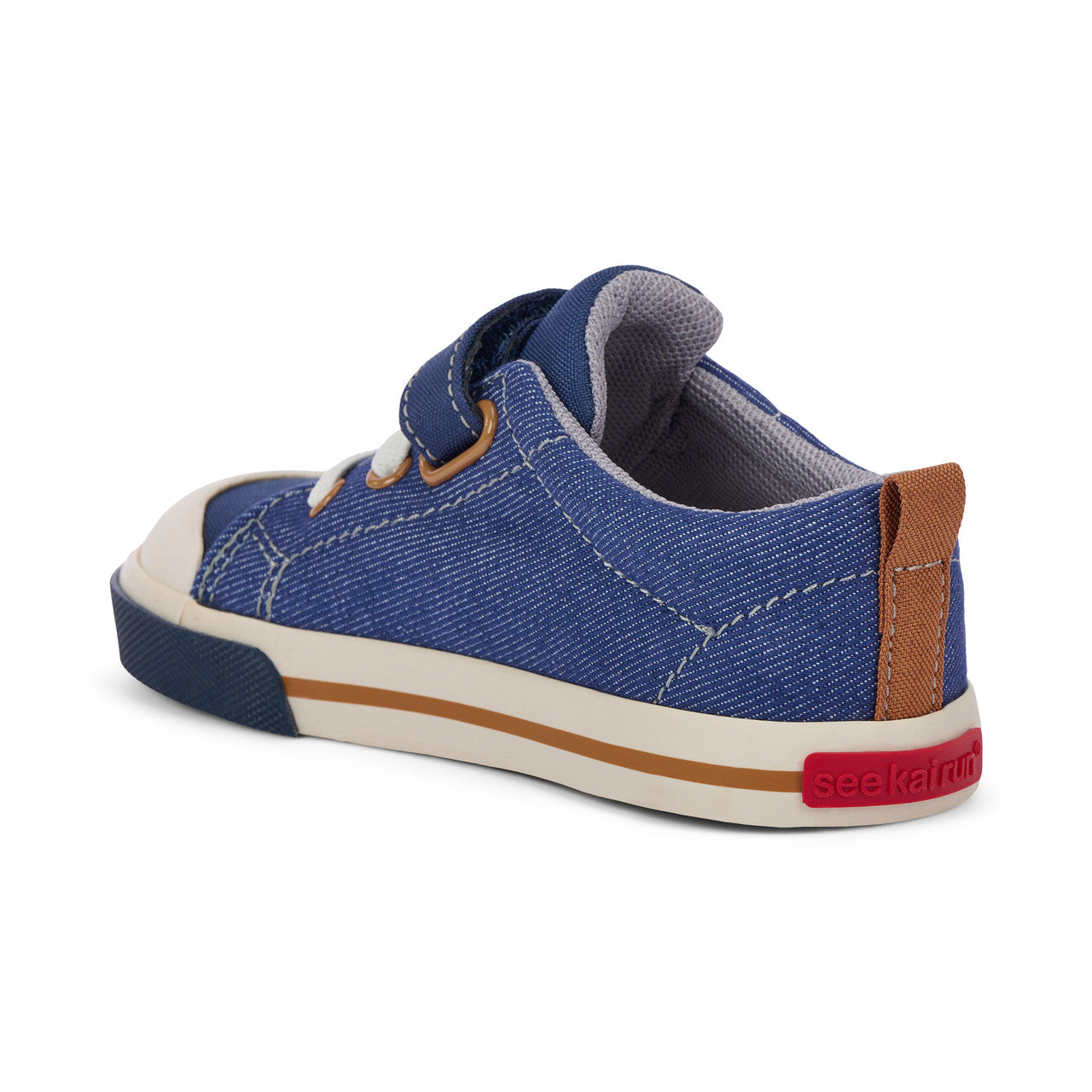 Durable, flexible Navy cotton denim and recycled polyester upper with rubber toe cap for protection. Breathable recycled mesh lining and removable, leather-lined footbed is contoured for all-day comfort. Natural rubber outsole with herringbone lug pattern provides great traction for play. Hook-and-loop strap and faux elastic laces allow for secure fit and custom adjustability. Classic SKR fit gives feet room to move and grow. Awarded the Seal of Acceptance from the American Podiatric Medical Association (APMA). Care Instructions: Spot clean using a mild detergent and damp cloth. Allow to air dry.