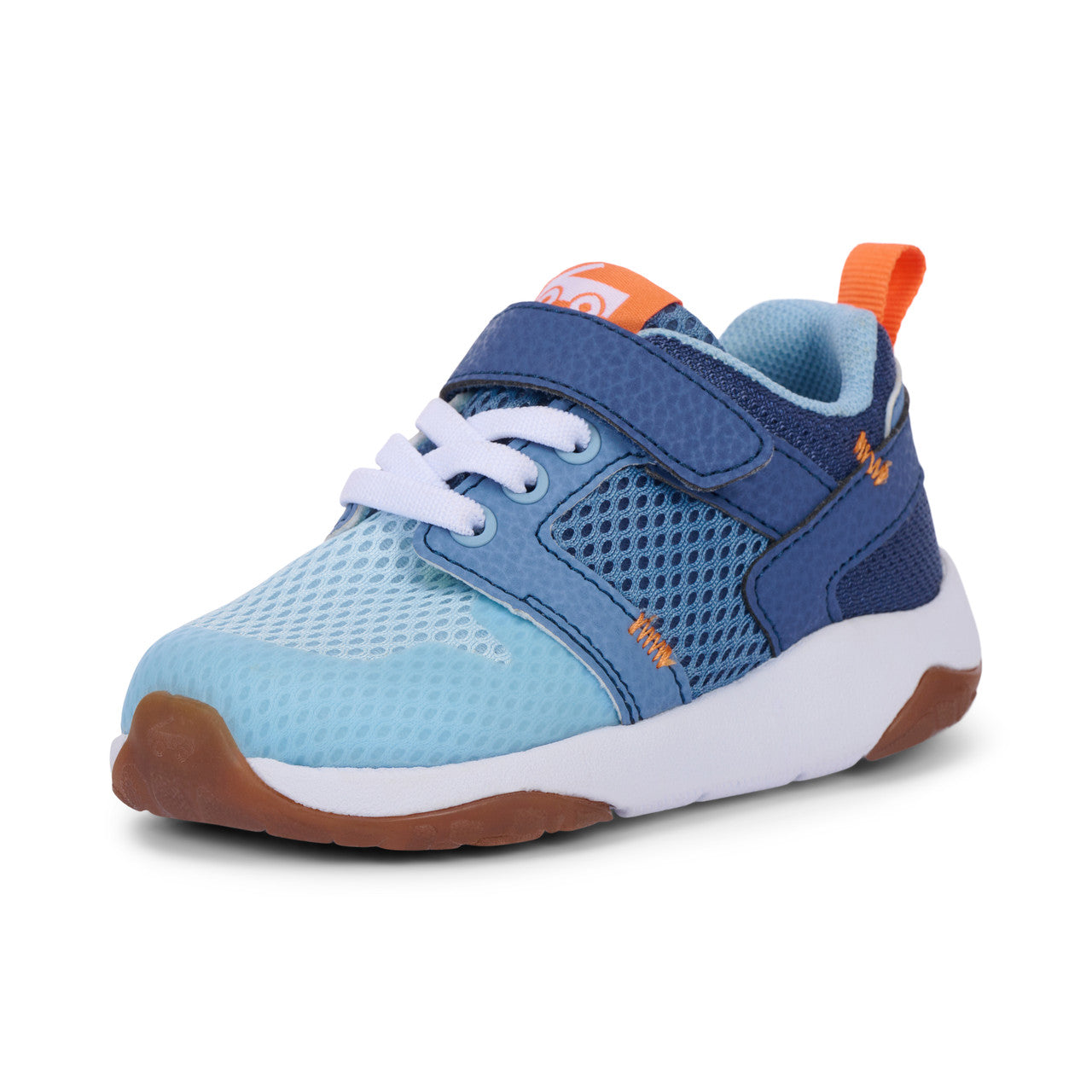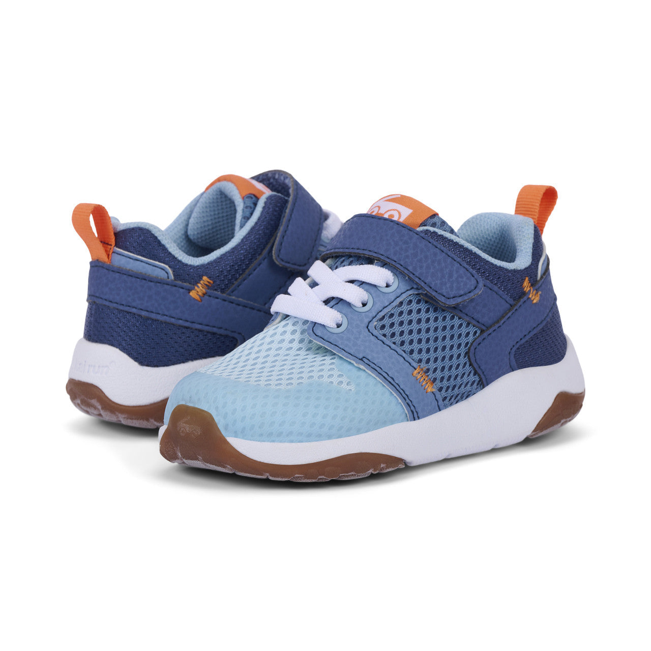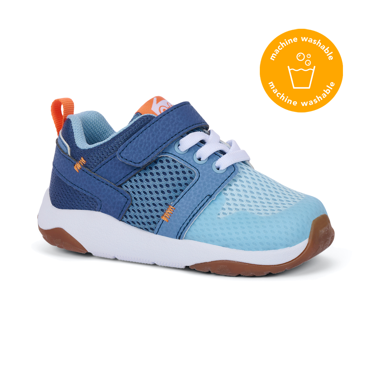 Blue mesh textile upper with nubuck-feel overlays and rubberized toe cap for protection. Recycled mesh lining and EVA sockliner allows air movement for breathable comfort. Lightweight, cushioned FlexiRun™ outsole featuring EVA foam midsole and TR rubber traction inlays for excellent grip. Adjustable hook-and-loop strap and faux elastic laces allow for a secure fit. Generous toe box provides room for healthy foot development. Vegan – made without any animal products. Machine Washable Care Instructions: Machine wash cold on gentle cycle with mild detergent. Do not bleach. Air dry.