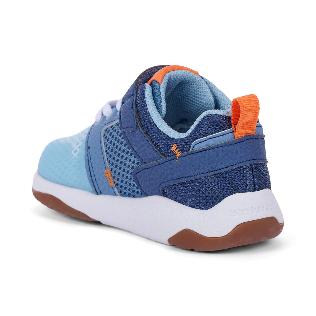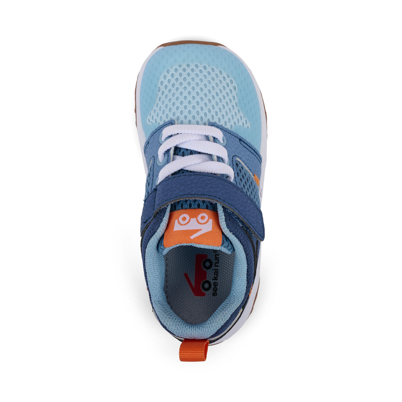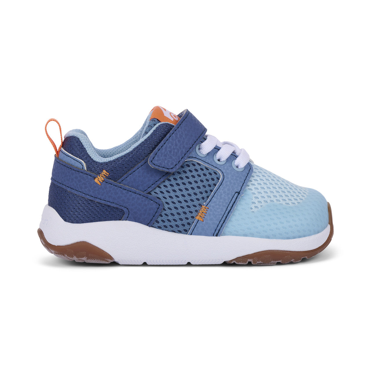 Blue mesh textile upper with nubuck-feel overlays and rubberized toe cap for protection. Recycled mesh lining and EVA sockliner allows air movement for breathable comfort. Lightweight, cushioned FlexiRun™ outsole featuring EVA foam midsole and TR rubber traction inlays for excellent grip. Adjustable hook-and-loop strap and faux elastic laces allow for a secure fit. Generous toe box provides room for healthy foot development. Vegan – made without any animal products. Machine Washable Care Instructions: Machine wash cold on gentle cycle with mild detergent. Do not bleach. Air dry.
