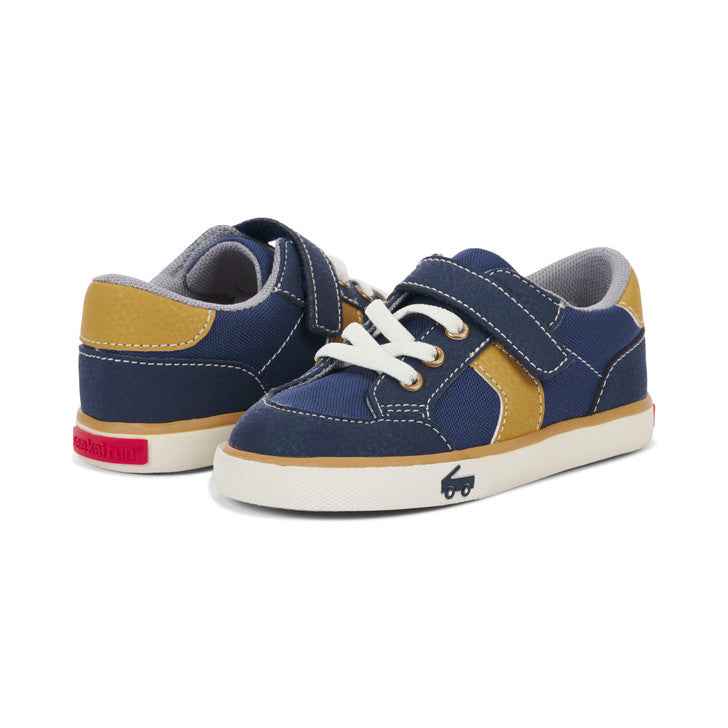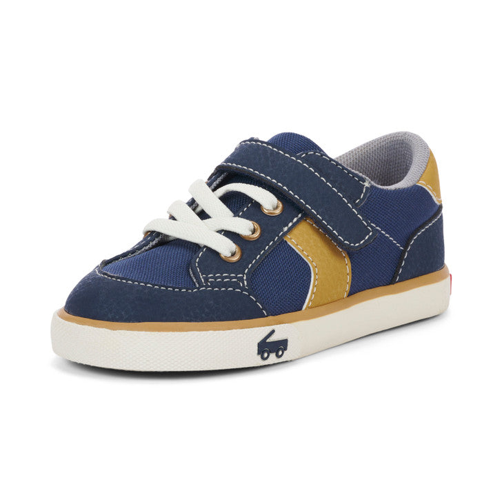 Description Ready, set, play with The Conner - a retro court inspired sneaker made with recycled nylon, durable navyoverlays, and tan accents. With a crisscross faux elastic lace pattern for a cool new look and ease of entry, the lightweight, flexible construction with a wide opening makes it easy to get shoes on and stay on, leaving more time for play.