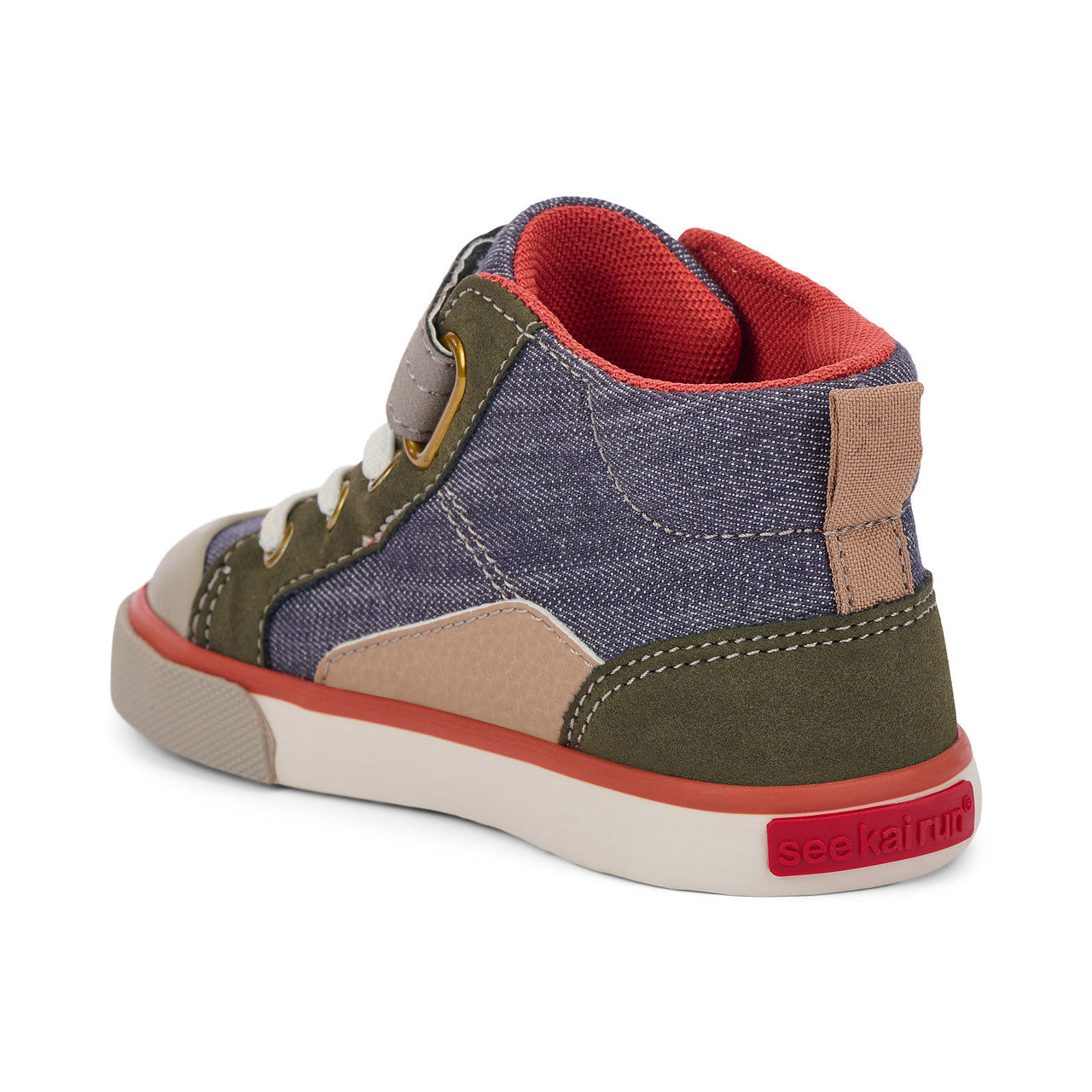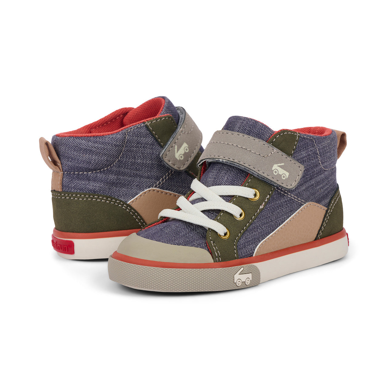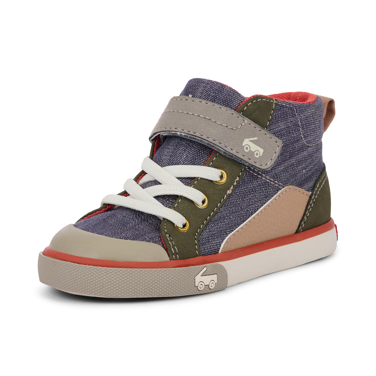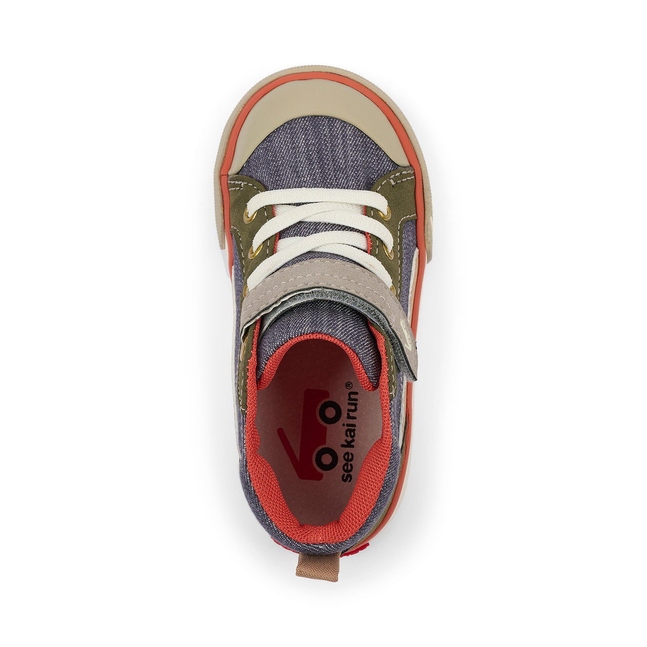 Denim upper with faux suede and nubuck overlays plus rubber toe cap for protection. Breathable recycled mesh lining and removable, leather-lined footbed is contoured for all-day comfort. Natural rubber outsole with herringbone lug pattern provides great traction for play. Reverse hook-and-loop strap and faux elastic laces allow for secure fit and custom adjustability. Classic SKR fit gives feet room to move and grow. Awarded the Seal of Acceptance from the American Podiatric Medical Association (APMA) Care Instructions: Spot clean using a mild detergent and damp cloth. Allow to air dry.