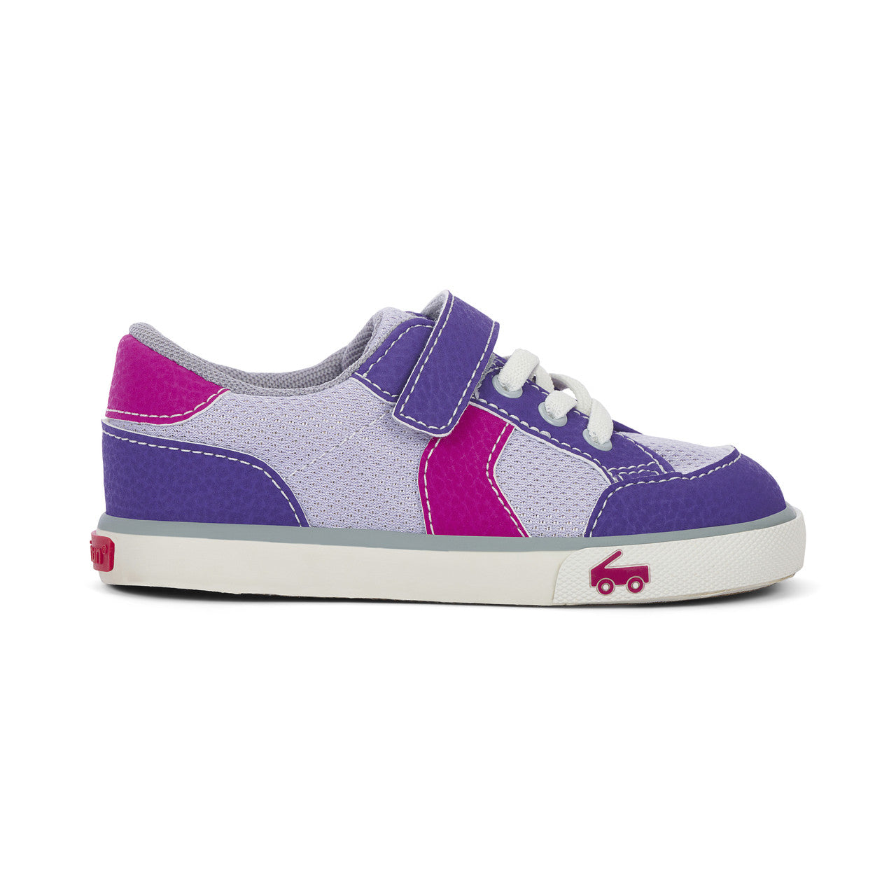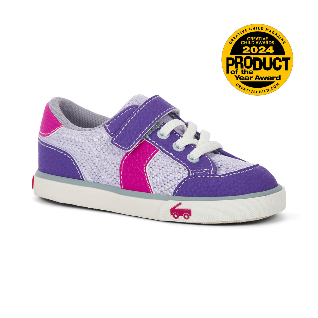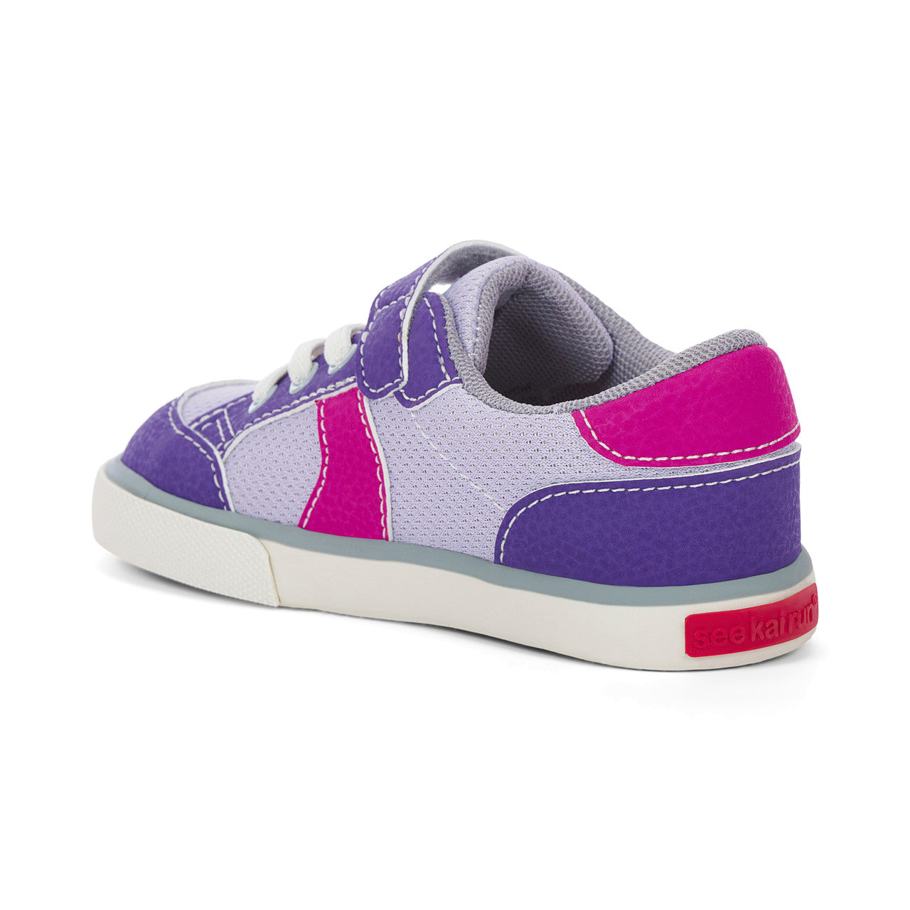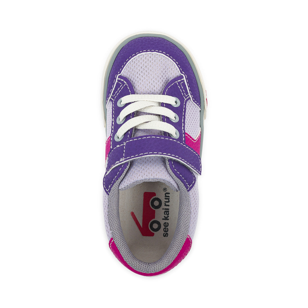 Purple mesh upper with nubuck-feel overlays. Breathable recycled mesh lining and removable, leather-lined footbed is contoured for all-day comfort. Natural rubber outsole with herringbone lug pattern provides great traction for play. Hook-and-loop strap and faux elastic laces allow for secure fit and custom adjustability. Classic SKR fit gives feet room to move and grow. Awarded the Seal of Acceptance from the American Podiatric Medical Association (APMA).