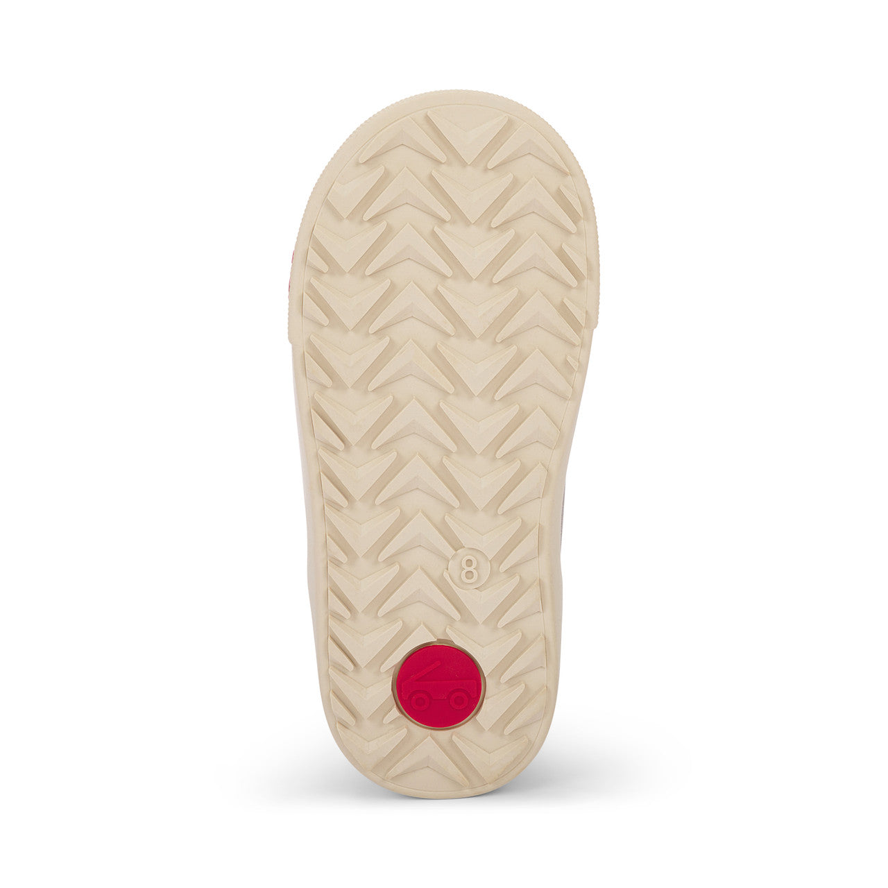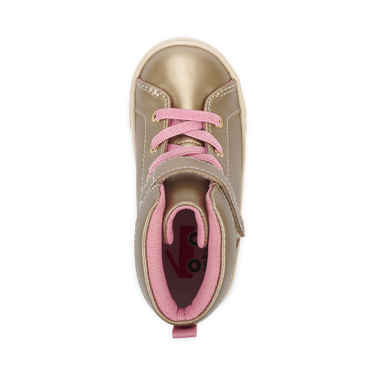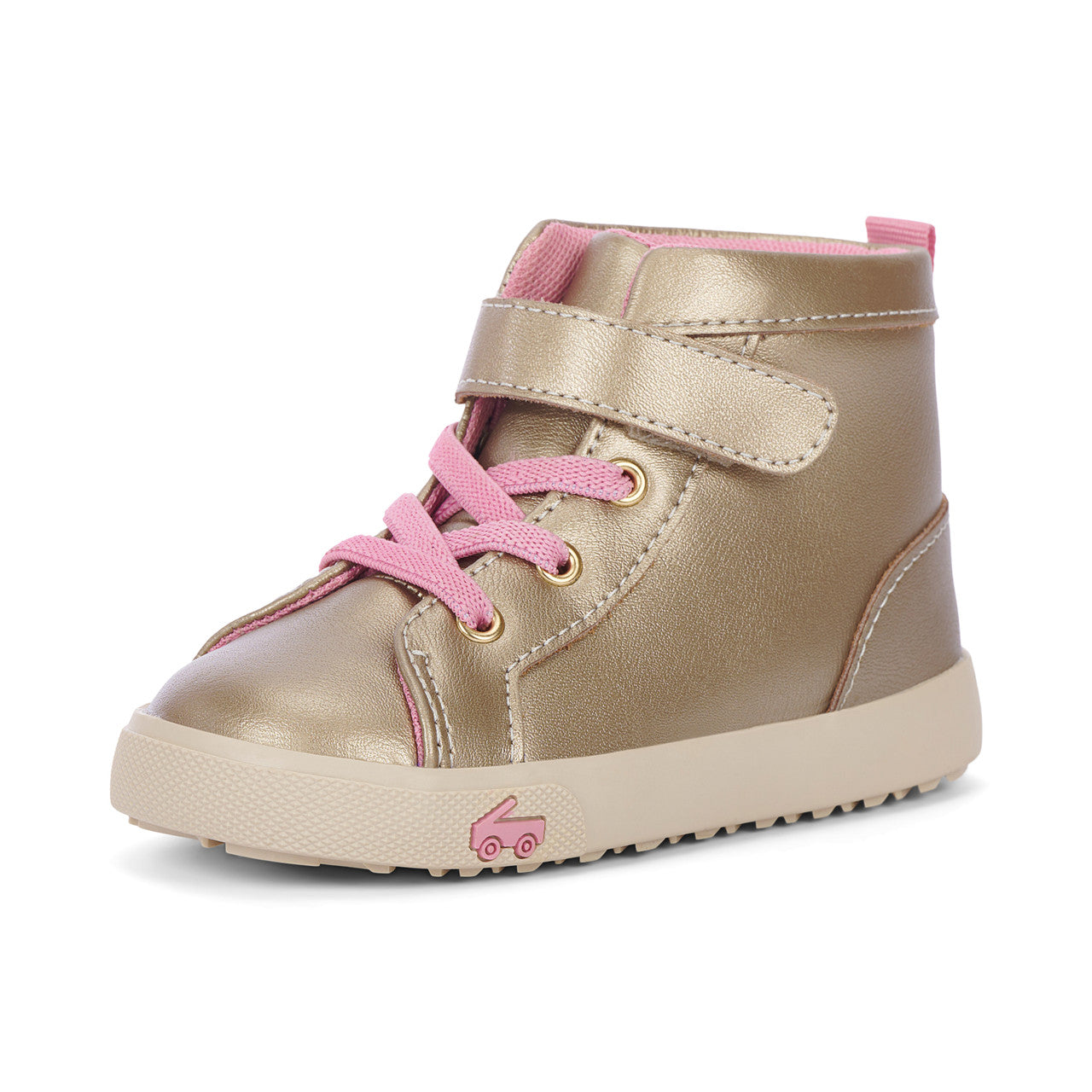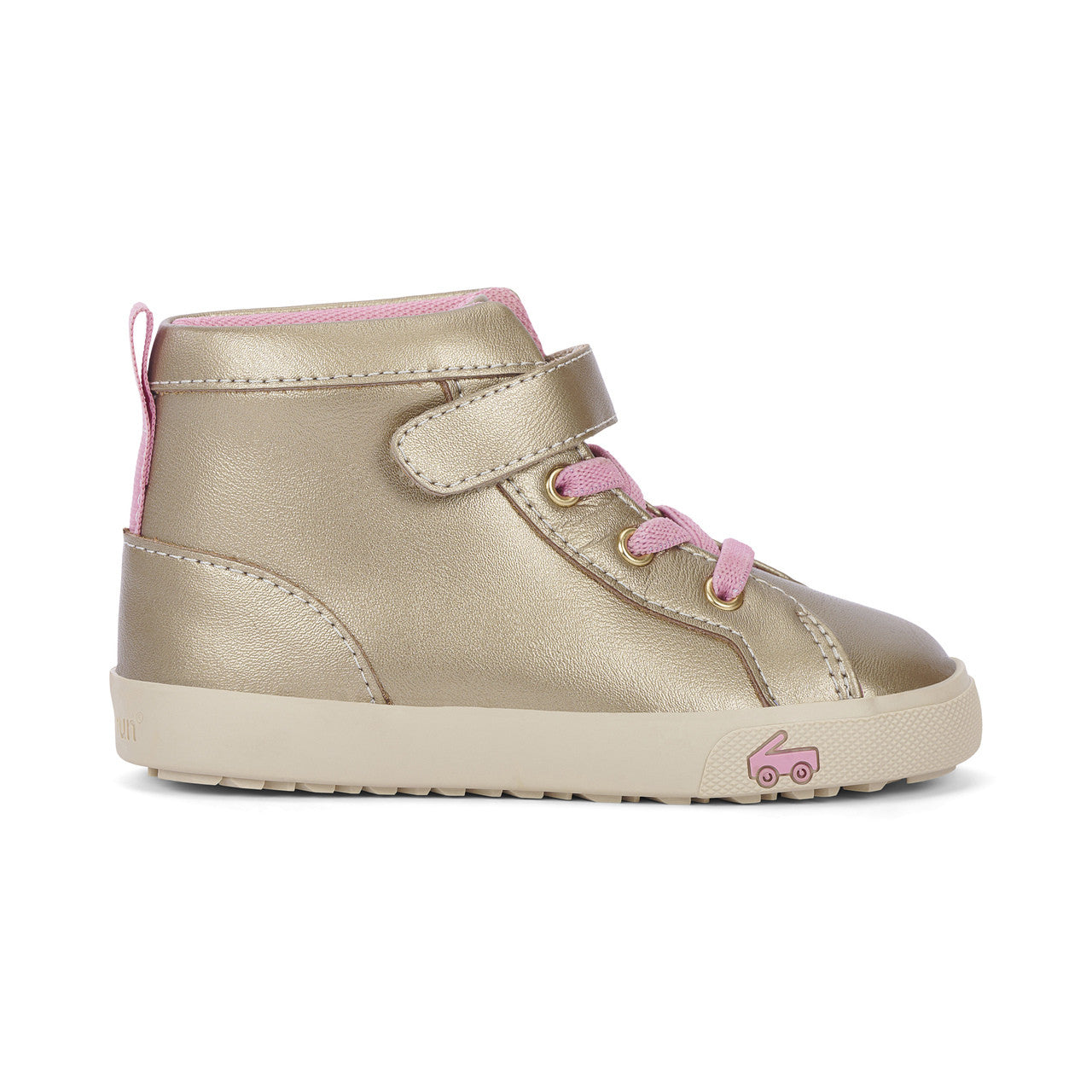 Metallic gold leather upper. Breathable recycled mesh lining and removable, leather-lined footbed is contoured for all-day comfort. Natural rubber outsole with deep lug pattern provides great traction for play. Hook-and-loop strap and faux elastic laces allow for secure fit and custom adjustability. Classic SKR fit gives feet room to move and grow.