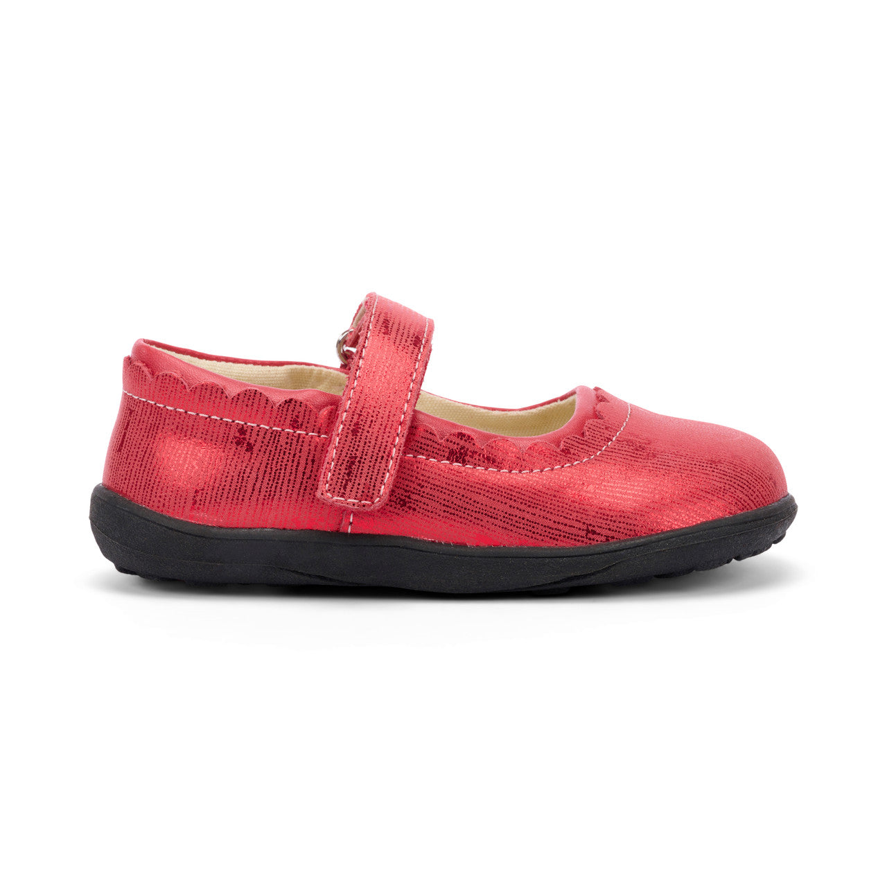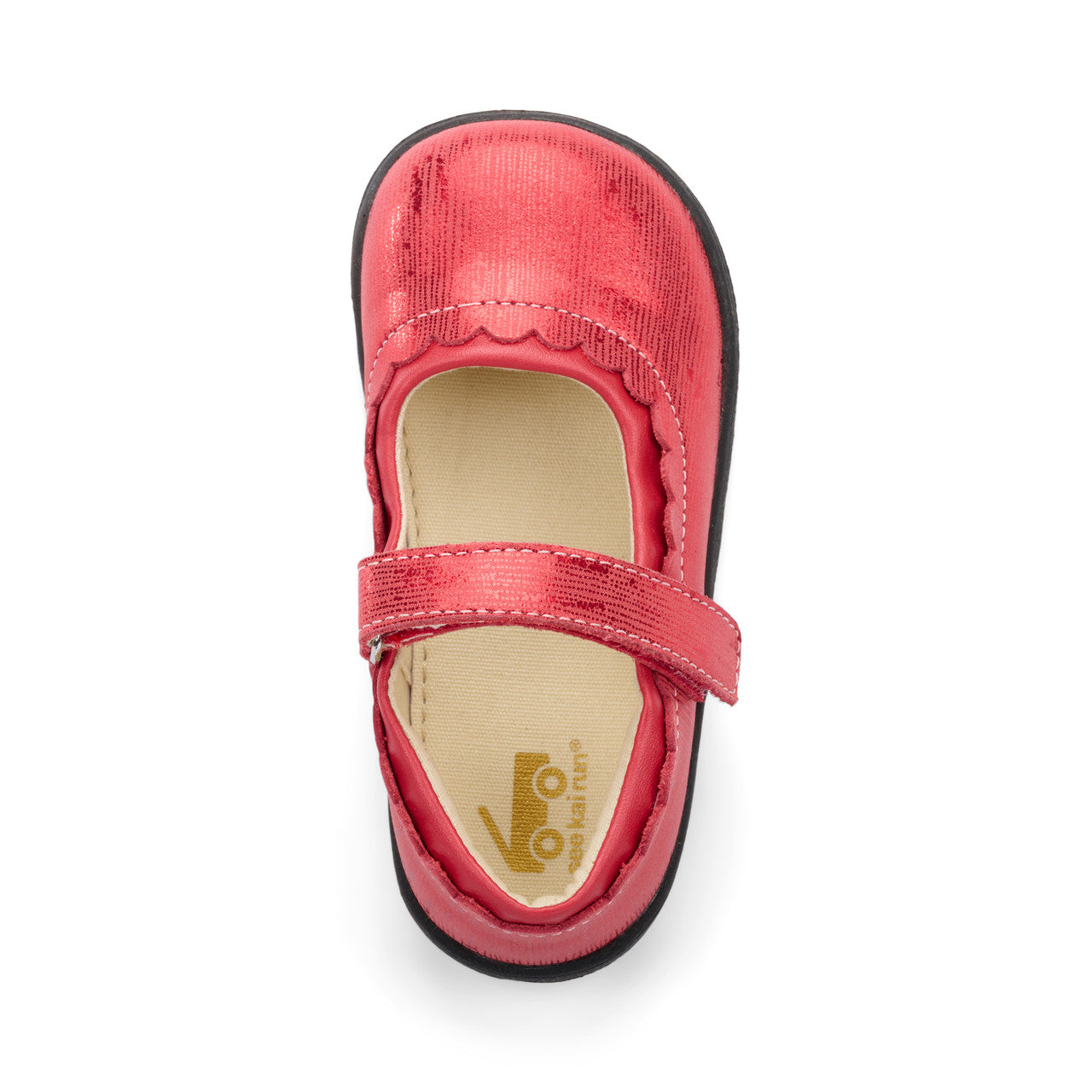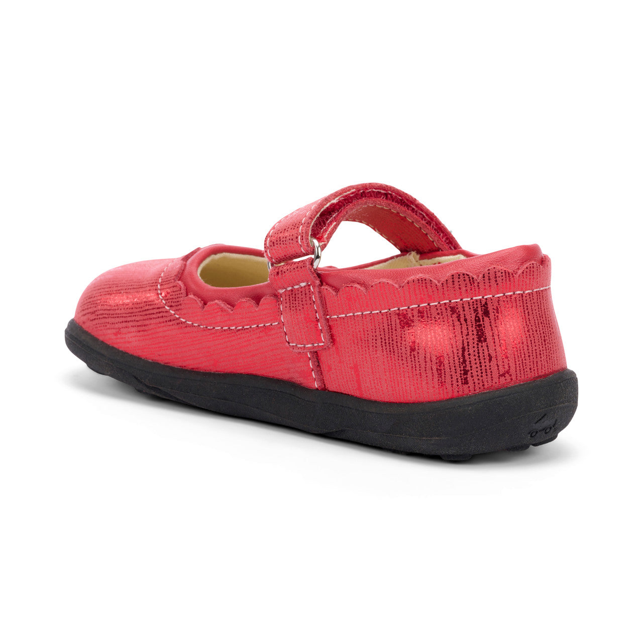 Soft leather uppers with red metallic finish and scalloped topline edging Flexible TPR rubber outsole provides traction for safe play 100% cotton canvas lining and sockliner is breathable and provides comfortable foot climate Hook and loop strap allow for secure fit and custom adjustability Classic SKR toe box shape gives feet room to move and grow Awarded the Seal of Acceptance from the American Podiatric Medical Association (APMA)
