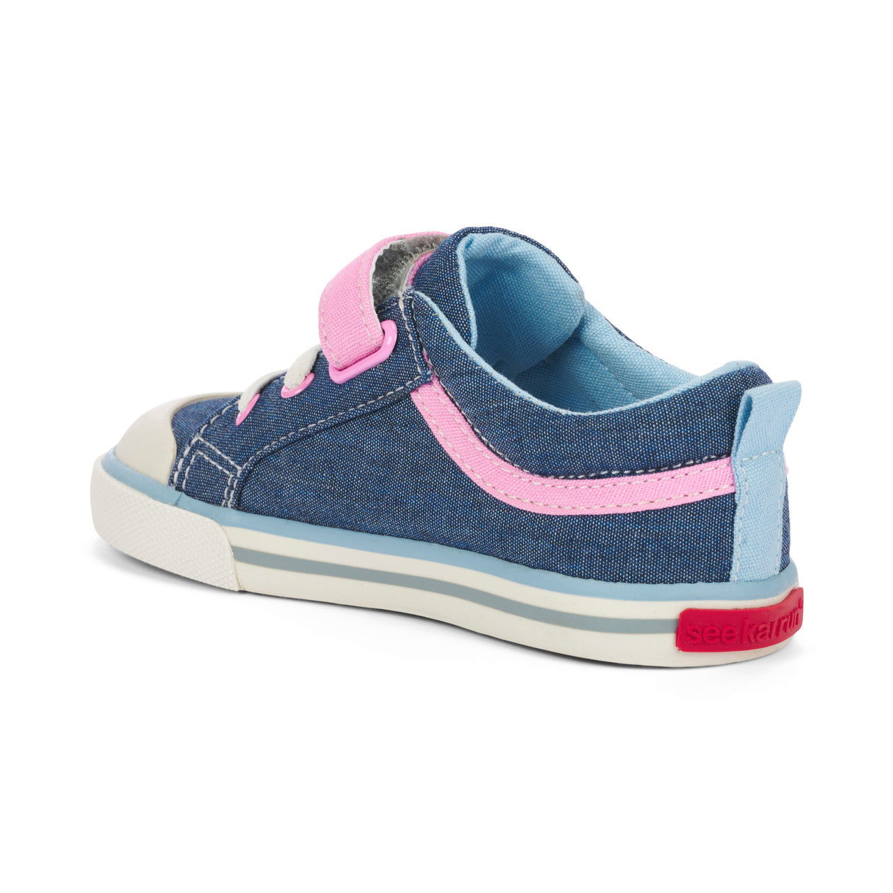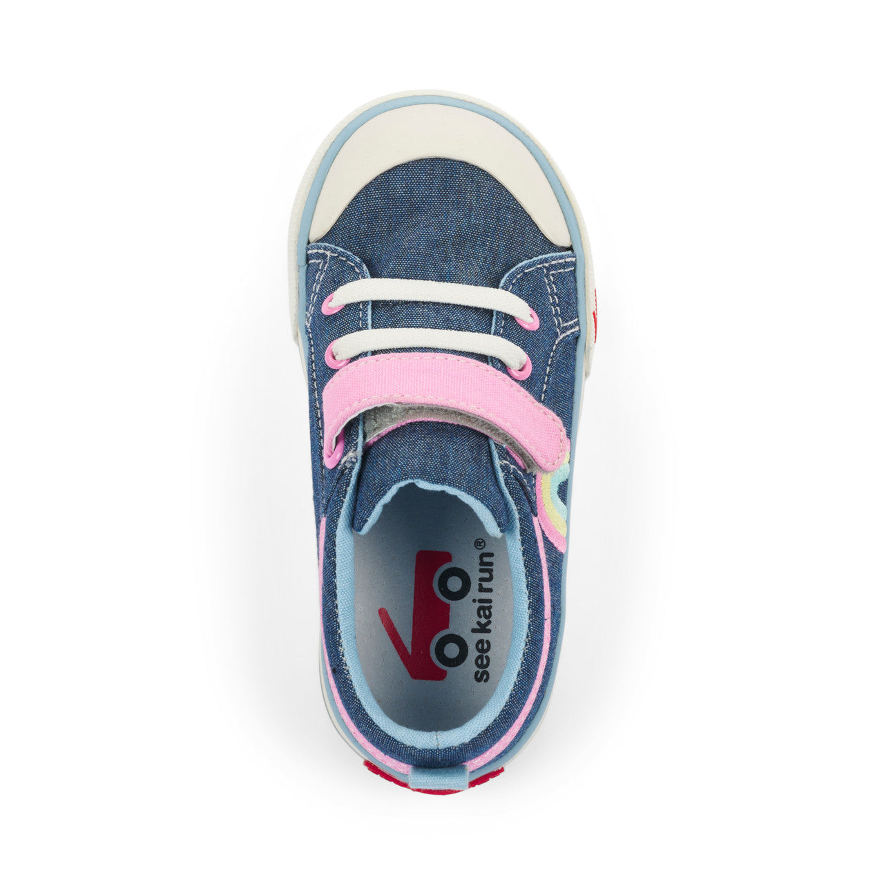 Meet Kristin Blue Chambray! A classic sneaker made of chambray with pink canvas accents and an embroidered rainbow detail. Includes a leather lined removable molded footbed for healthy foot climate. Natural rubber toe cap for added protection.