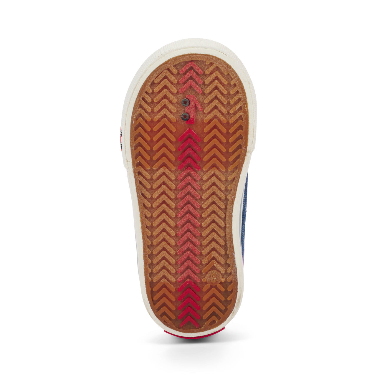 Chambray canvas upper with embroidered details. Cotton canvas lining for foot comfort. Removable, contoured, leather-lined footbed for breathability and comfort. Super-durable construction is also flexible and lightweight. Adjustable hook-and-loop strap and faux elastic laces provide custom adjustability and secure fit. Classic SKR fit gives feet room to move and grow. Natural rubber outsole with herringbone lug pattern provides great traction for play. Awarded the Seal of Acceptance from the American Podiatric Medical Association (APMA)