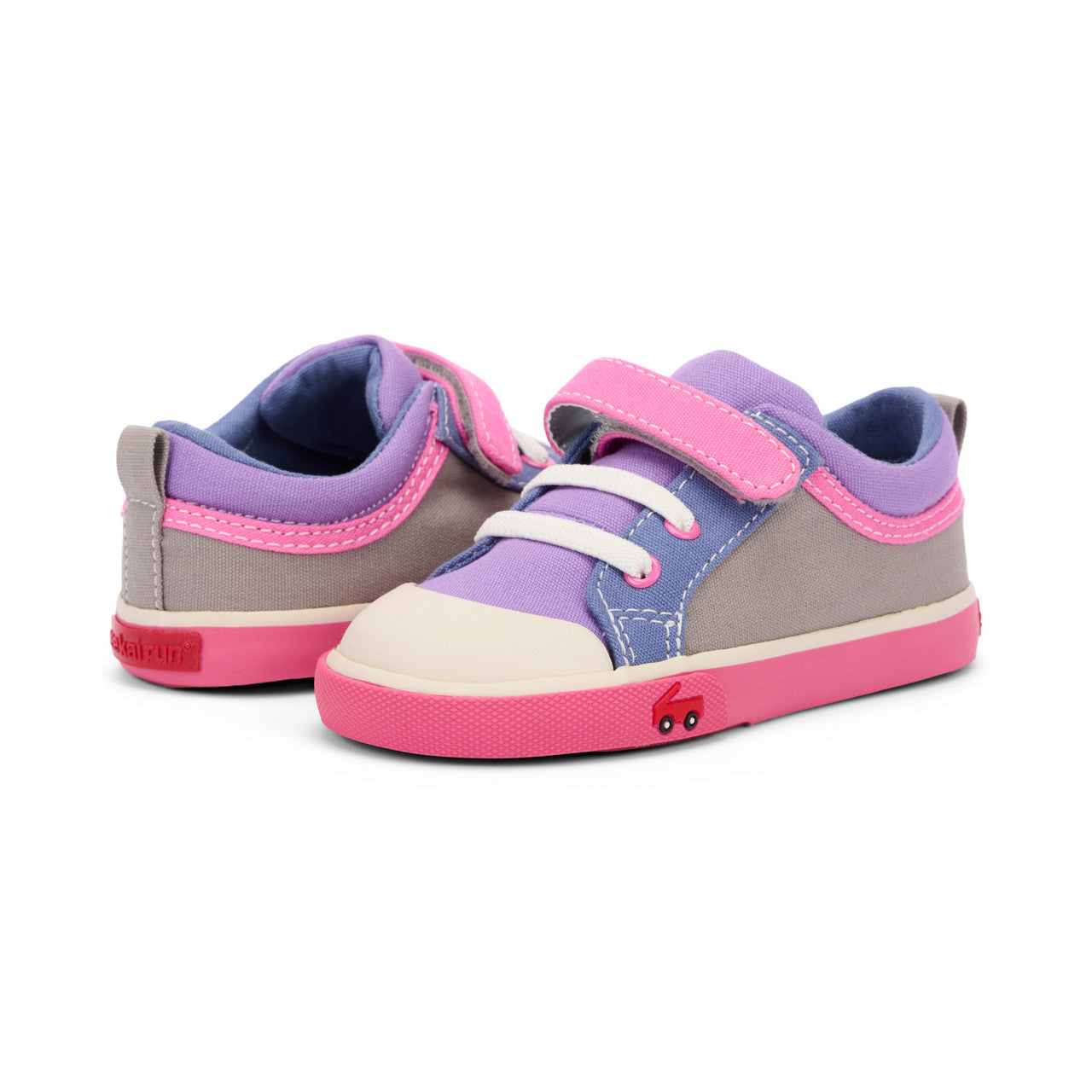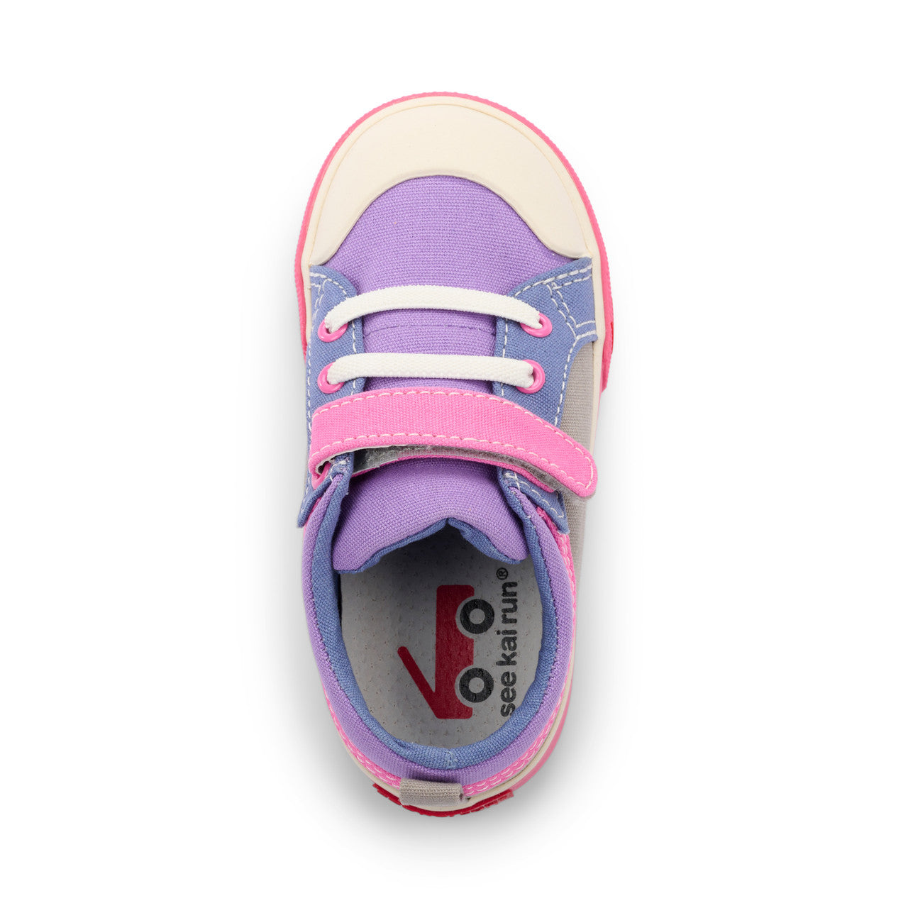 Check out this classic, fan-favorite sneaker for girls. The canvas upper features cheerful color blocks of blue, purple, and pink for enhanced style. The natural rubber toe cap protects toes during active play.