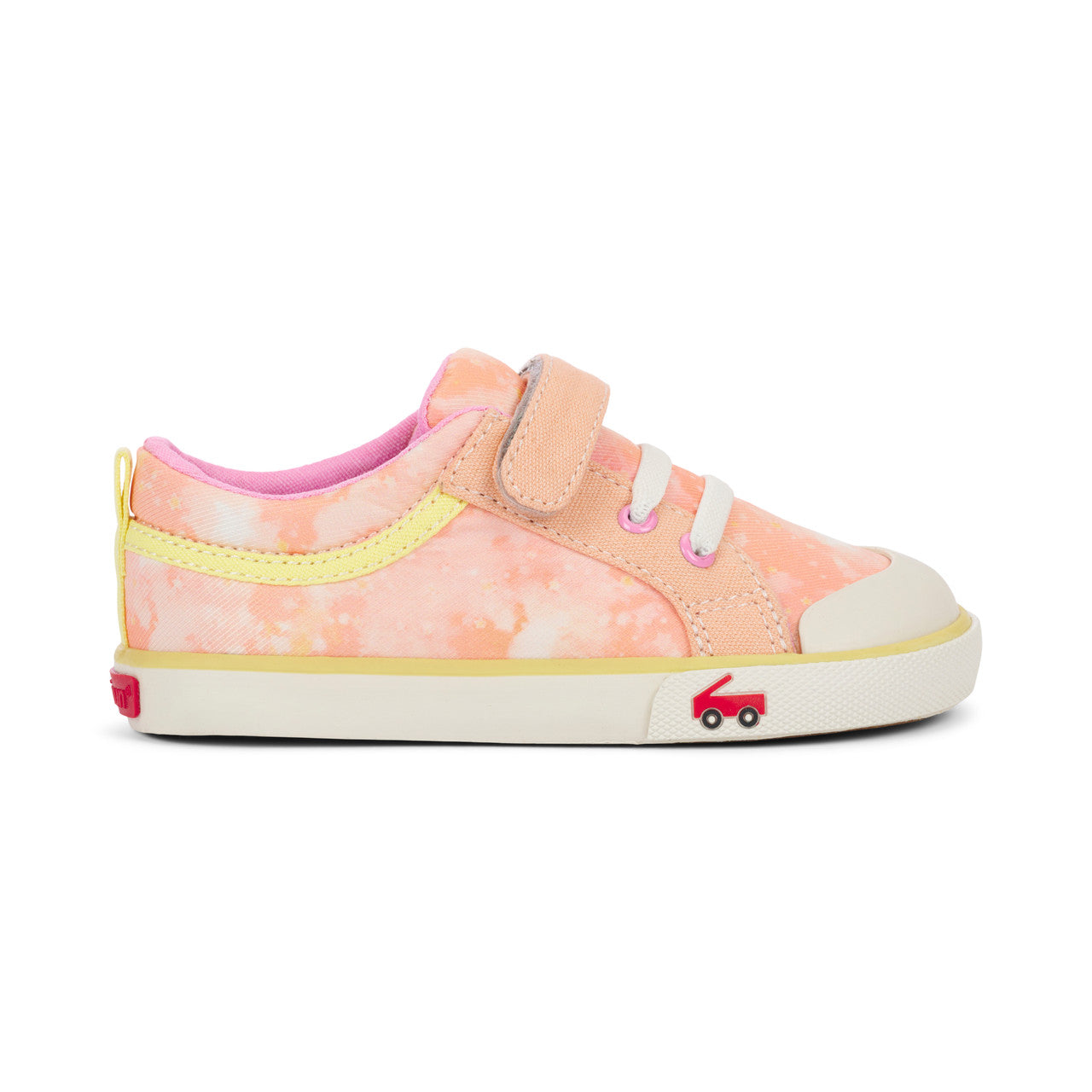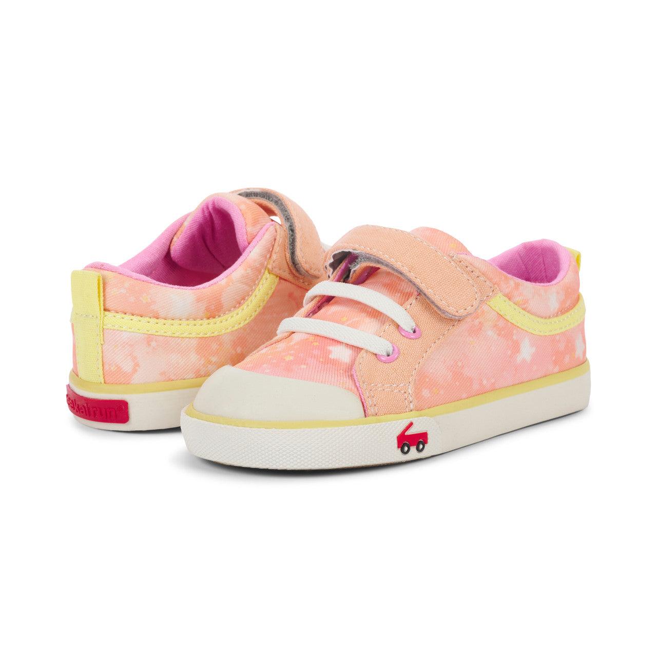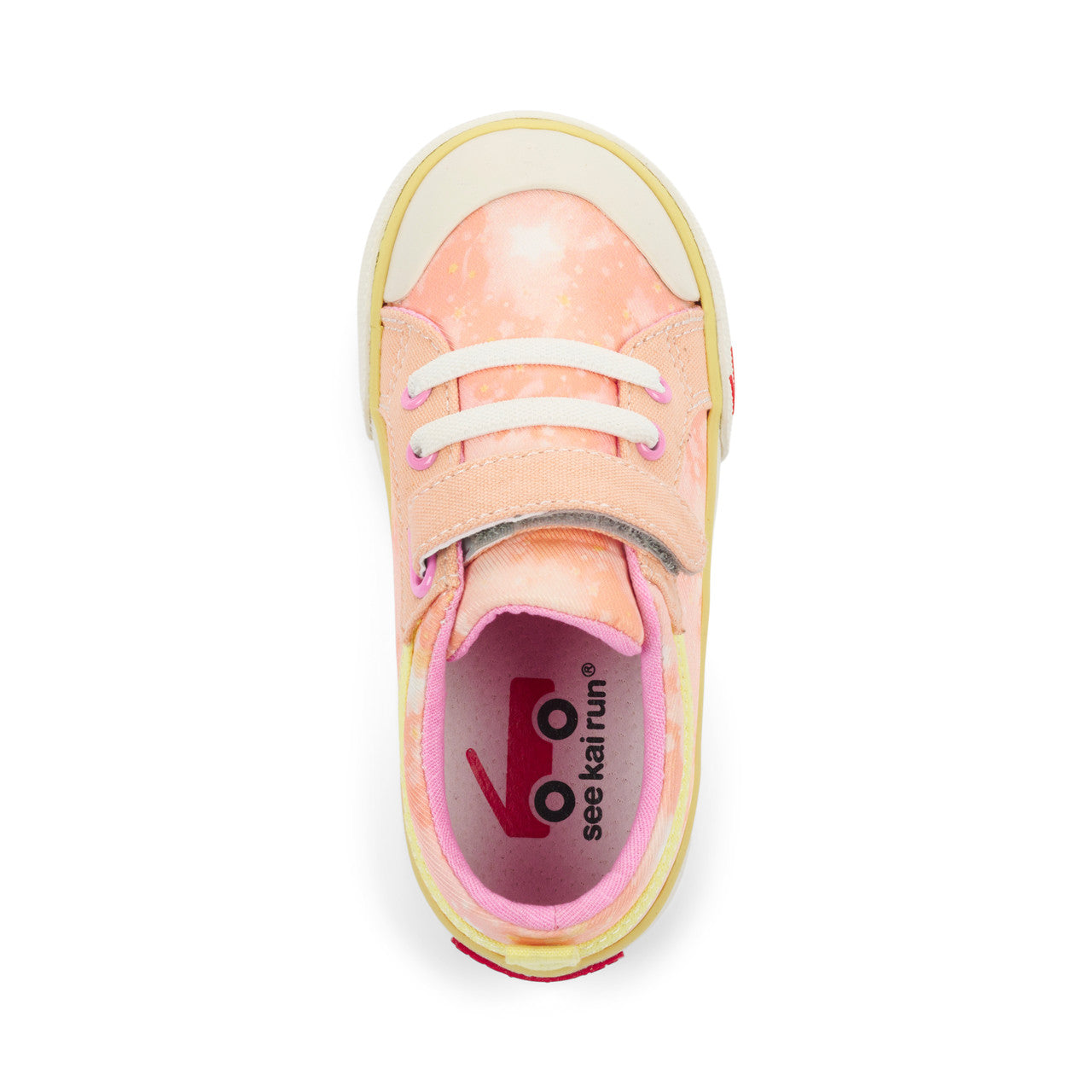 Get ready to twinkle with the Kristin Peach Stars! These sneakers feature a sweet peach star tie-dye upper, sunny yellow accents, and a natural rubber toe cap for extra protection. With a lightweight, flexible design and an easy on/stays on wide opening, your little one can shoot for the stars in comfort all day long.