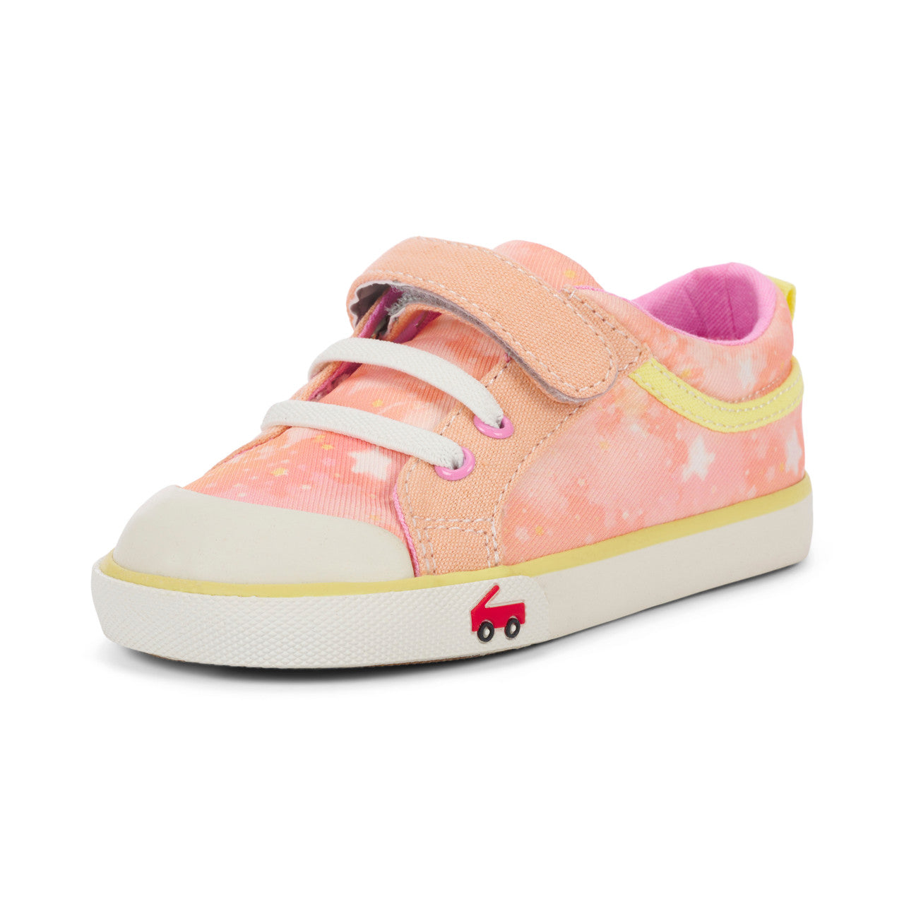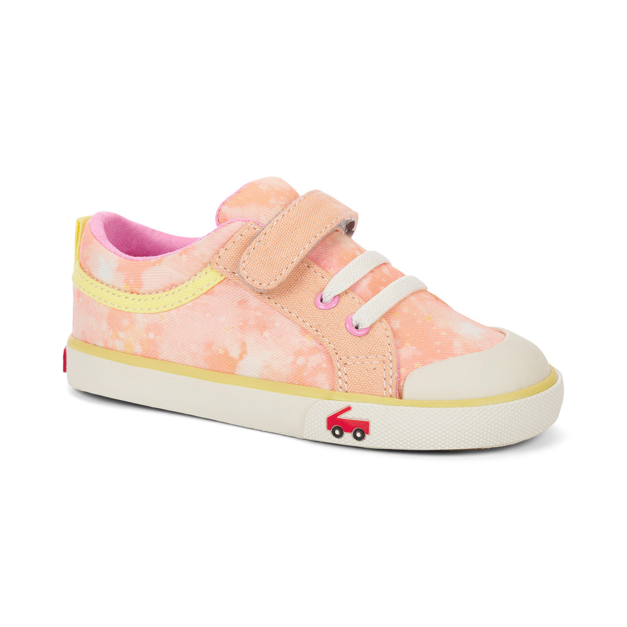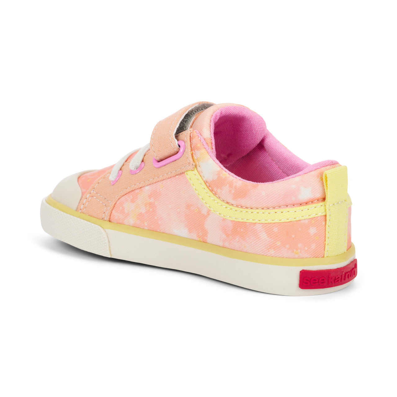 Get ready to twinkle with the Kristin Peach Stars! These sneakers feature a sweet peach star tie-dye upper, sunny yellow accents, and a natural rubber toe cap for extra protection. With a lightweight, flexible design and an easy on/stays on wide opening, your little one can shoot for the stars in comfort all day long.