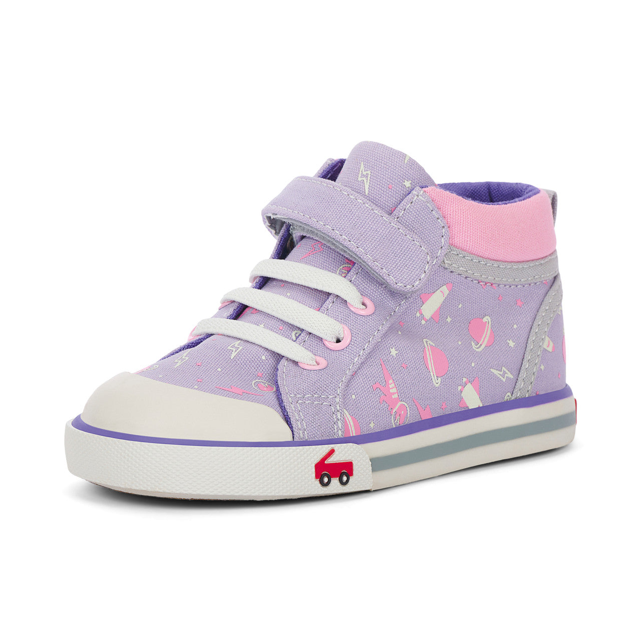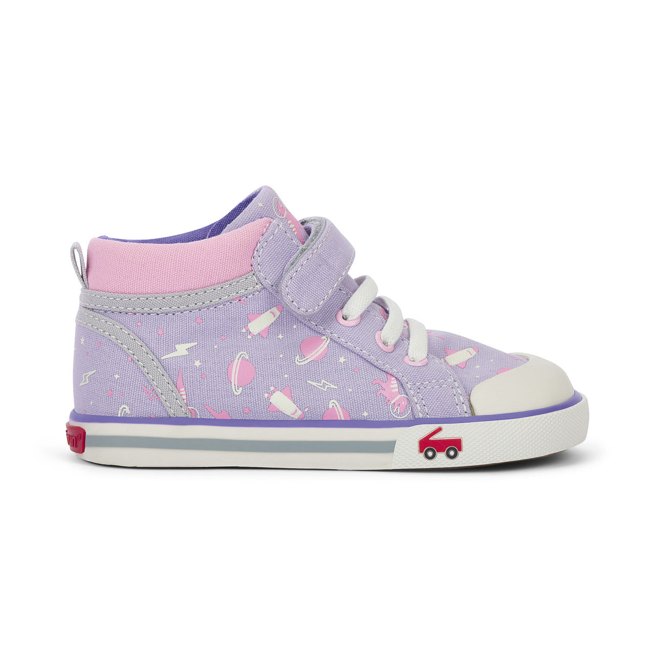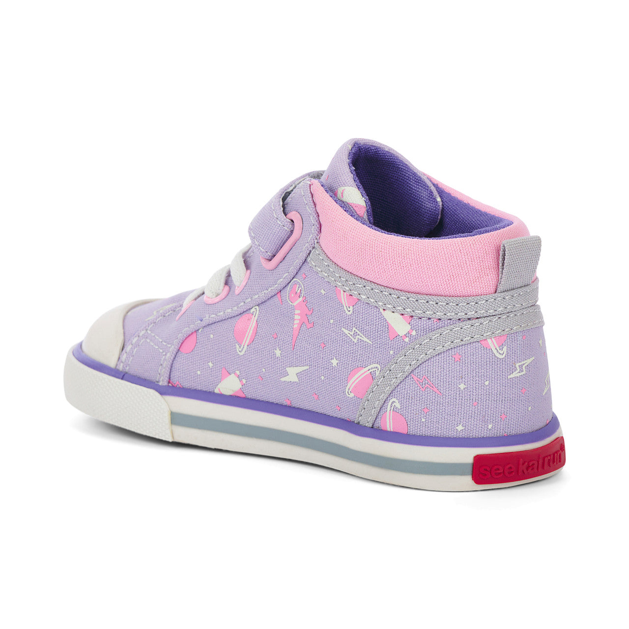 Her everyday style will be out of this world with our glow-in-the-dark Peyton high top, available only at seekairun.com. Comfortable and supportive for all-day play and finished with a futuristic space print, she’ll never want to leave home without it.