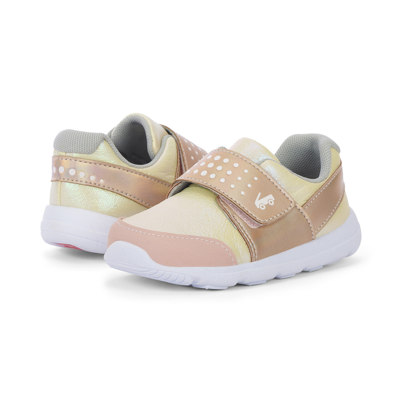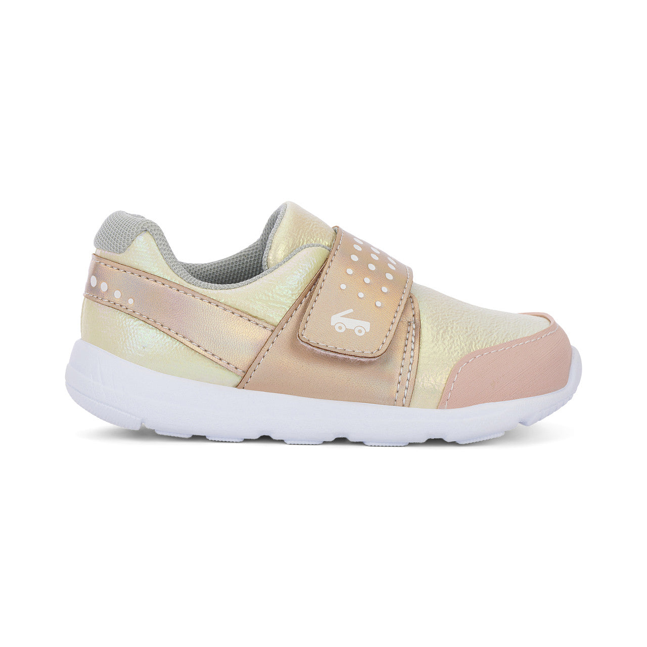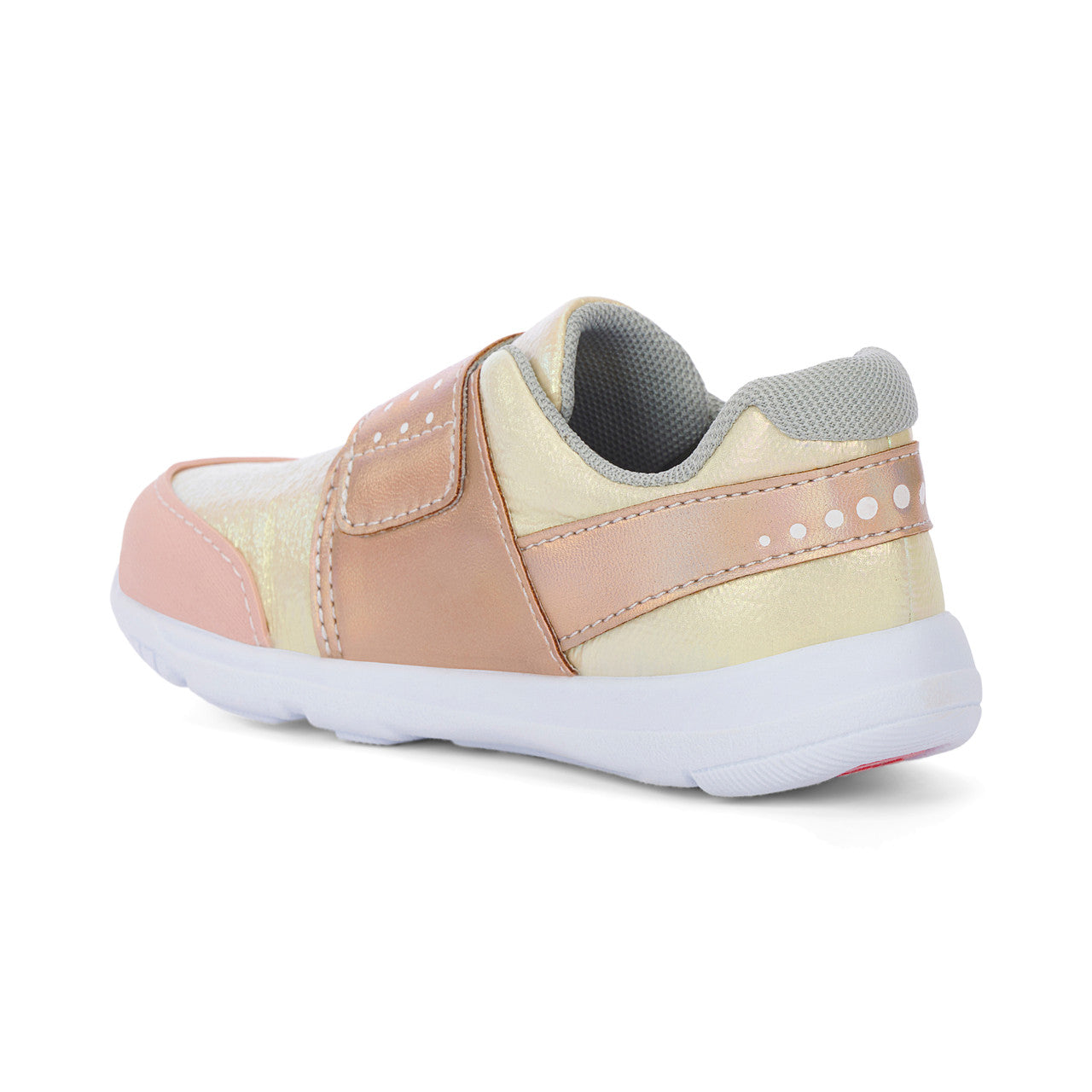 Gold nylon textile and iridescent faux-leather upper with rubber toe cap for protection.