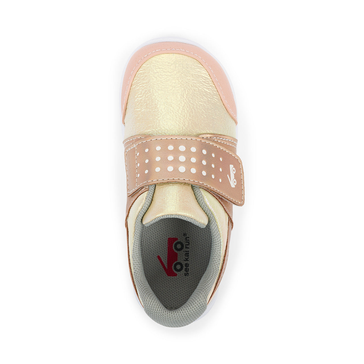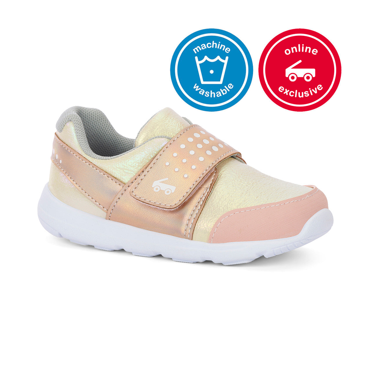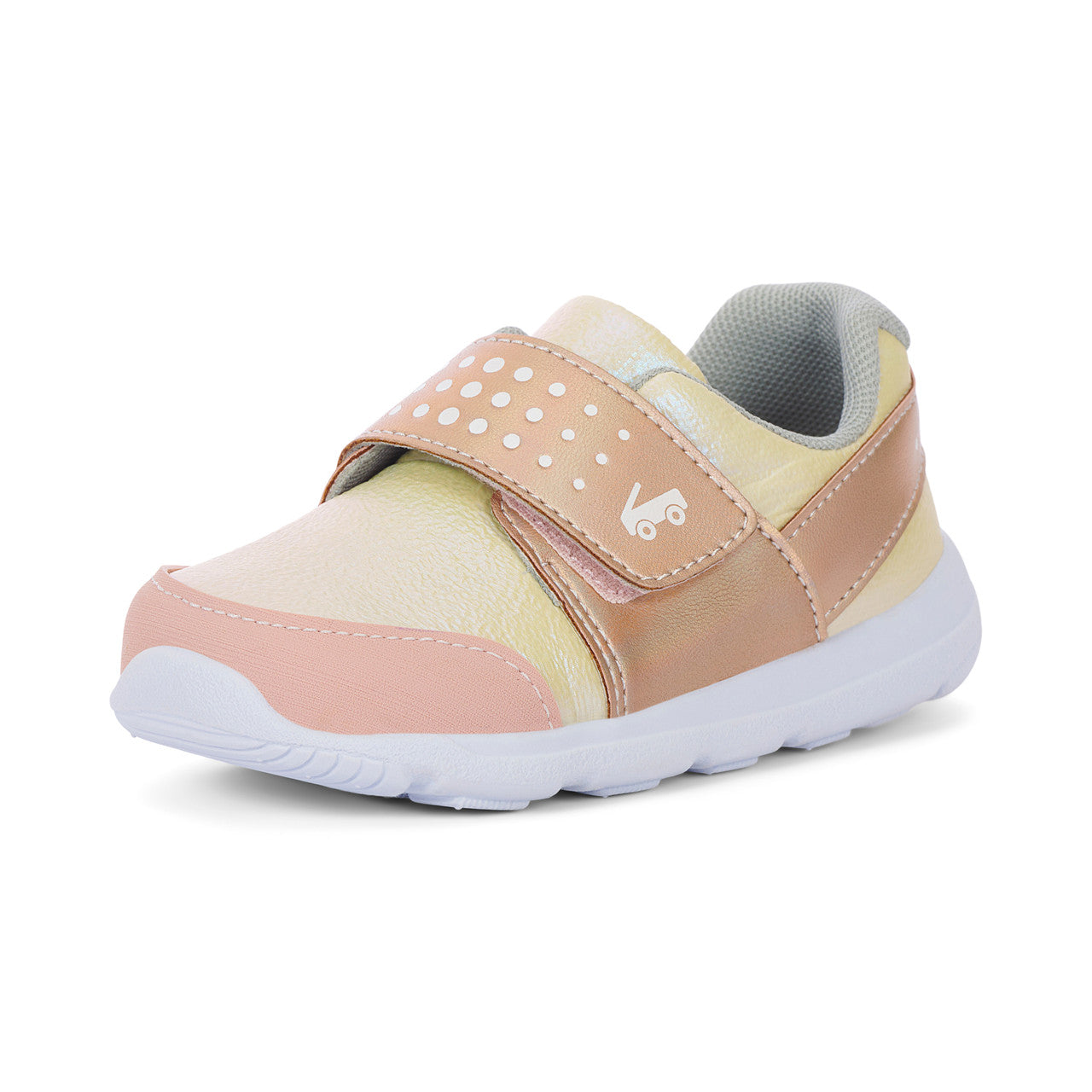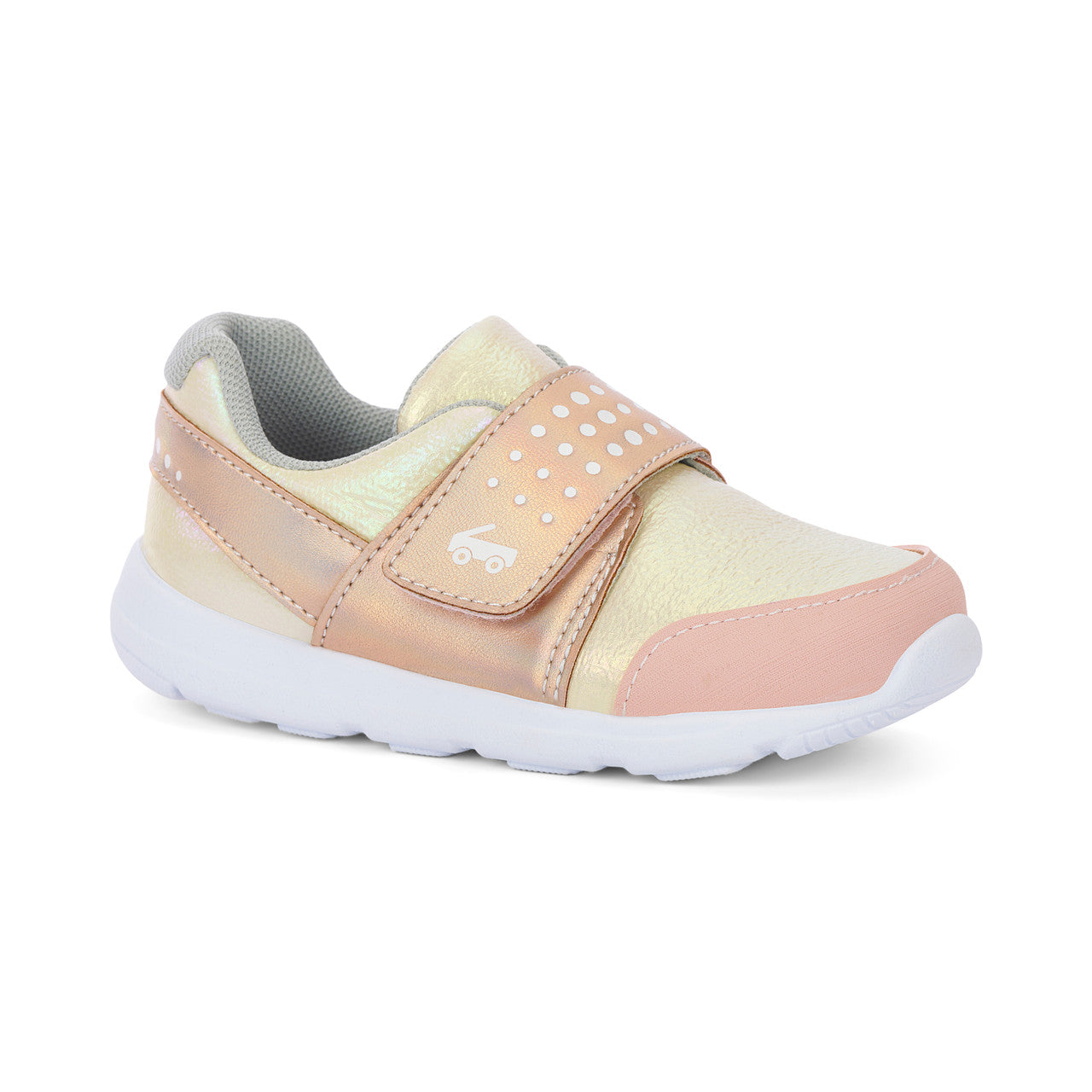 Gold nylon textile and iridescent faux-leather upper with rubber toe cap for protection.