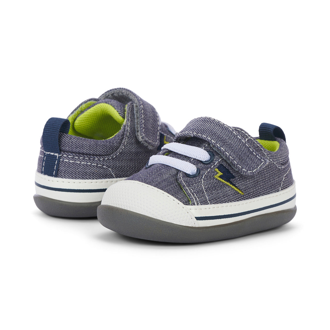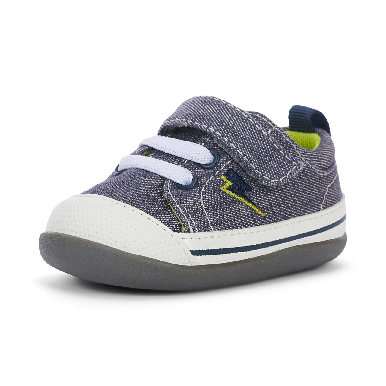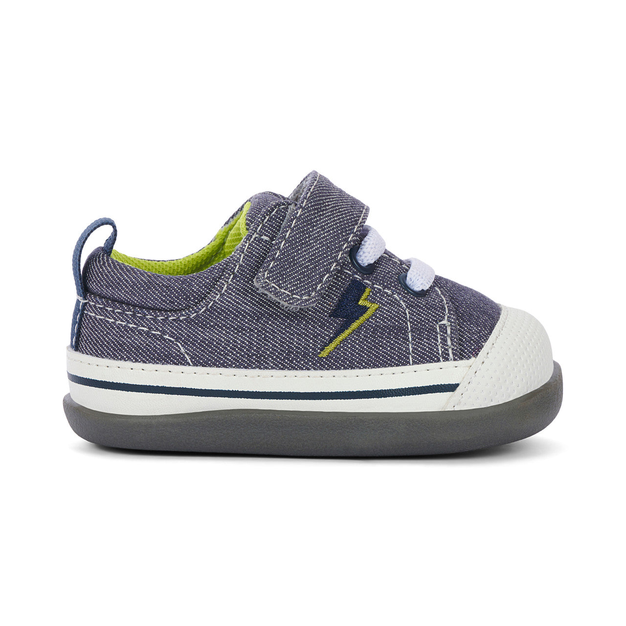 Gray denim upper with lightning embroidery and rubberized toe cap to protect little toes. Recycled mesh lining and sockliner keeps feet dry and fresh. Recycled TPR rubber outsole provides flexibility, traction, and durability for early steps. Adjustable hook-and-loop strap and faux elastic laces allow for a secure fit. Generous toe box provides room for healthy foot development. Awarded the Seal of Acceptance from the American Podiatric Medical Association (APMA). Vegan – made without any animal products.