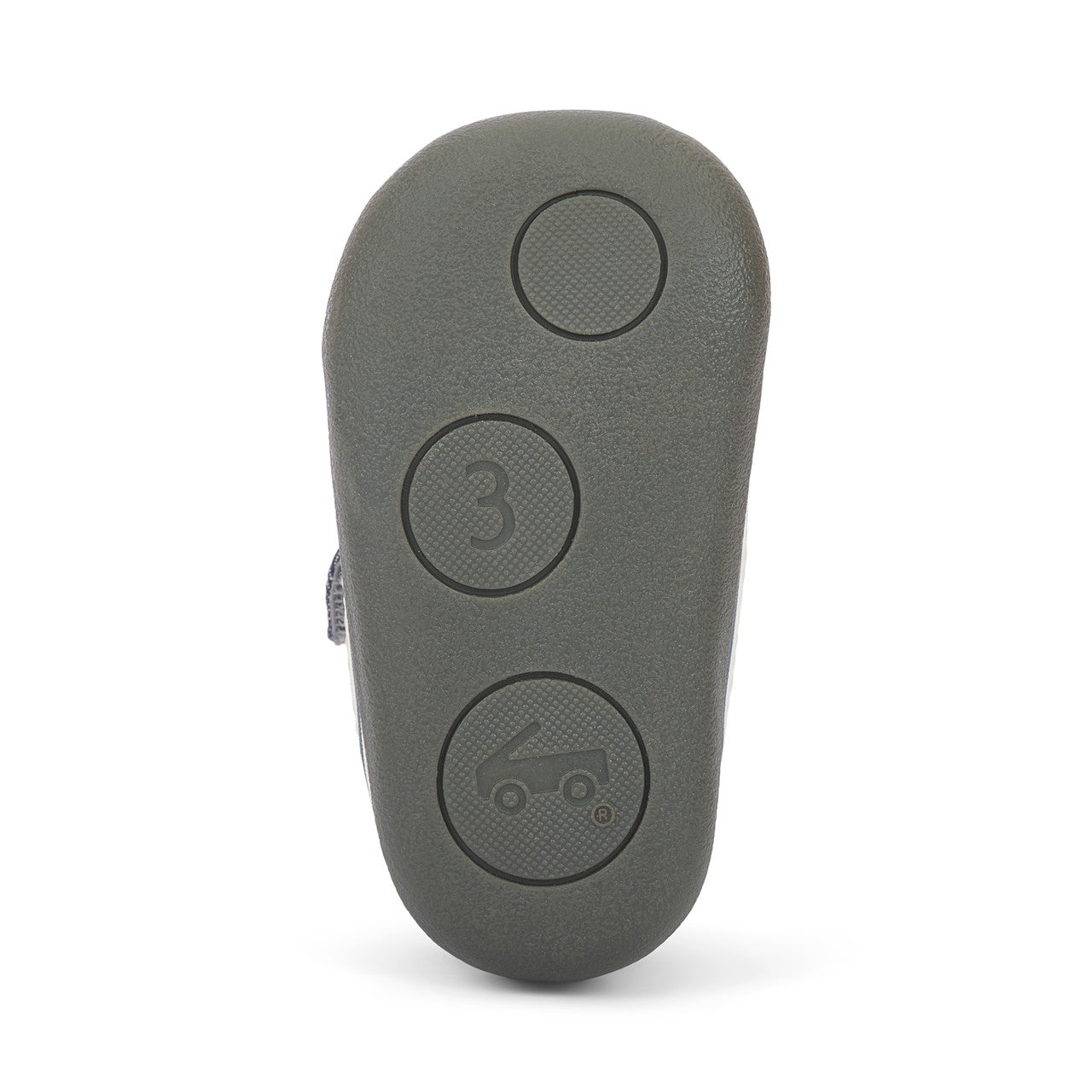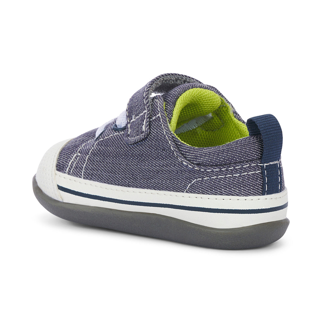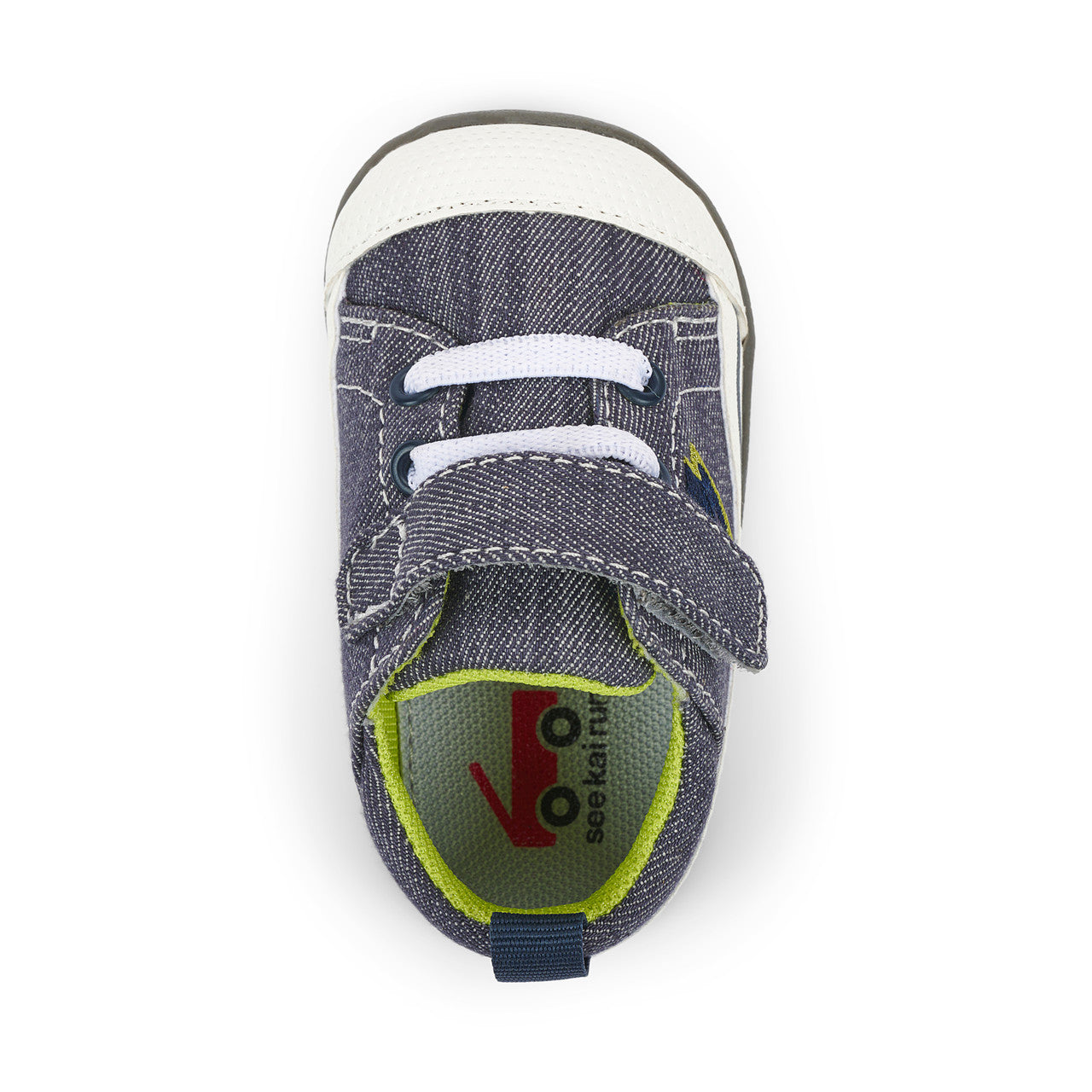 Gray denim upper with lightning embroidery and rubberized toe cap to protect little toes. Recycled mesh lining and sockliner keeps feet dry and fresh. Recycled TPR rubber outsole provides flexibility, traction, and durability for early steps. Adjustable hook-and-loop strap and faux elastic laces allow for a secure fit. Generous toe box provides room for healthy foot development. Awarded the Seal of Acceptance from the American Podiatric Medical Association (APMA). Vegan – made without any animal products.