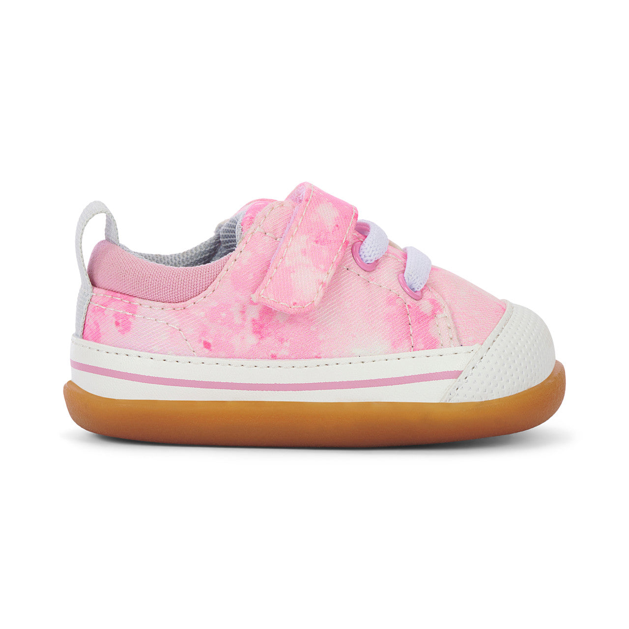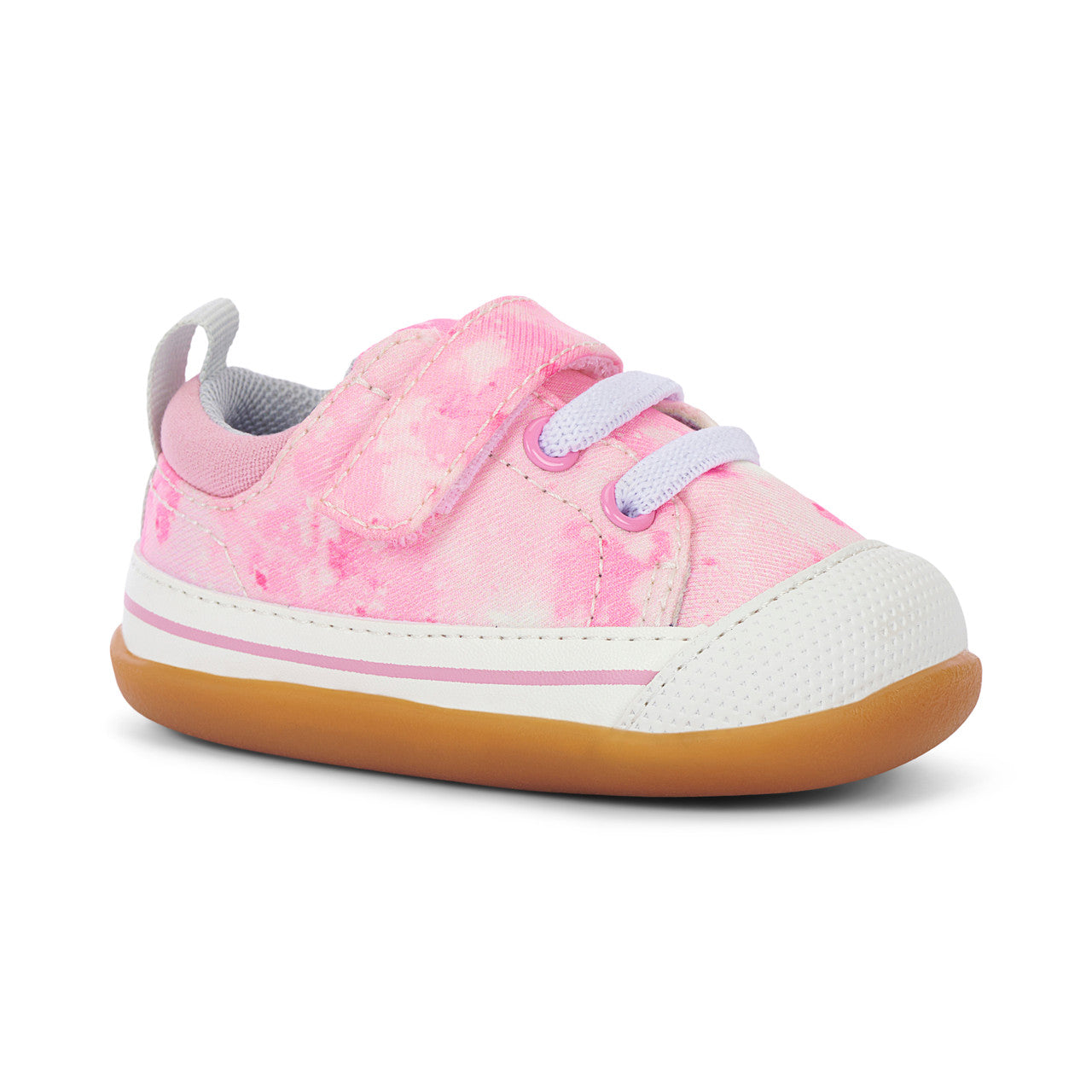 Soft pink star textile and canvas upper with rubberized toe cap to protect little toes. Recycled mesh lining and sockliner keeps feet dry and fresh. Recycled TPR rubber outsole provides flexibility, traction, and durability for early steps. Adjustable hook-and-loop strap and faux elastic laces allow for a secure fit. Generous toe box provides room for healthy foot development. Awarded the Seal of Acceptance from the American Podiatric Medical Association (APMA). Vegan – made without any animal products.