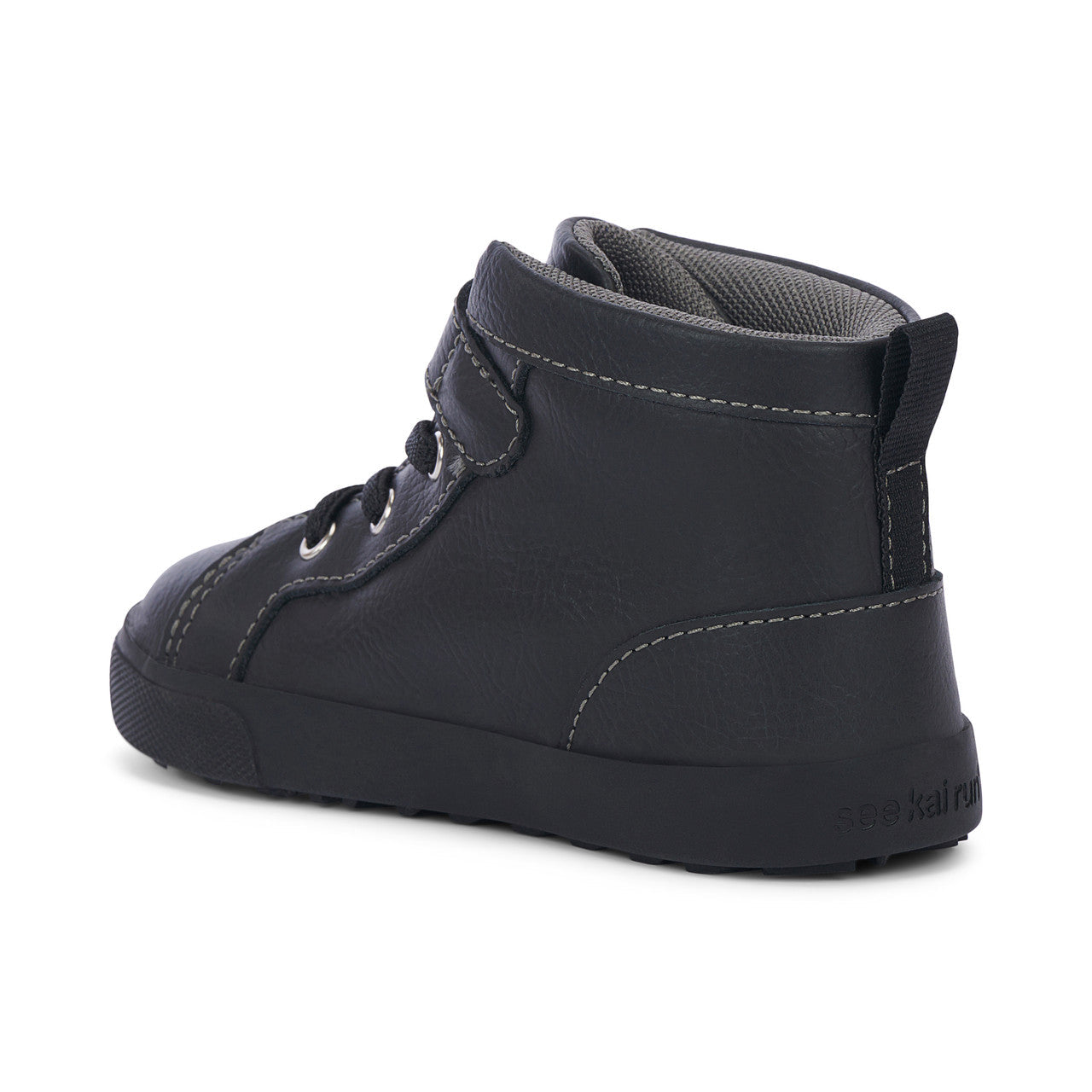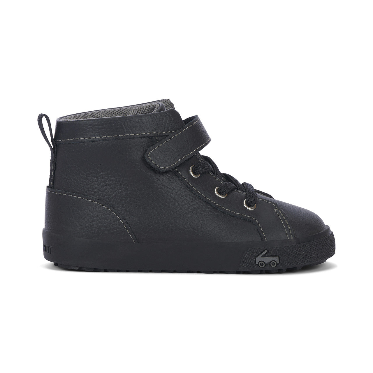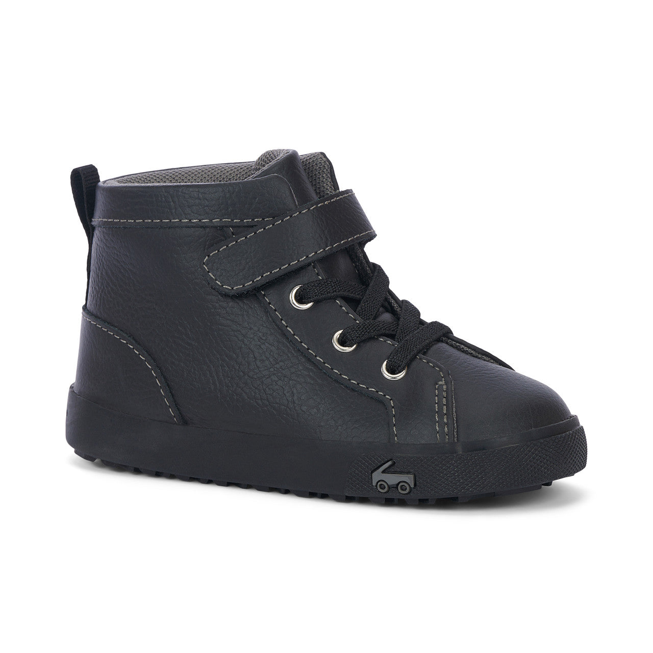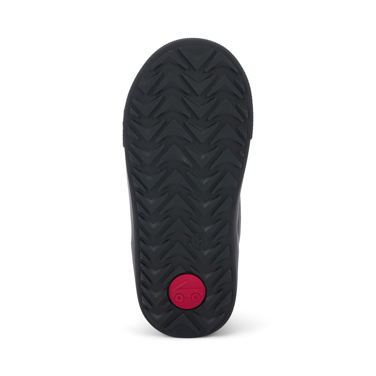 Black leather upper. Breathable recycled mesh lining and removable, leather-lined footbed is contoured for all-day comfort. Natural rubber outsole with deep lug pattern provides great traction for play. Hook-and-loop strap and faux elastic laces allow for secure fit and custom adjustability. Classic SKR fit gives feet room to move and grow.
