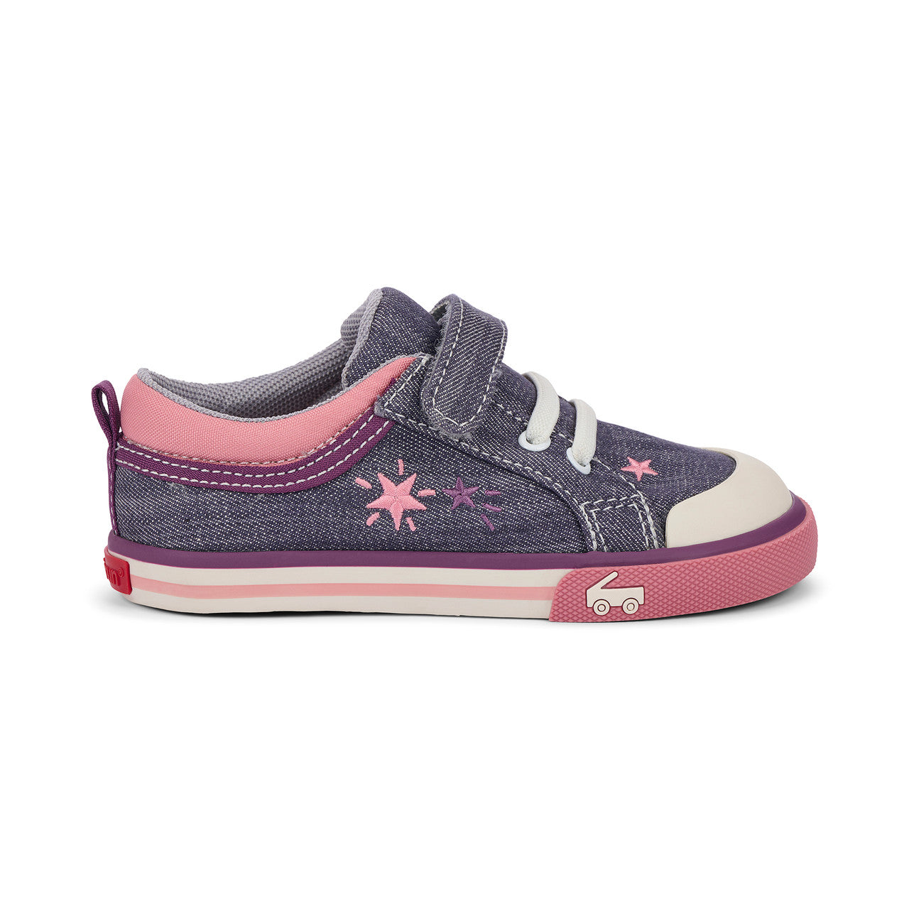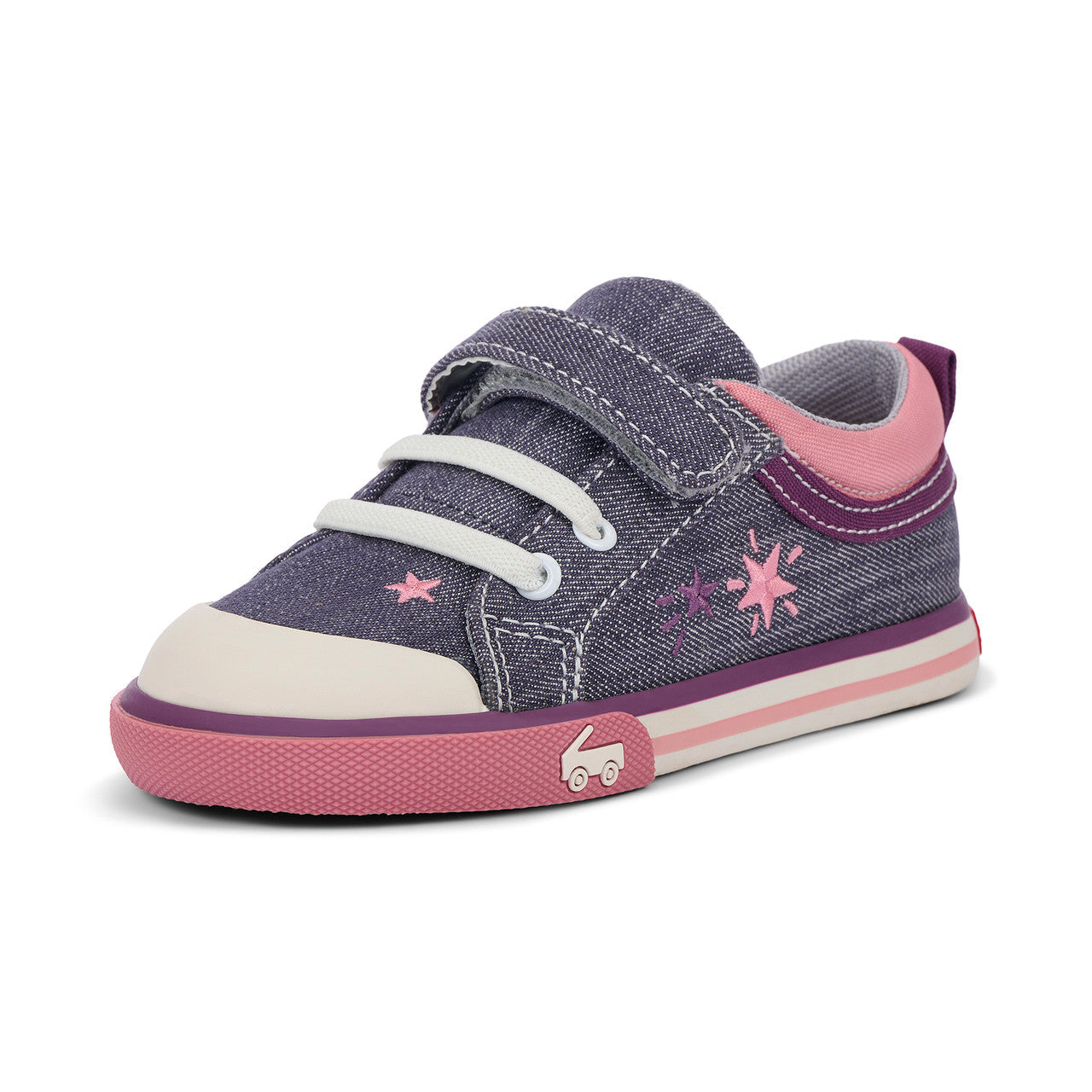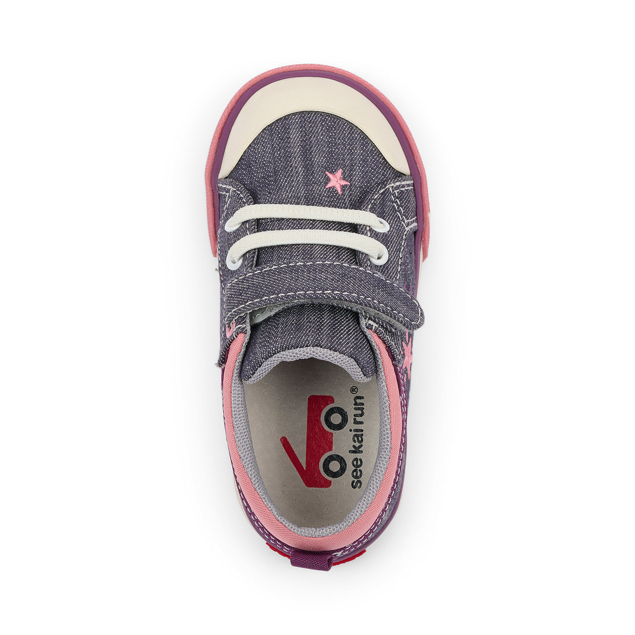 Unleash her inner star power with our classic Kristin sneaker, featuring embroidered pink and purple shooting stars on a gray denim upper. Consciously designed to be lightweight and comfortable for all-day play with durability and protection where she needs it the most; it’s the ultimate go-to shoe.