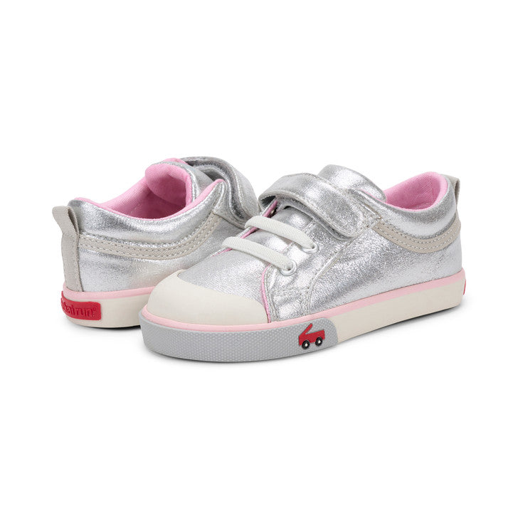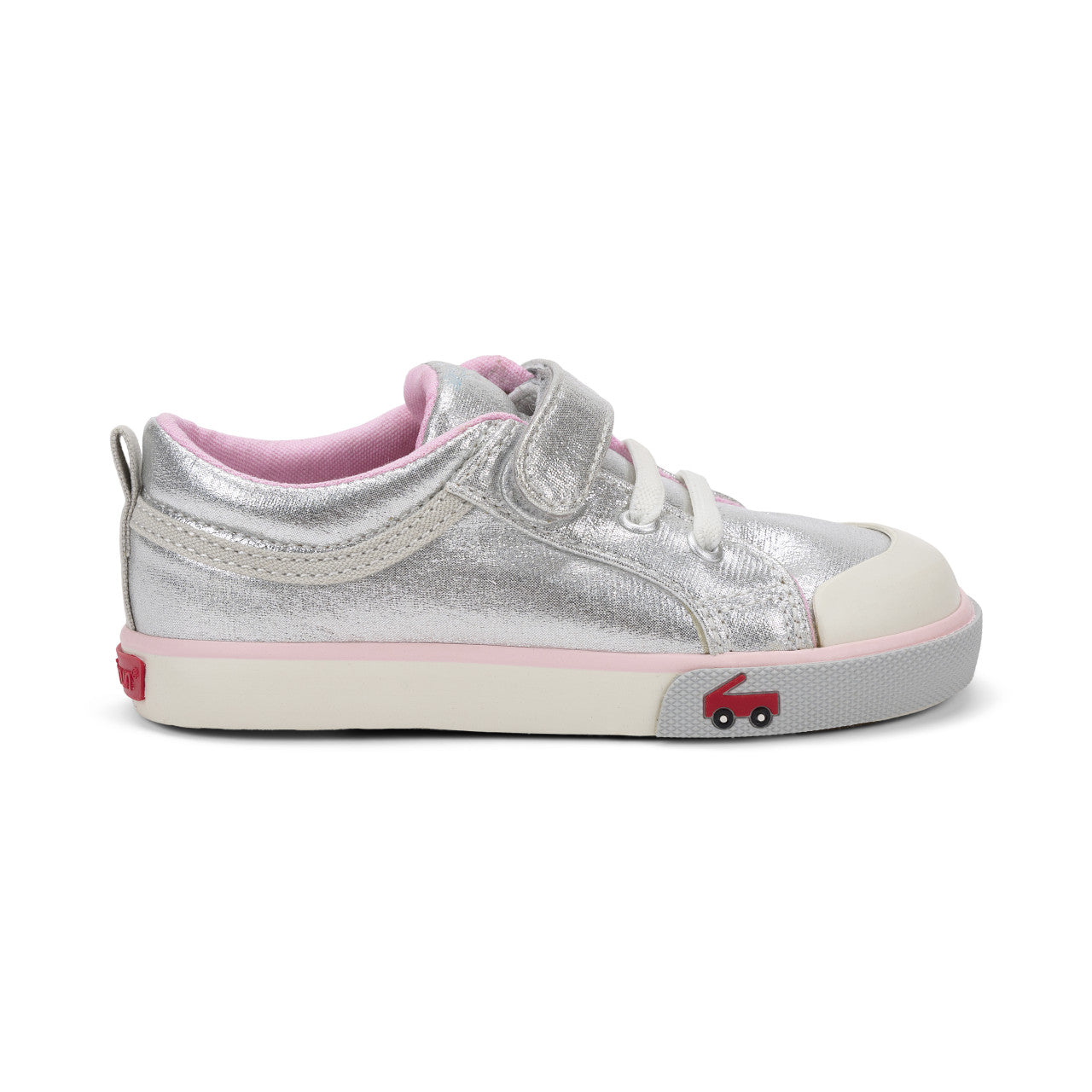 Description We’ve given this classic, fan-favorite sneaker a colorful seasonal update of silver shimmer with pink accents. The faux laces and an adjustable hook-and-loop strap make on/off effortless, leaving more time on the playground.