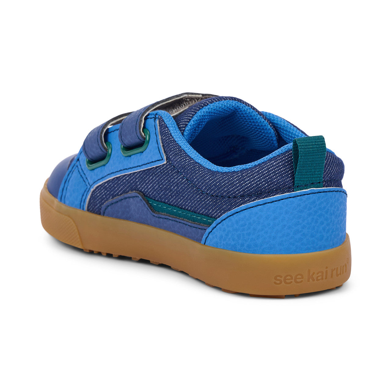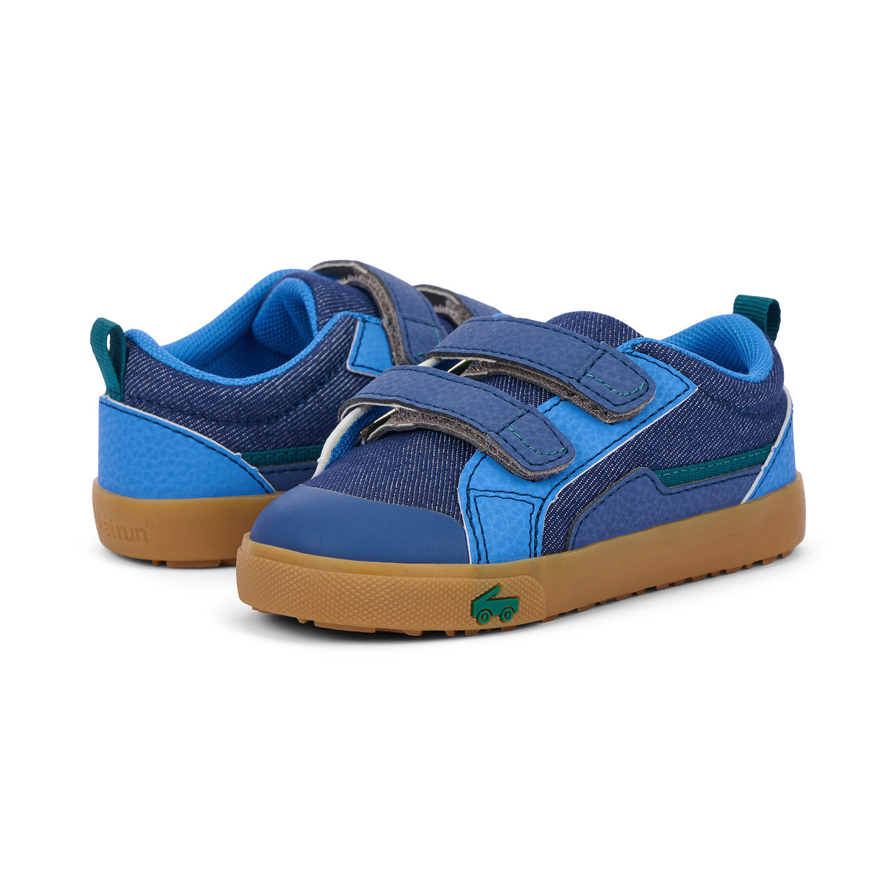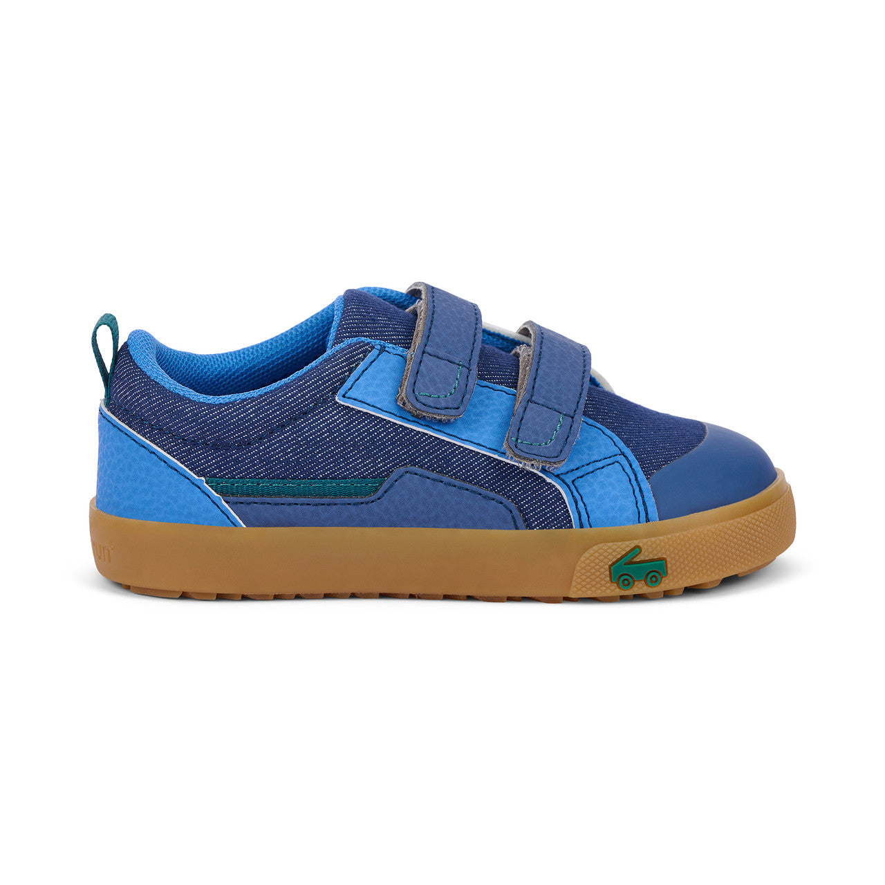 Cotton denim upper with nubuck-feel overlays and TPU toe cap for protection. Breathable, recycled mesh lining and removable, leather-lined footbed is contoured for all-day comfort. Natural rubber outsole with herringbone lug pattern provides great traction for play. Double reverse hook-and-loop straps allow for a secure fit and custom adjustability. Generous toe box provides room for healthy foot development. Care Instructions: Spot clean using a mild detergent and damp cloth. Allow to air dry.