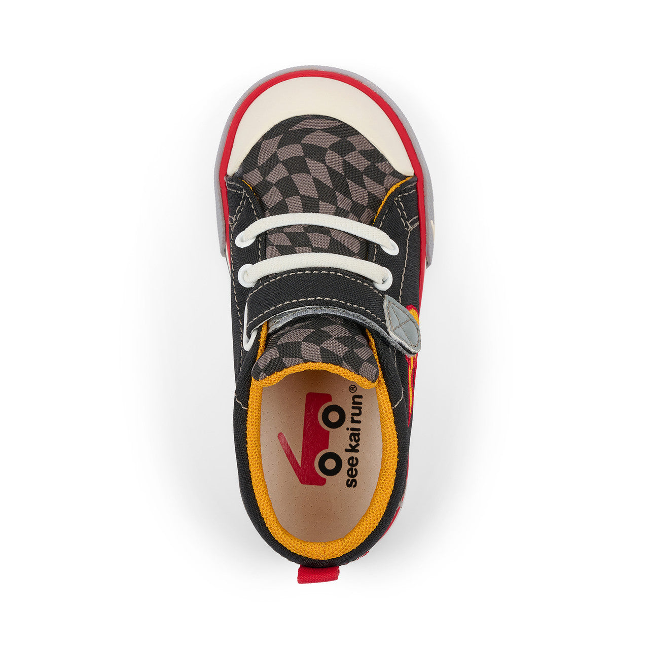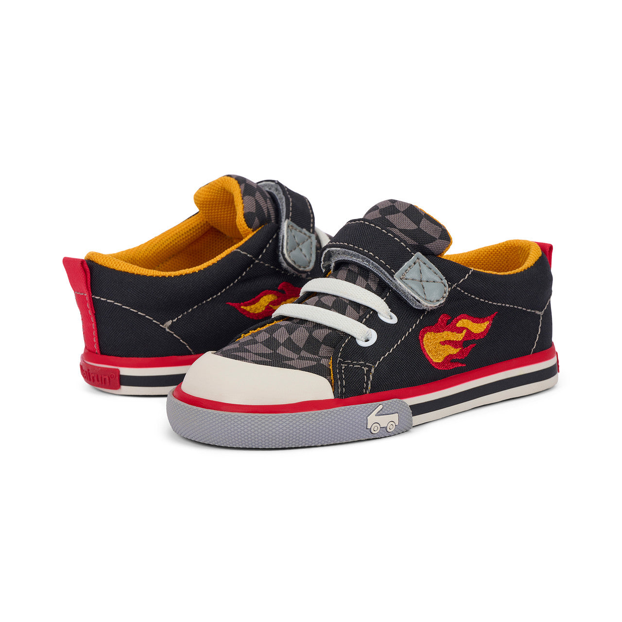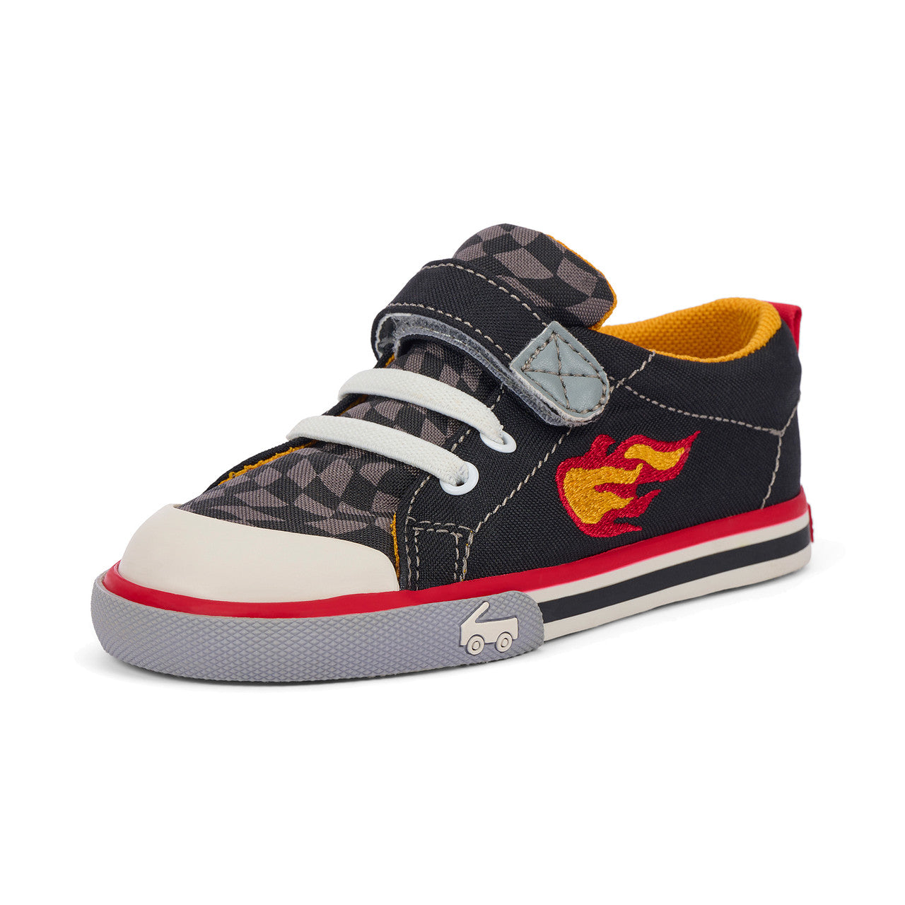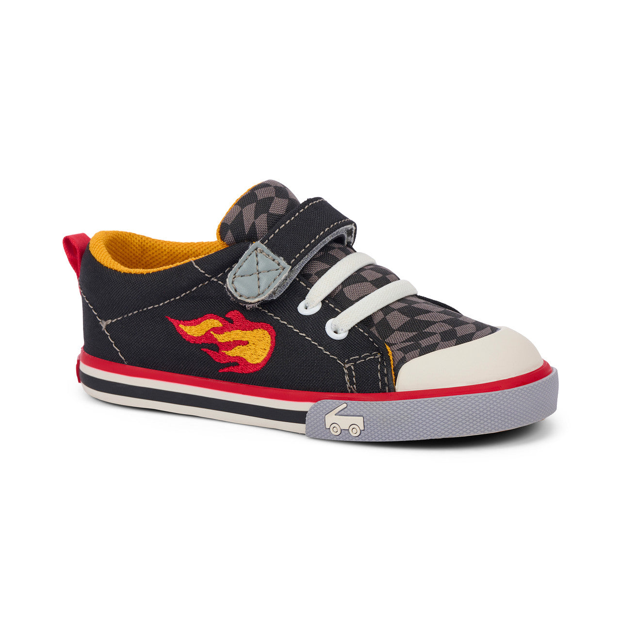 Feel the need for speed? Get fired up with our flexible, protective, and oh-so comfy Stevie sneaker. Designed with a cool flame embroidery and checkered pattern, plus a contoured footbed that feels like it was made just for their feet, this pair is ready to bring the fun.