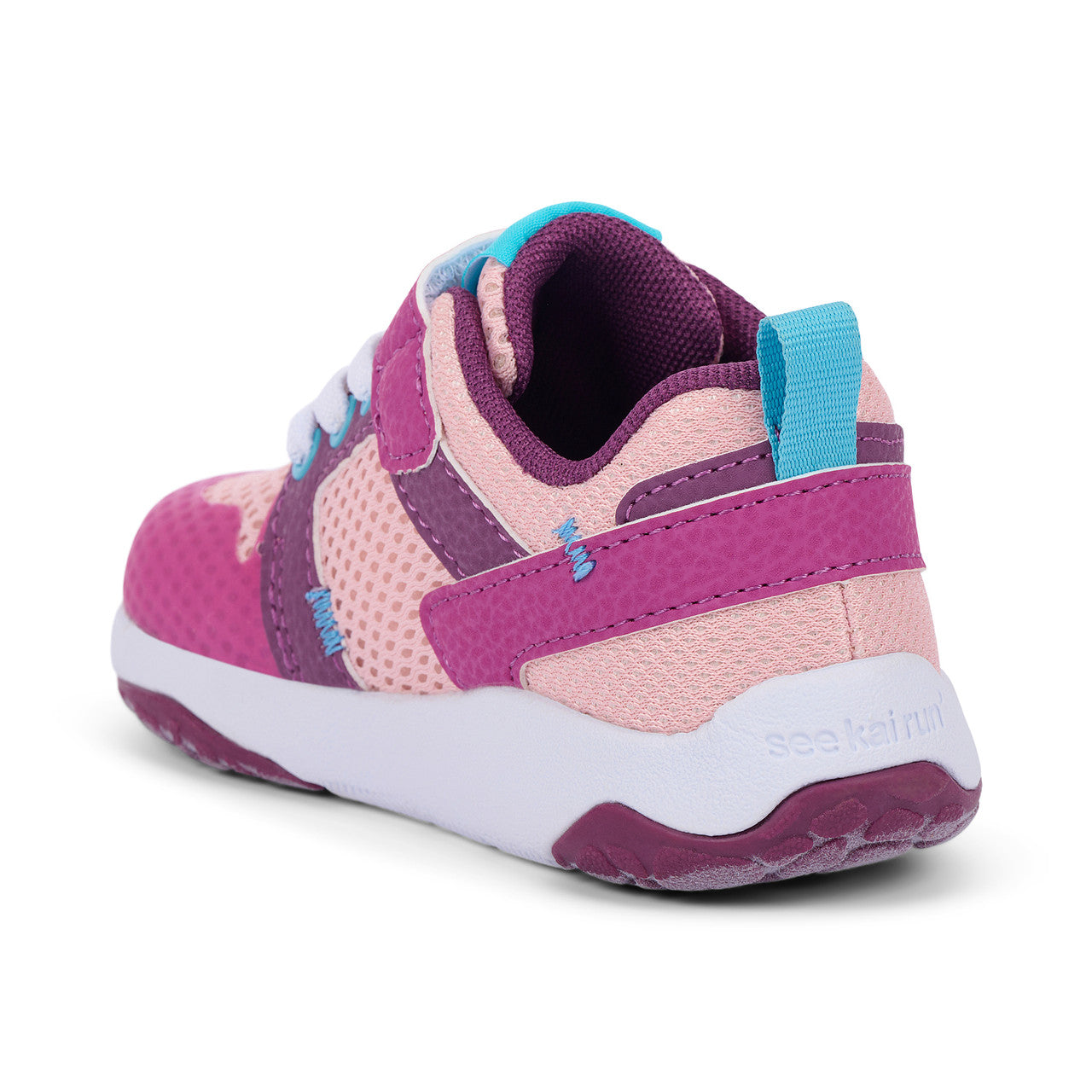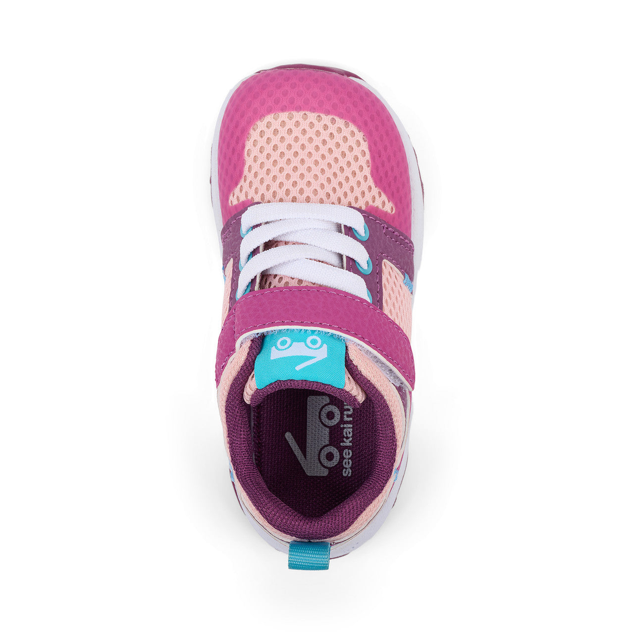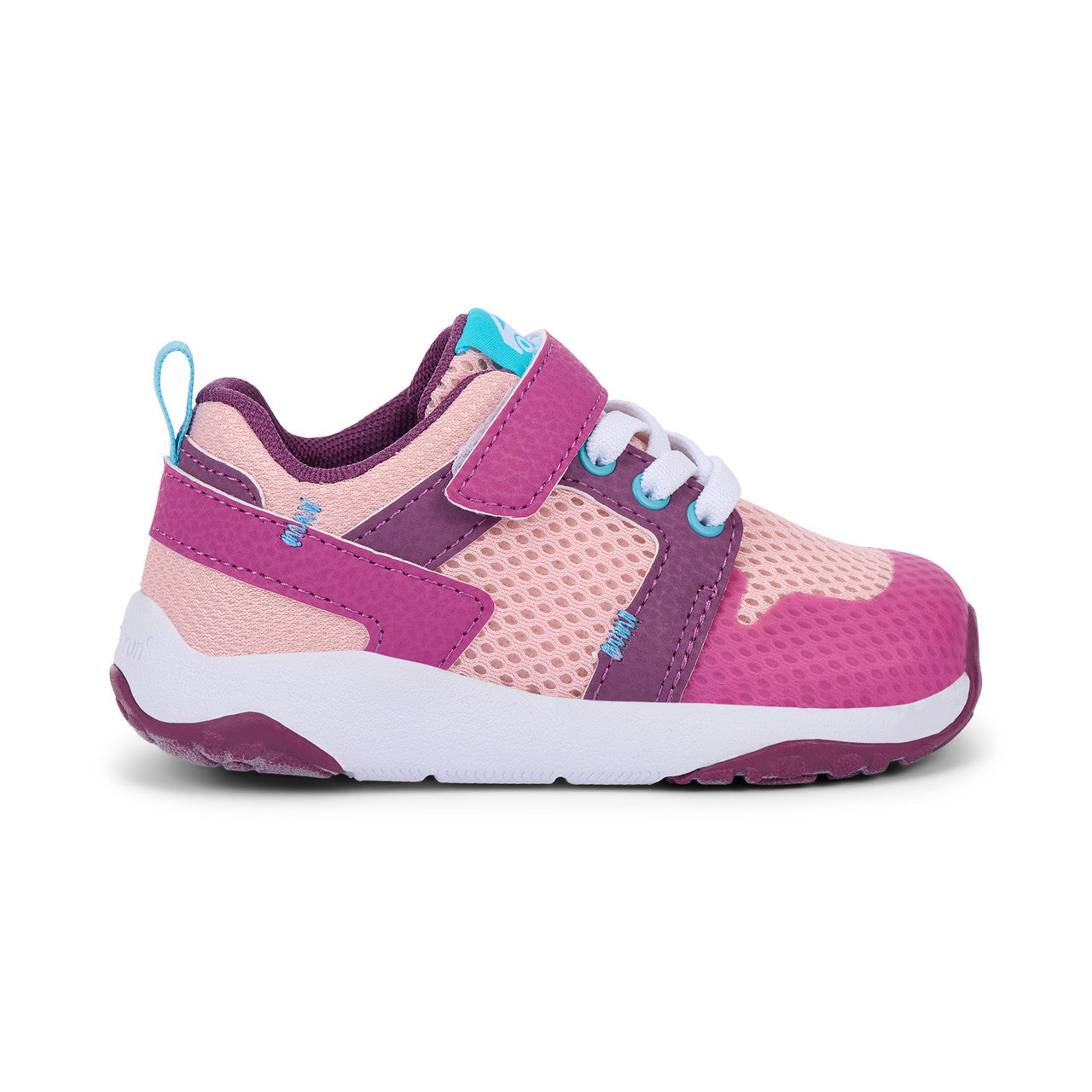 Pink mesh textile upper with nubuck-feel overlays and TPU toe cap for protection. Recycled mesh lining and EVA sockliner allows air movement for breathable comfort. Lightweight, cushioned FlexiRun outsole featuring EVA foam midsole and TR rubber traction inlays for excellent grip Adjustable hook-and-loop strap and faux elastic laces allow for a secure fit. Generous toe box provides room for healthy foot development. Vegan – made without any animal products. Care Instructions: Machine wash cold on gentle cycle with mild detergent. Do not bleach. Air dry.