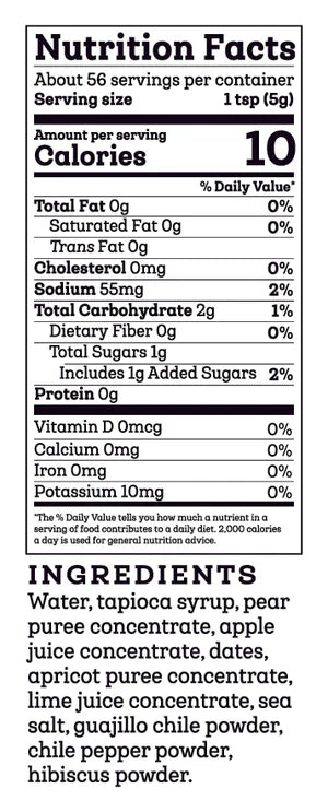 Water, tapioca syrup, pear puree concentrate, apple juice concentrate, dates, apricot puree concentrate, lime juice concentrate, sea salt, guajillo chile powder, chile pepper powder, hibiscus powder.