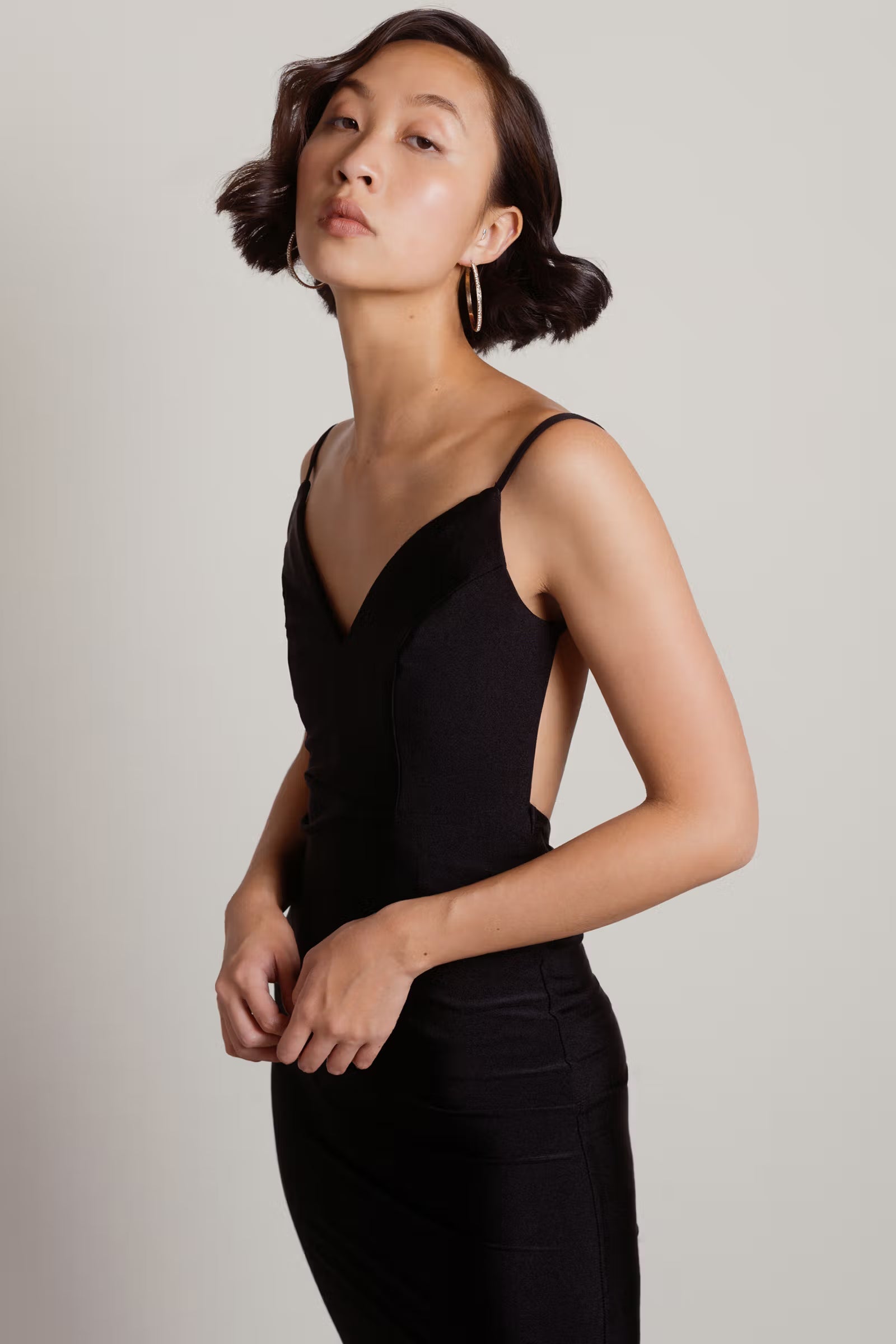 Get an ethereal look with the Ariella Black Satin Bodycon Mermaid Dress. This maxi formal dress features an adjustable straps, ruched bottom back detail, and an open back. Pair with a sleek clutch and statement earrings to create the perfect wedding guest dress or prom dress outfit.
