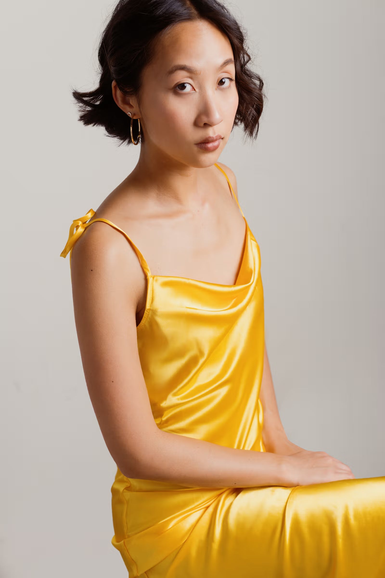 Get ready to charm them all in the Charm Me Satin Cowl Neck Midi Dress in color_name! This stunning satin cowl neck dress features adjustable tie straps and ruched detailing on the sides, ensuring the perfect fit and flattering silhouette. The midi length is ideal for any occasion, whether it’s a romantic dinner or a wedding guest appearance. Complete your look with strappy heels or square toe sandals, and let your style shine!