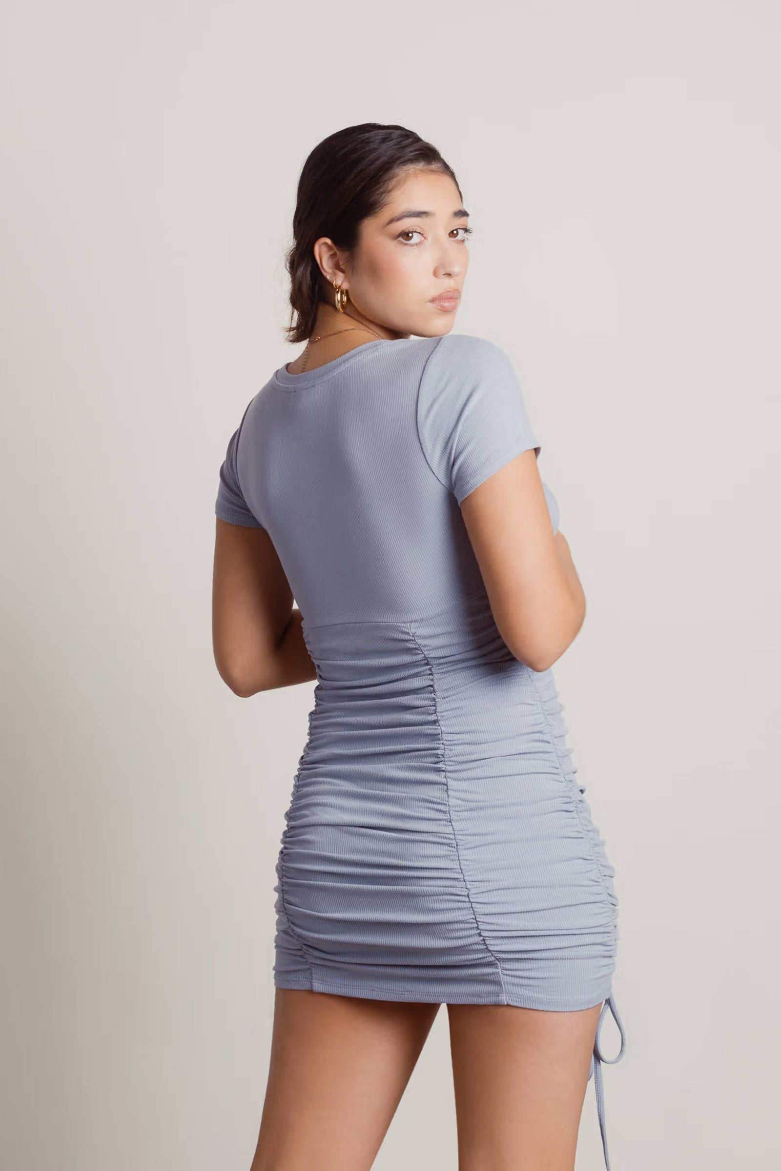 Throw the Kareena Dusty Blue Double Ruched Bodycon Mini Dress for nights out at the club. This bodycon dress features stretchy ruched material and short sleeves. Complete the look with heels for a chic outfit to wear for festivals or girls night out.
